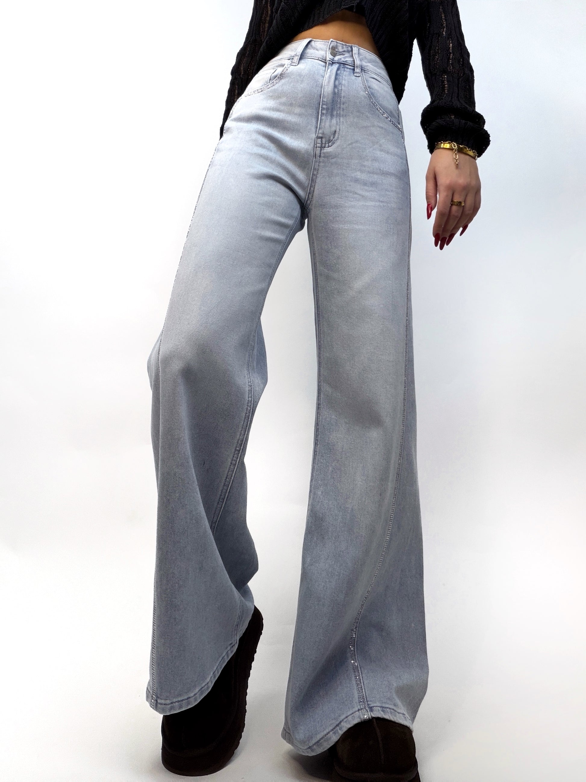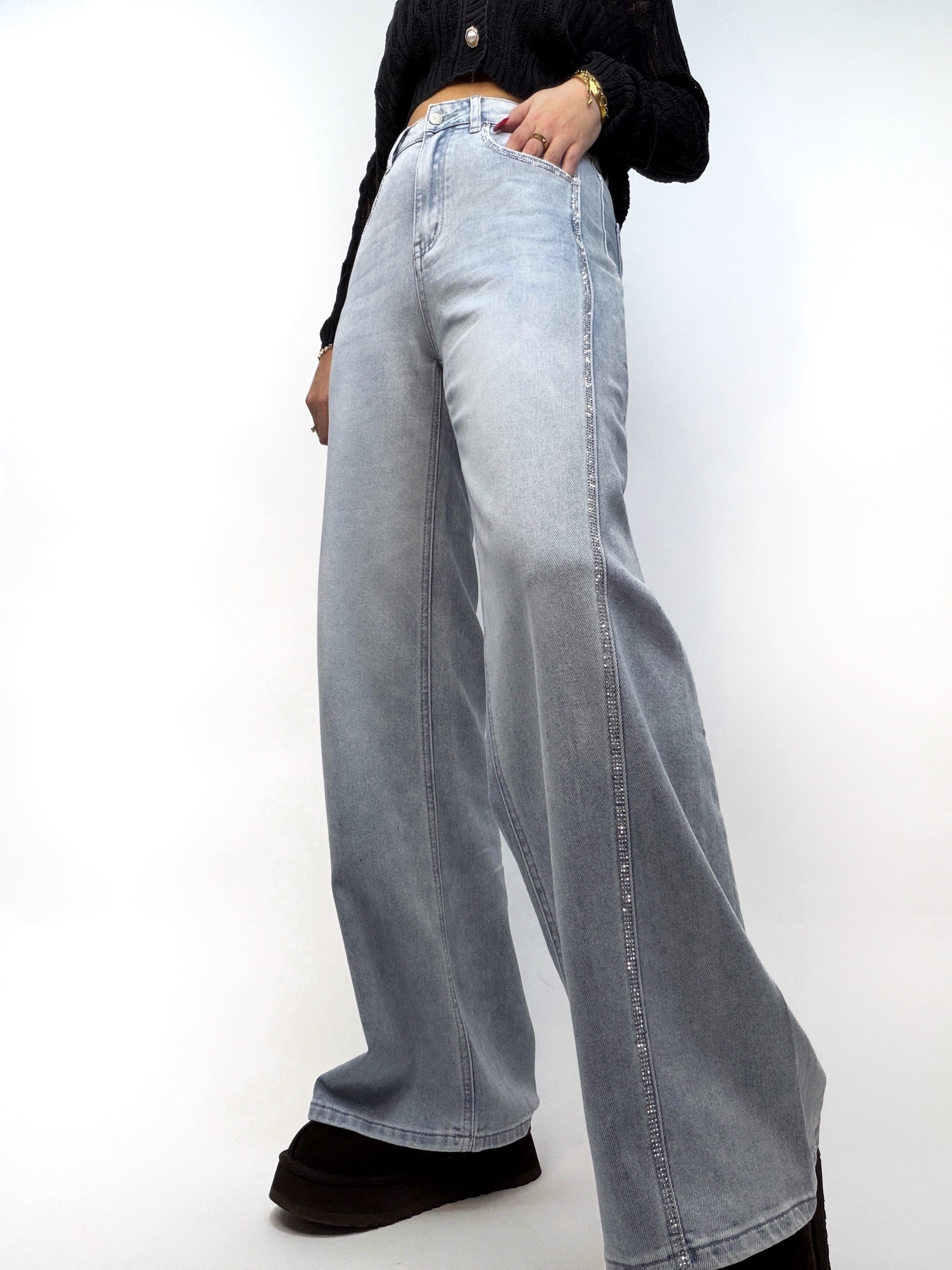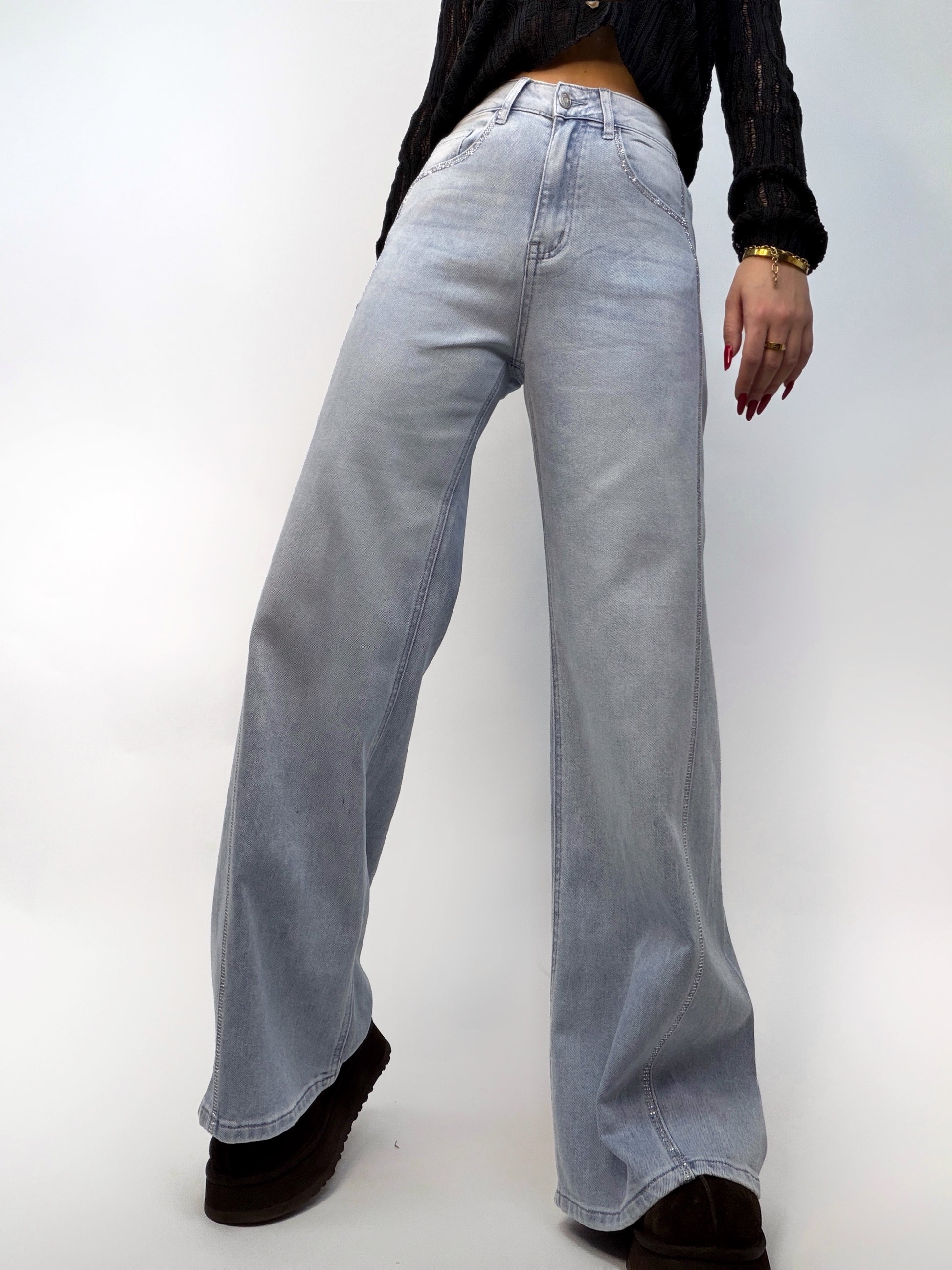 Blugi cu talie înaltă și croi larg, care combină confortul cu un strop de strălucire. Sunt accesorizați o încadrare de ștrasuri care atrag privirile, transformând piesa într-un element statement și sofisticat al ținutei.