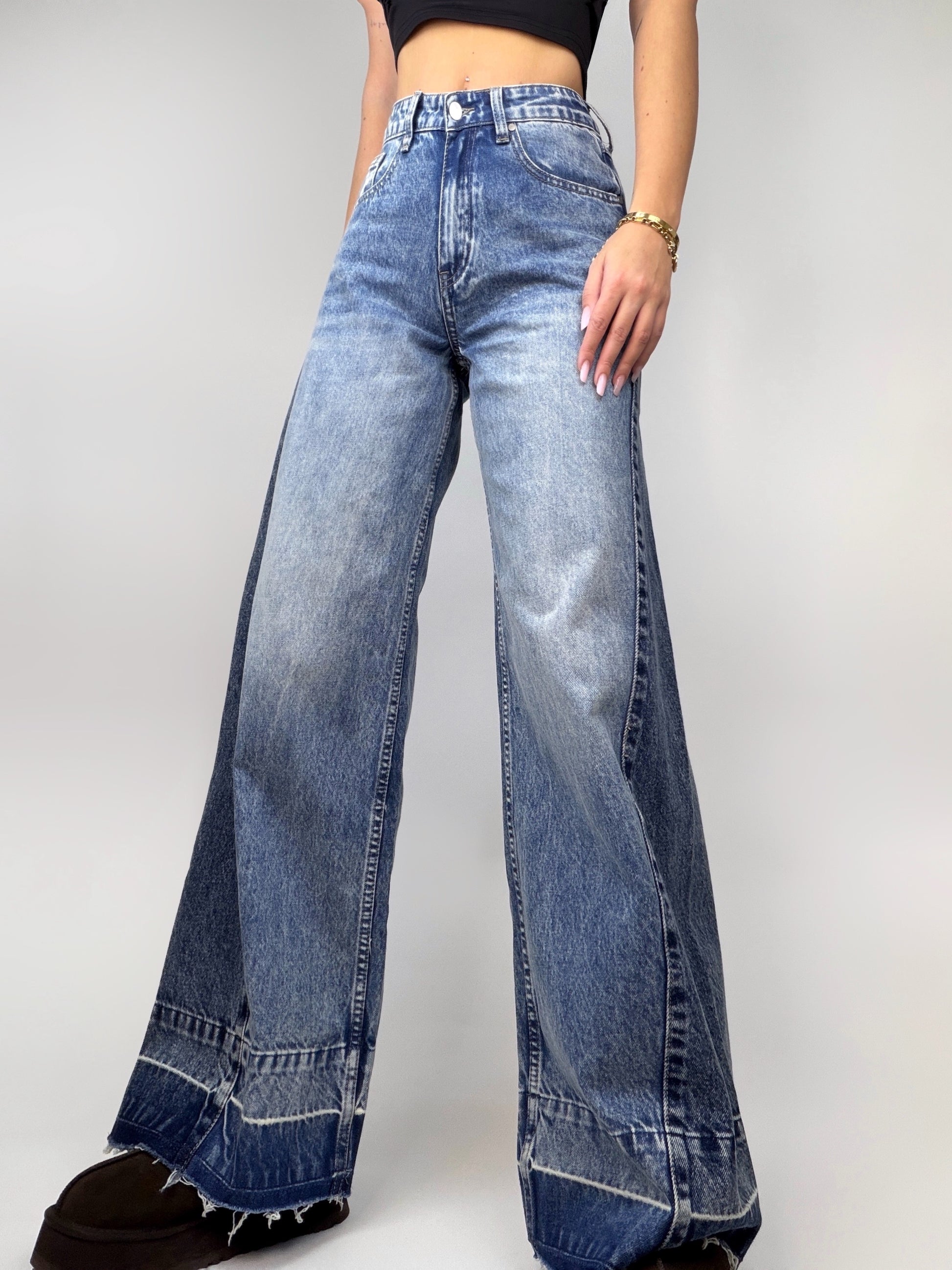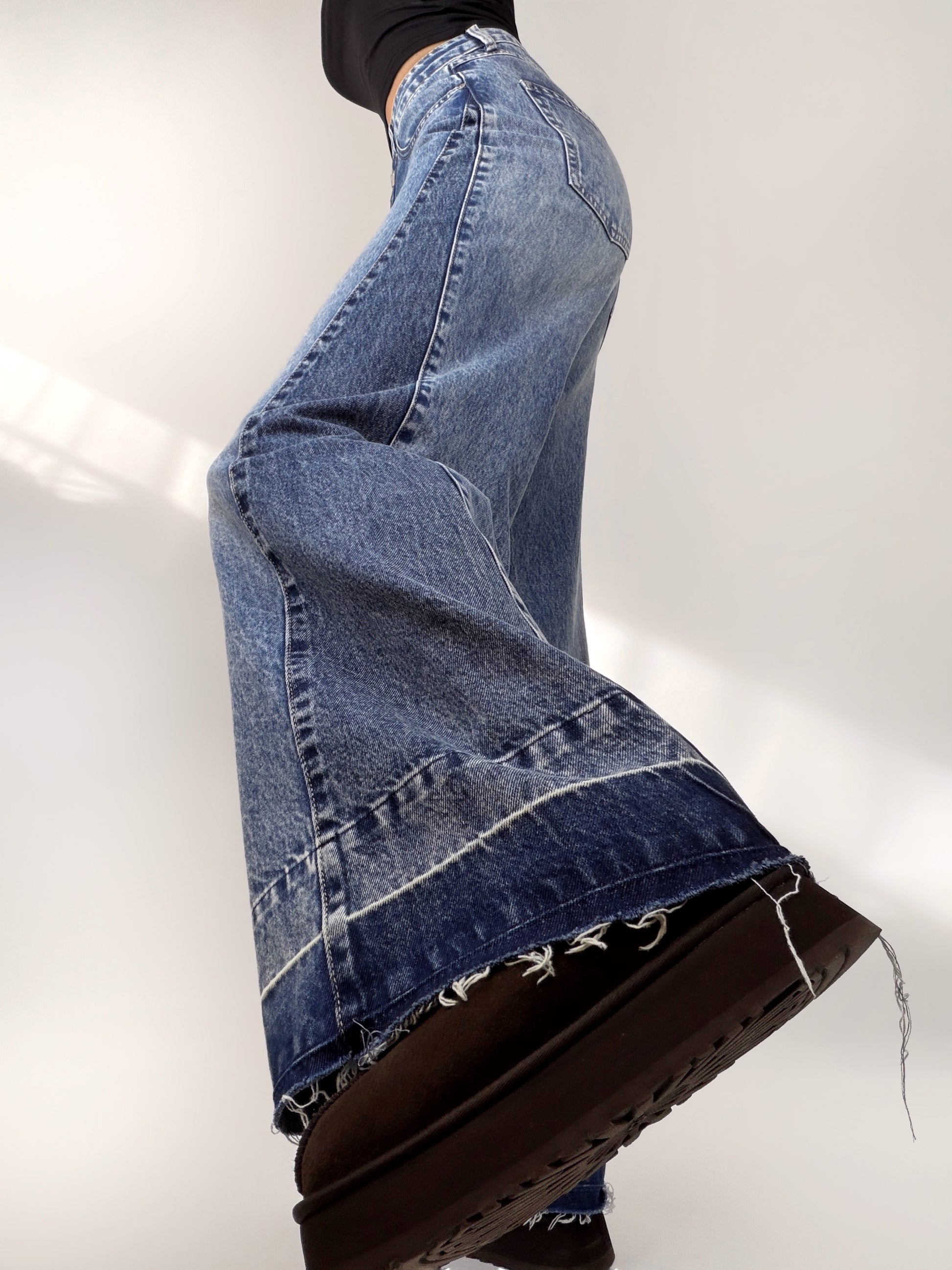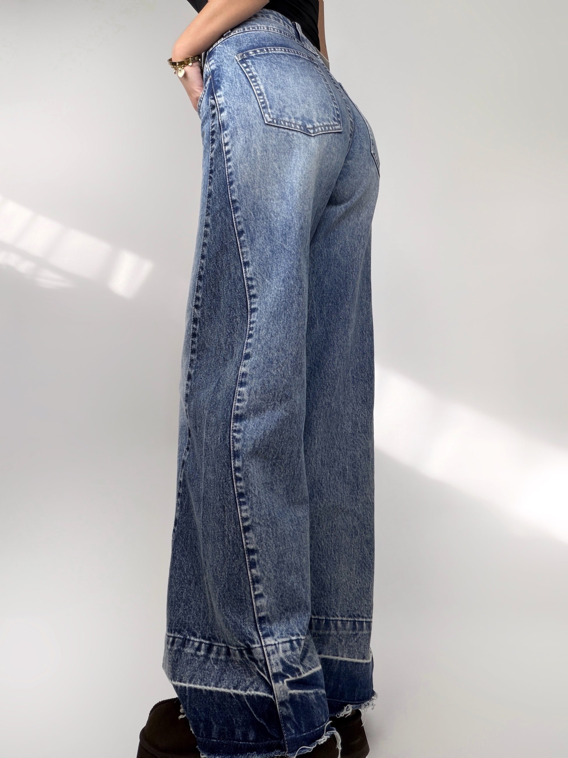 Blugi largi cu talie înaltă, confecționați pentru un look relaxat și modern. Prezintă un detaliu mai închis la partea de jos și pe laterale, care adaugă profunzime și un accent subtil de stil. O piesă versatilă, ideală pentru ținute casual sau streetwear.