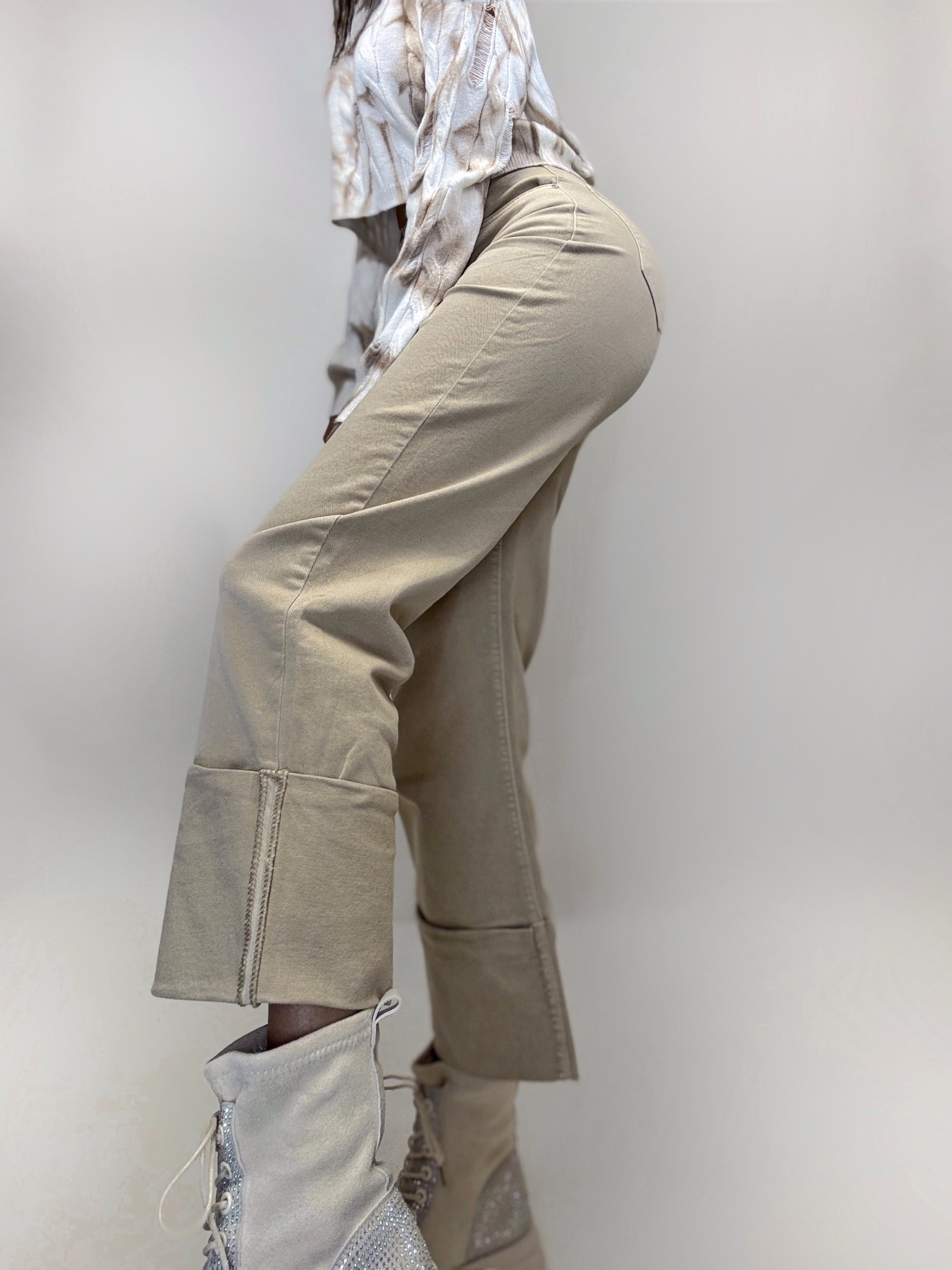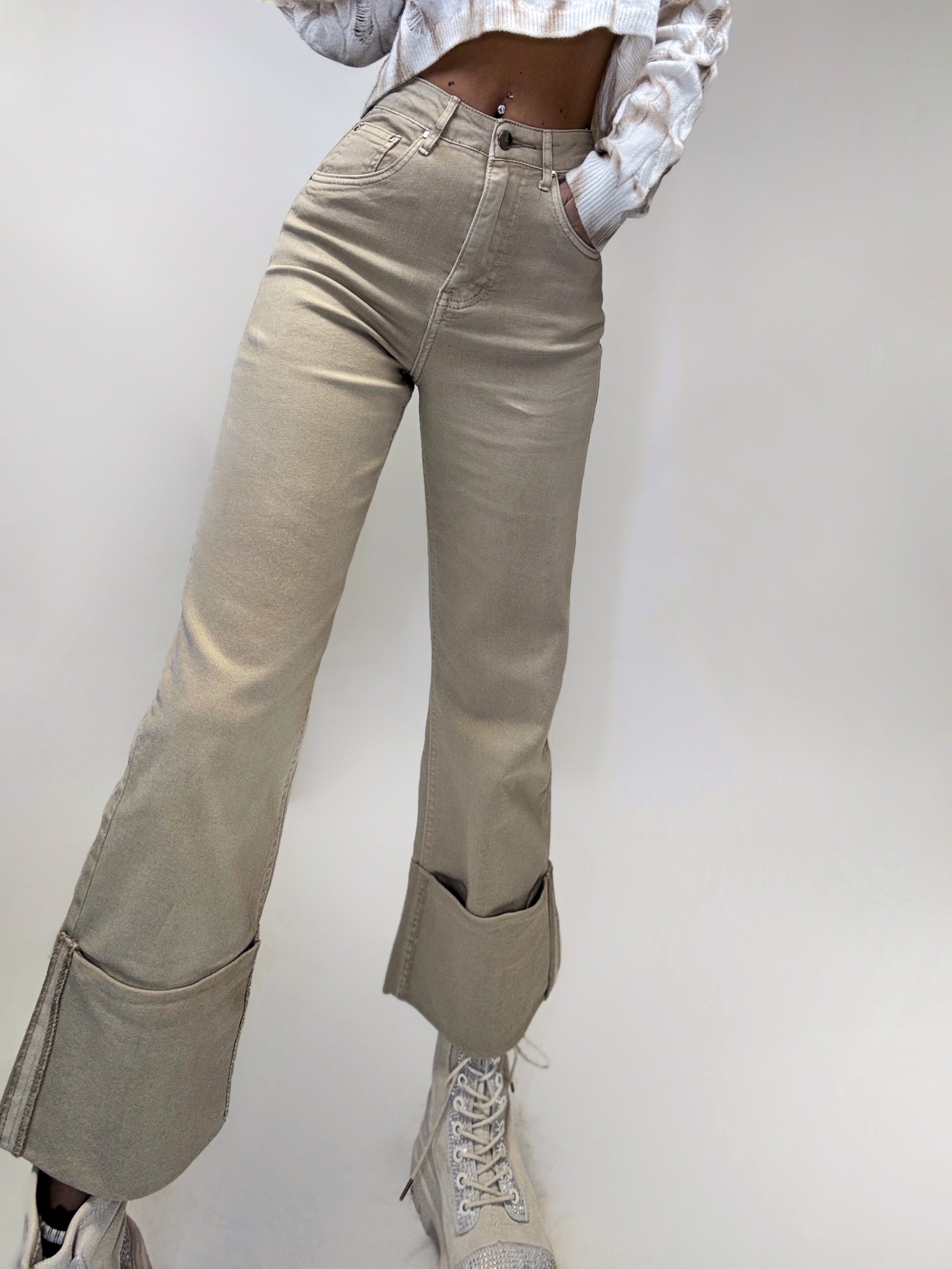 Pereche de blugi beji de lungime trei sferturi, cu un design modern și confortabil. Terminația de jos este detaliată cu o bată lată îndoită, adăugând un aer elegant și rafinat. Accesorizată cu buzunare funcționale, acești blugi sunt perfecte pentru o ținută casual, dar stilată.