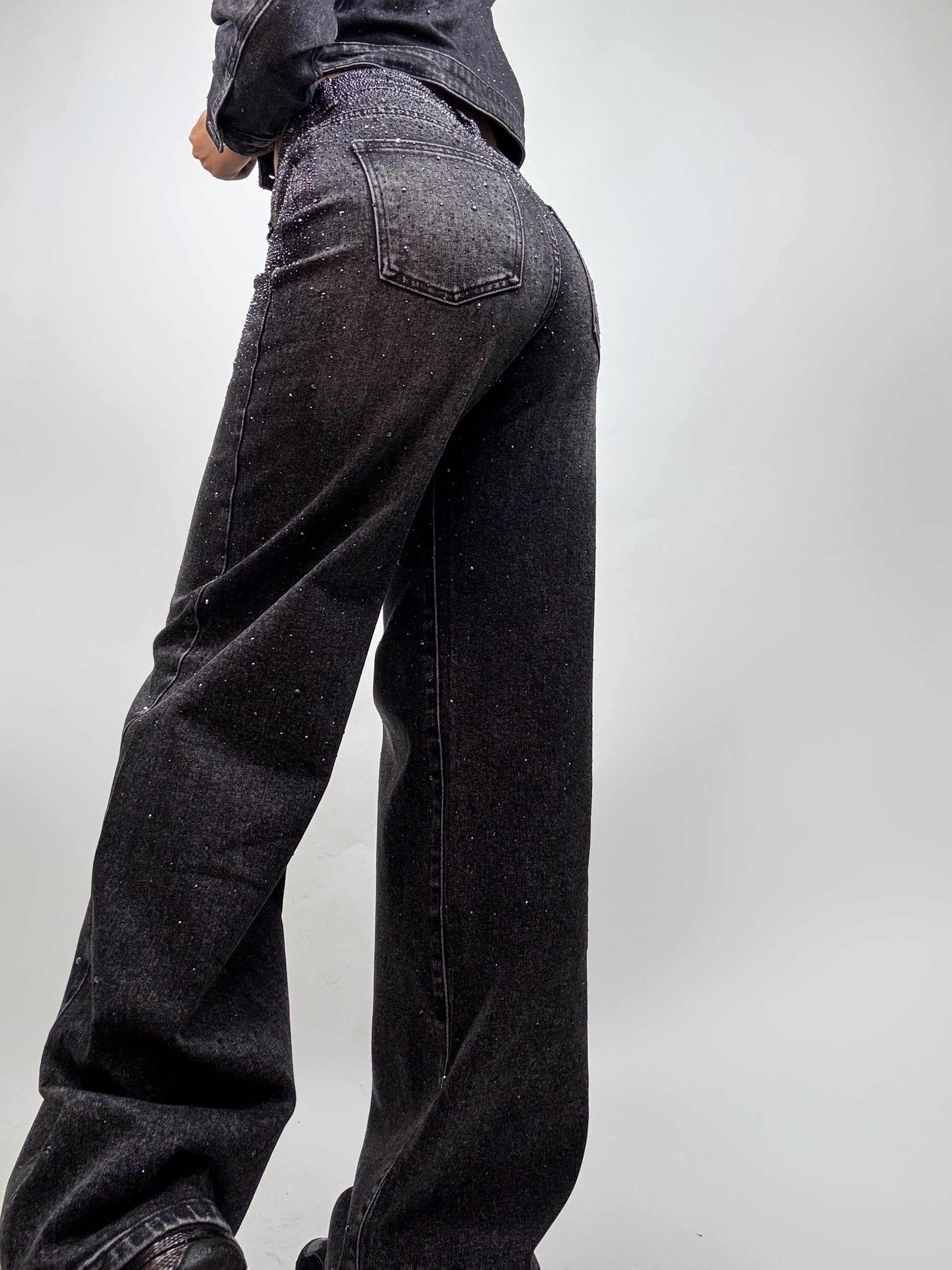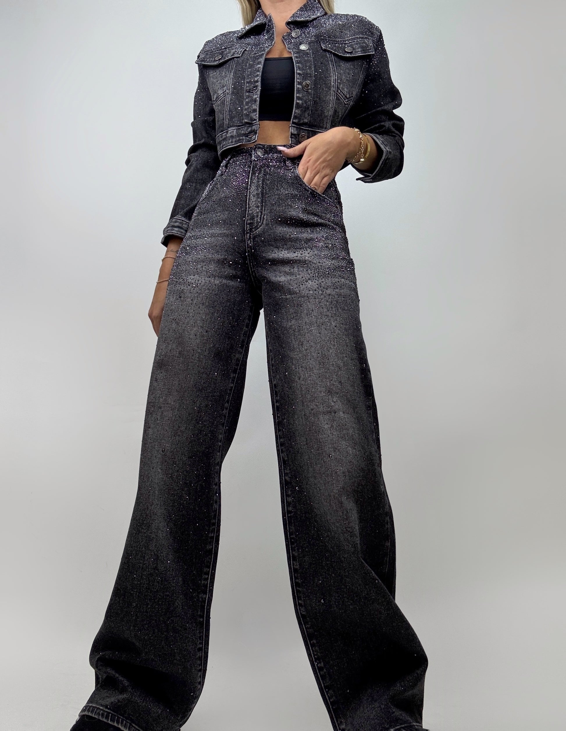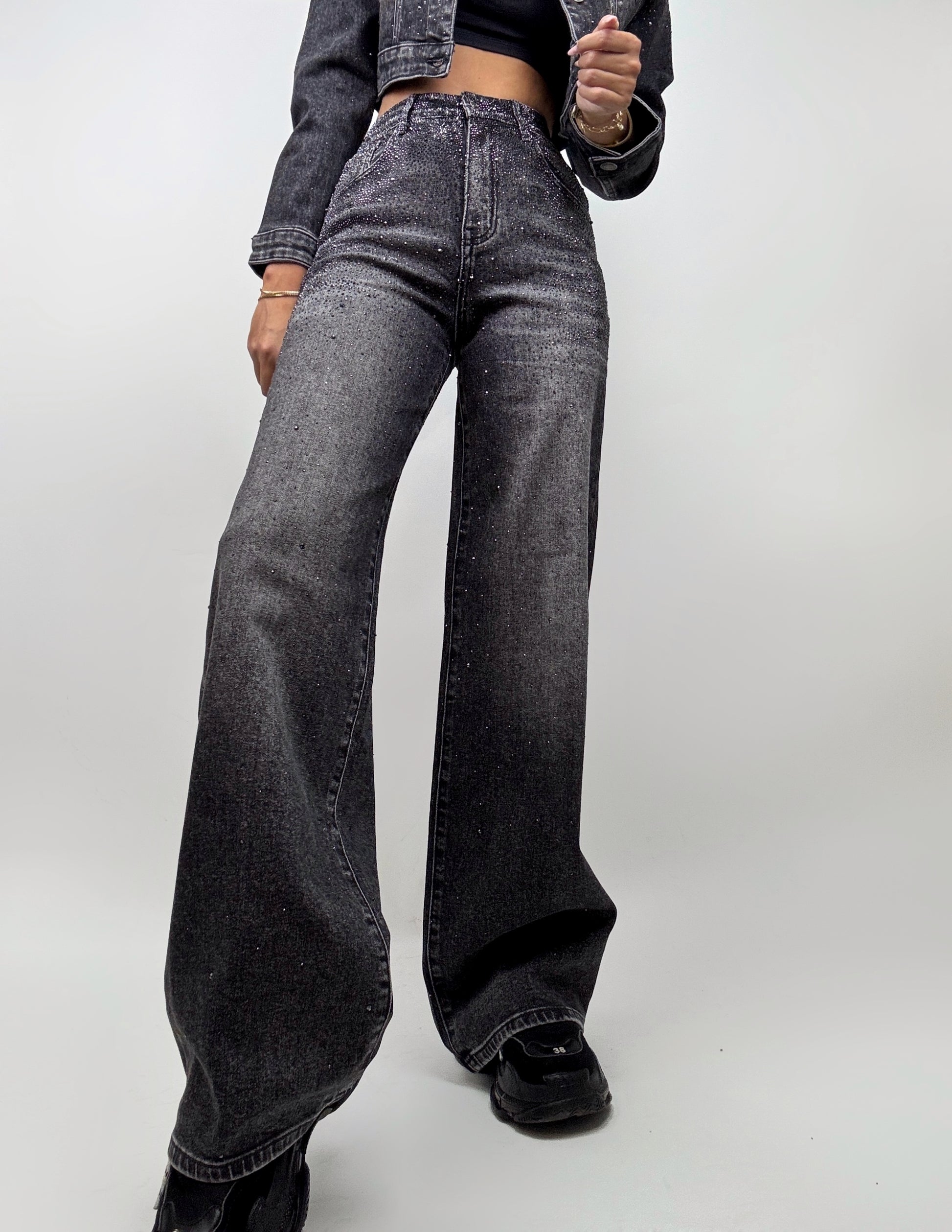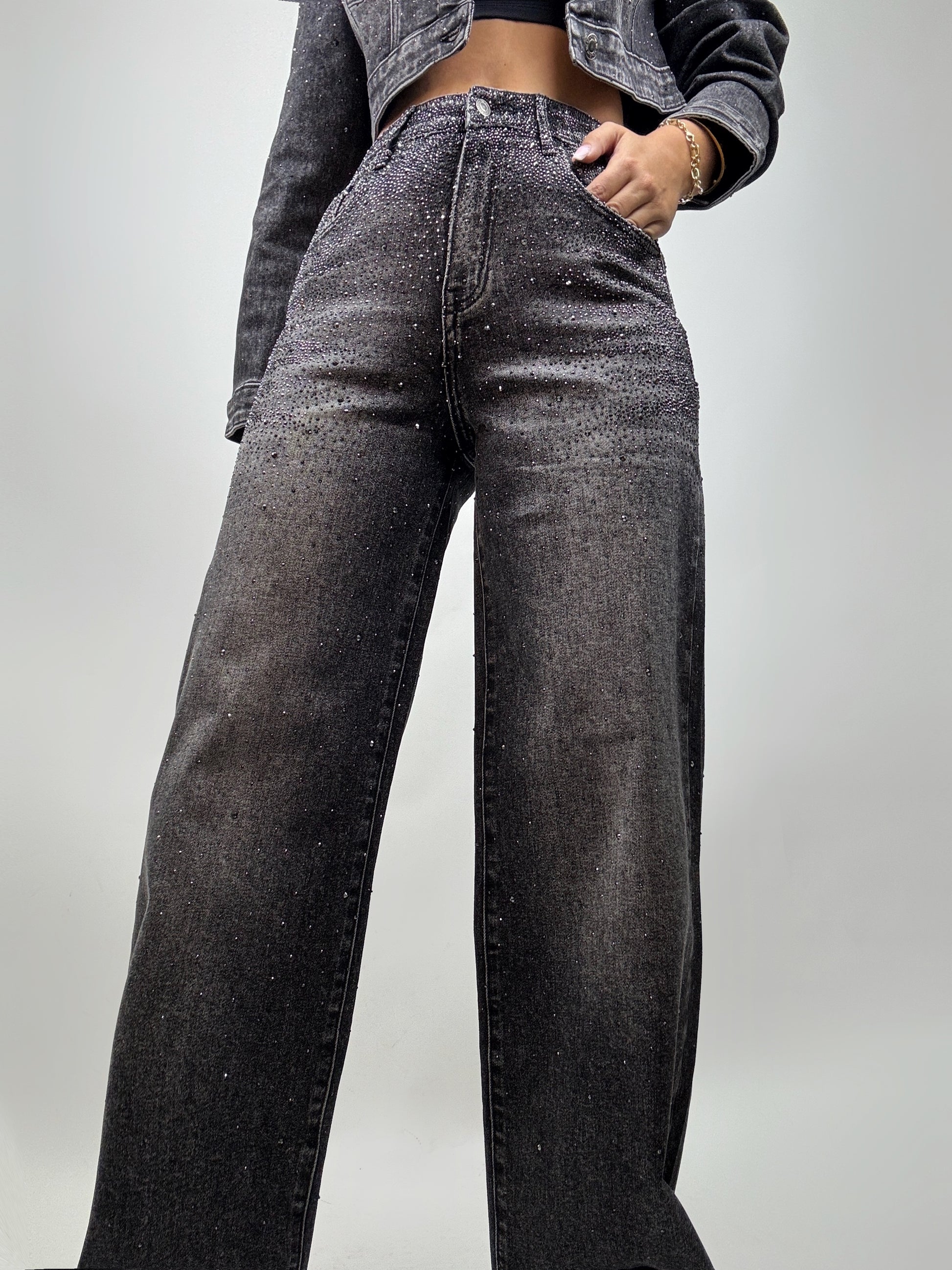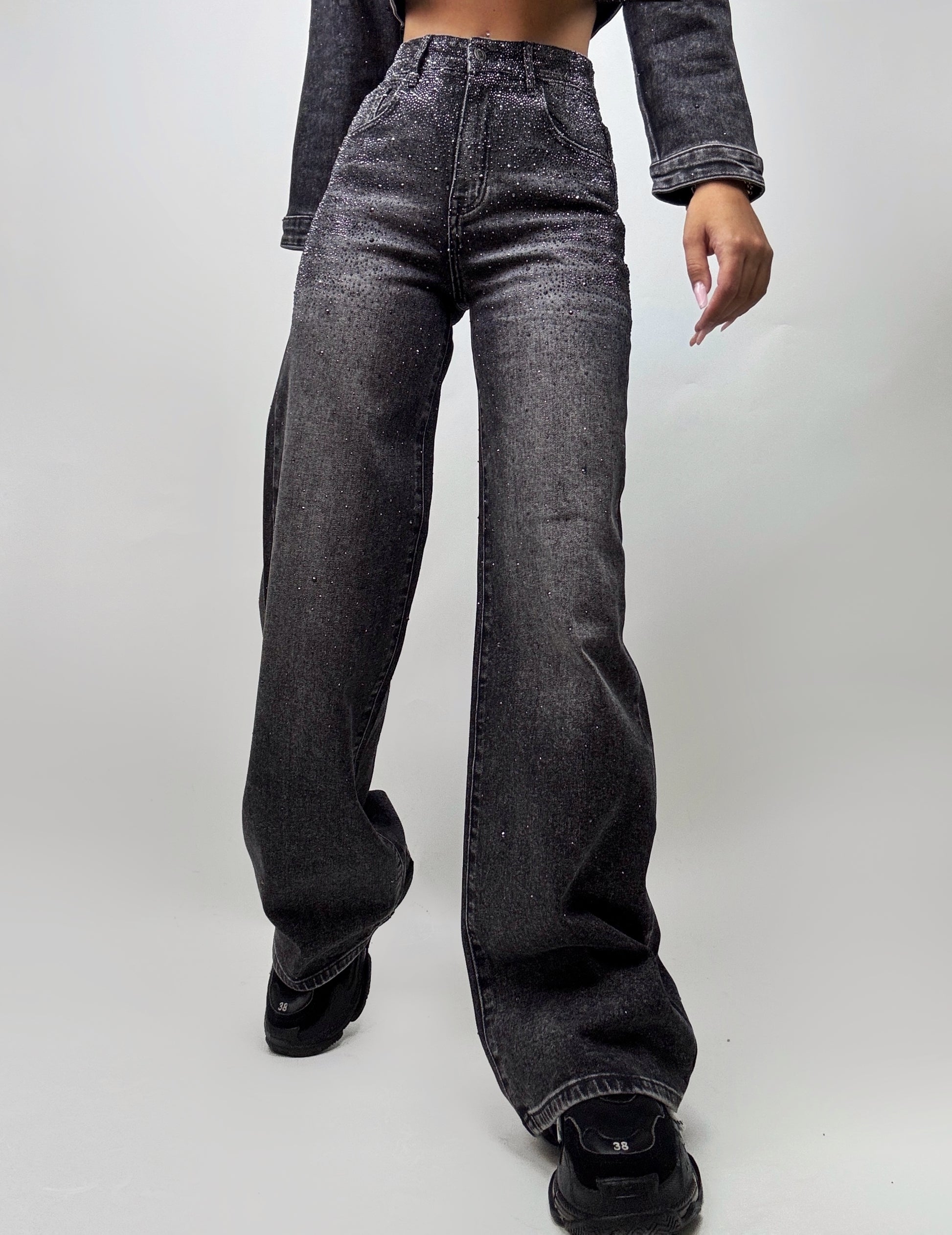 Blugi evazați, cu un design modern și statement, accesorizati cu ștrasuri strălucitoare aplicate pe față și pe spate, care adaugă un efect glam și transformă piesa într-un element central al ținutelor îndrăznețe.