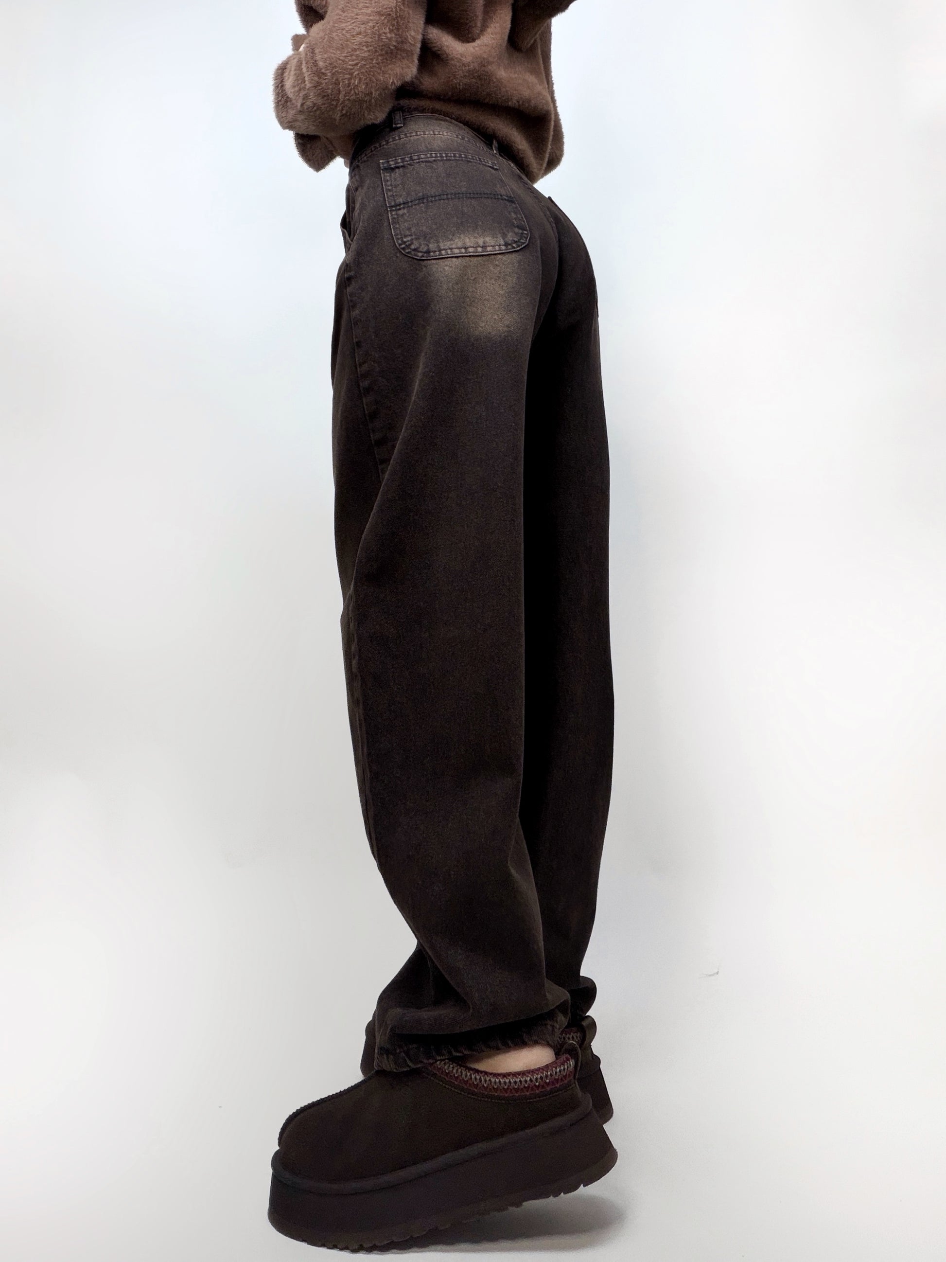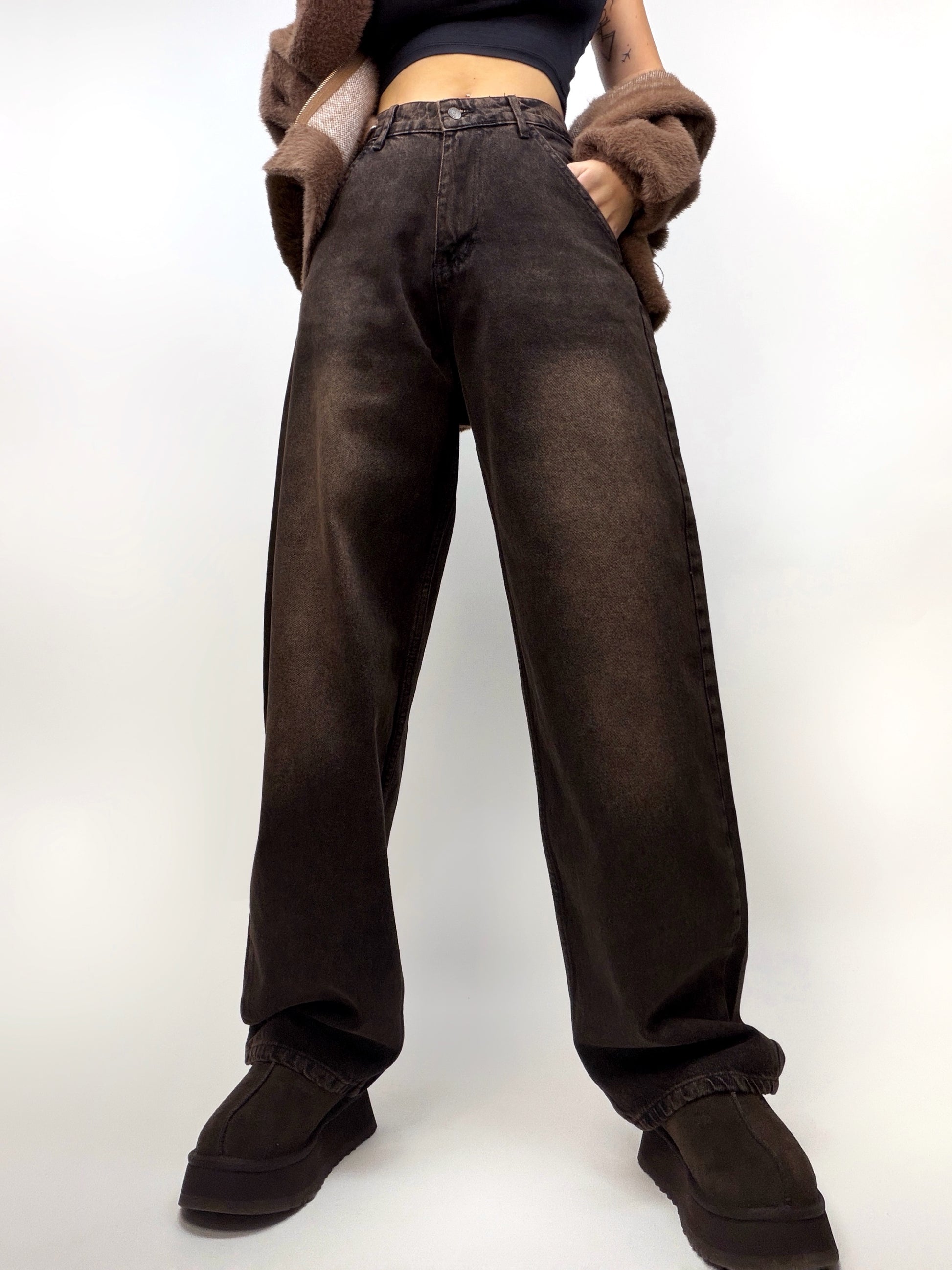 Blugi maro cu croi larg, cu accente mai deschise care adaugă profunzime și caracter look-ului. Lejeri și confortabili, sunt perfecți pentru outfituri casual, combinând stilul relaxat cu un aer modern și nonconformist.