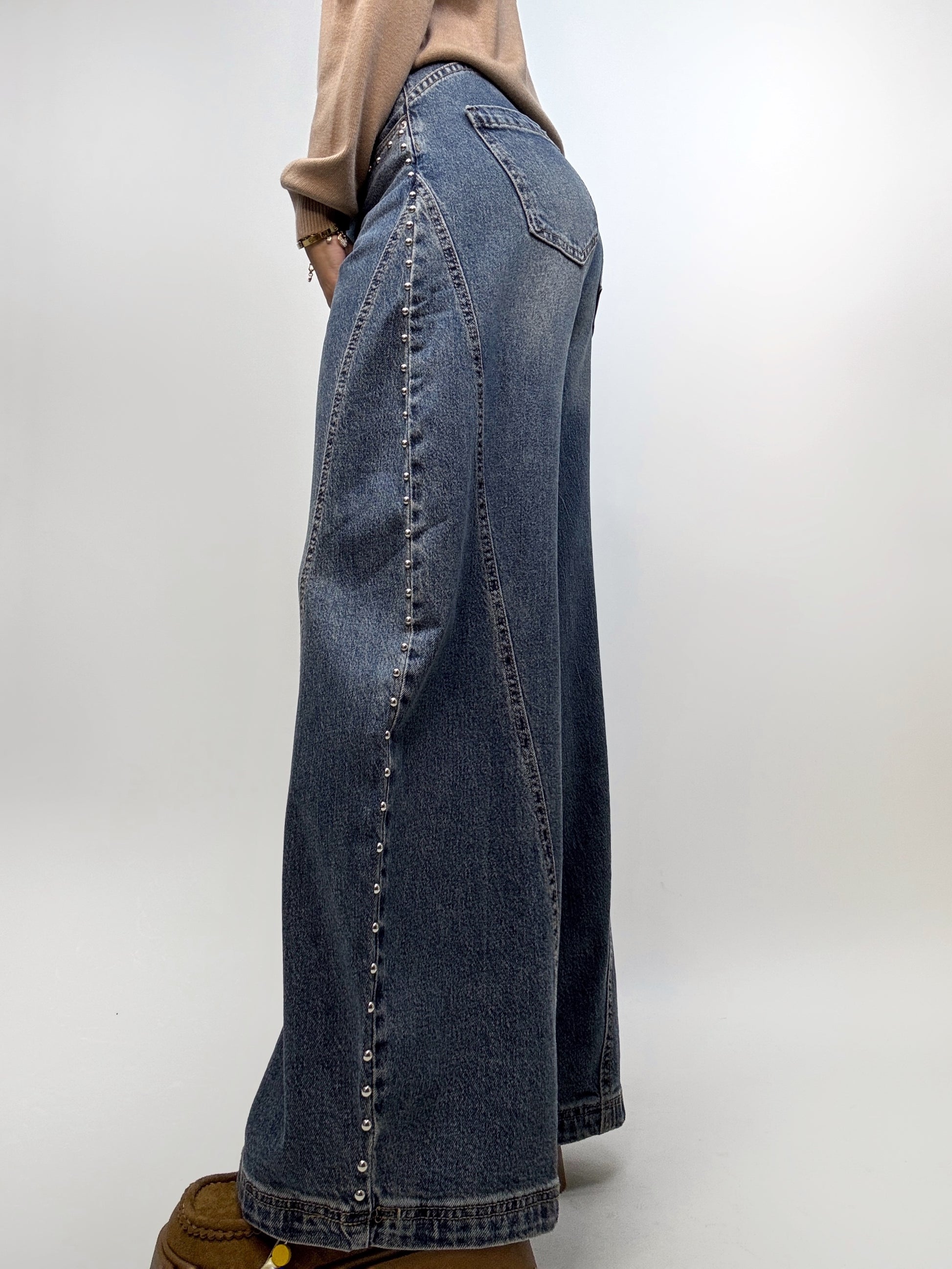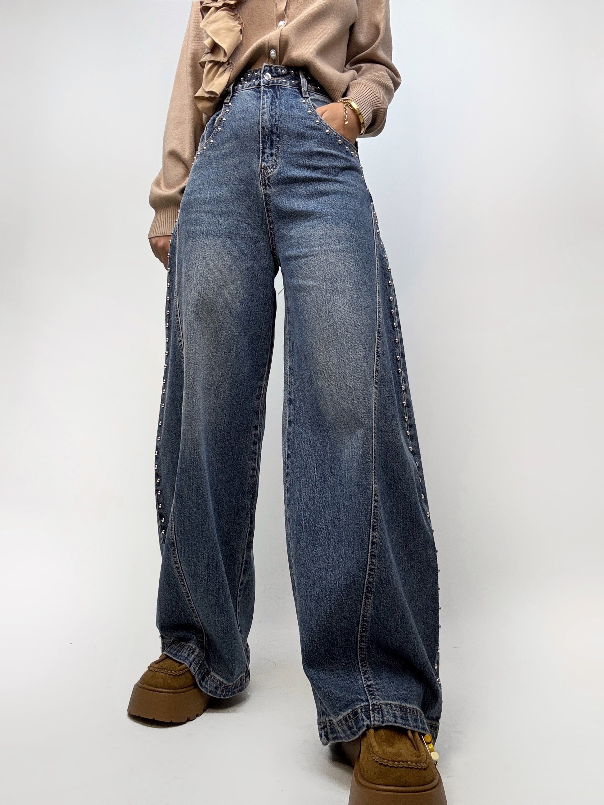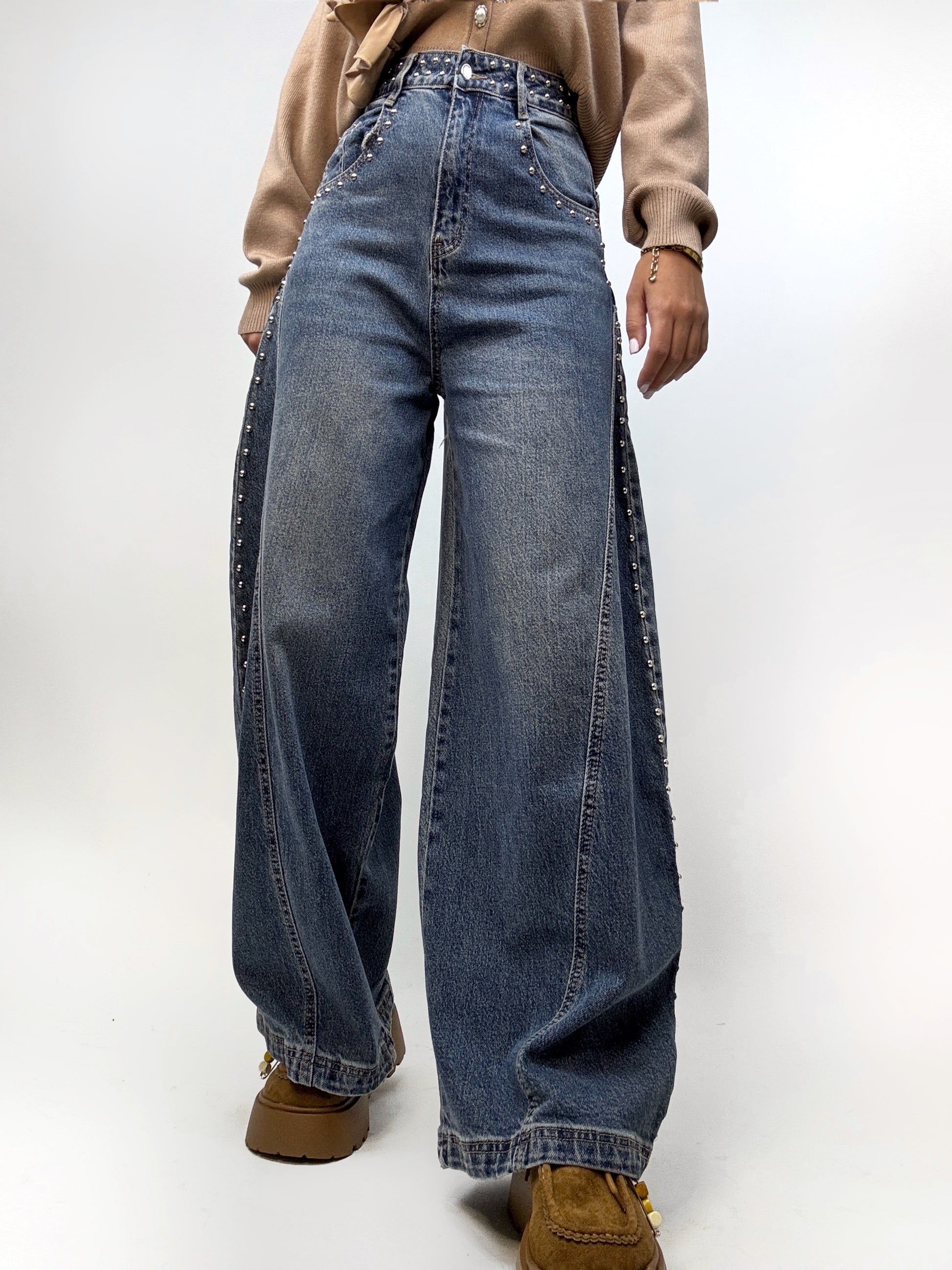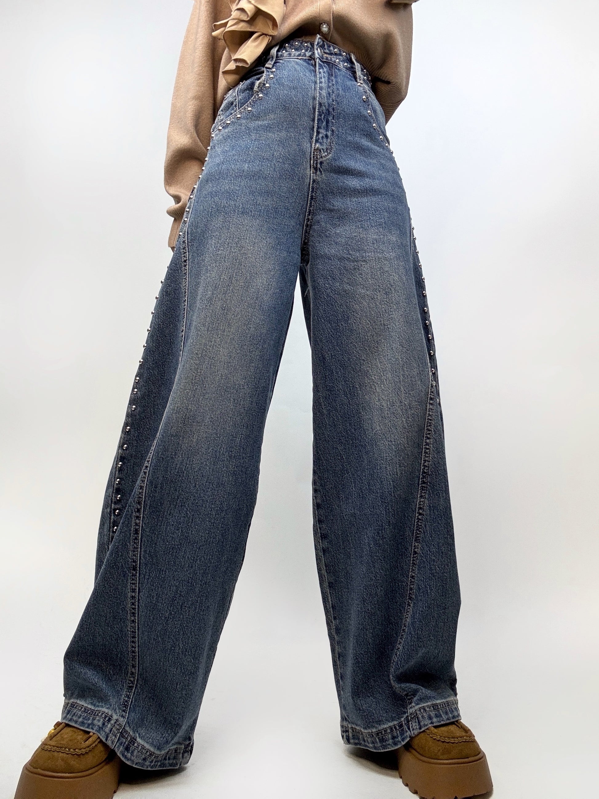 Blugi largi, stil balon, cu talie înaltă și decorați cu capse argintii, care combină confortul cu un design modern și un accent subtil de strălucire.