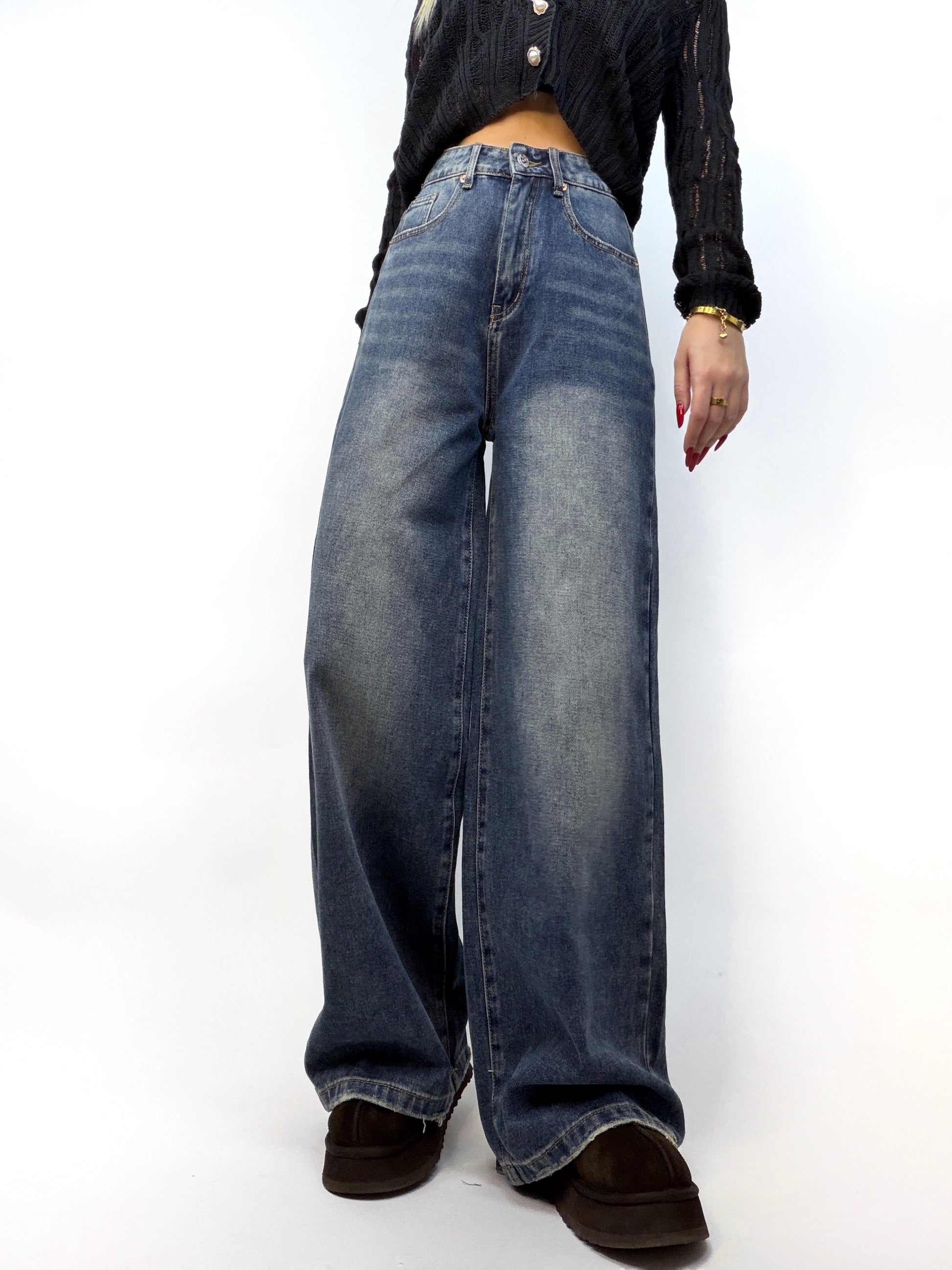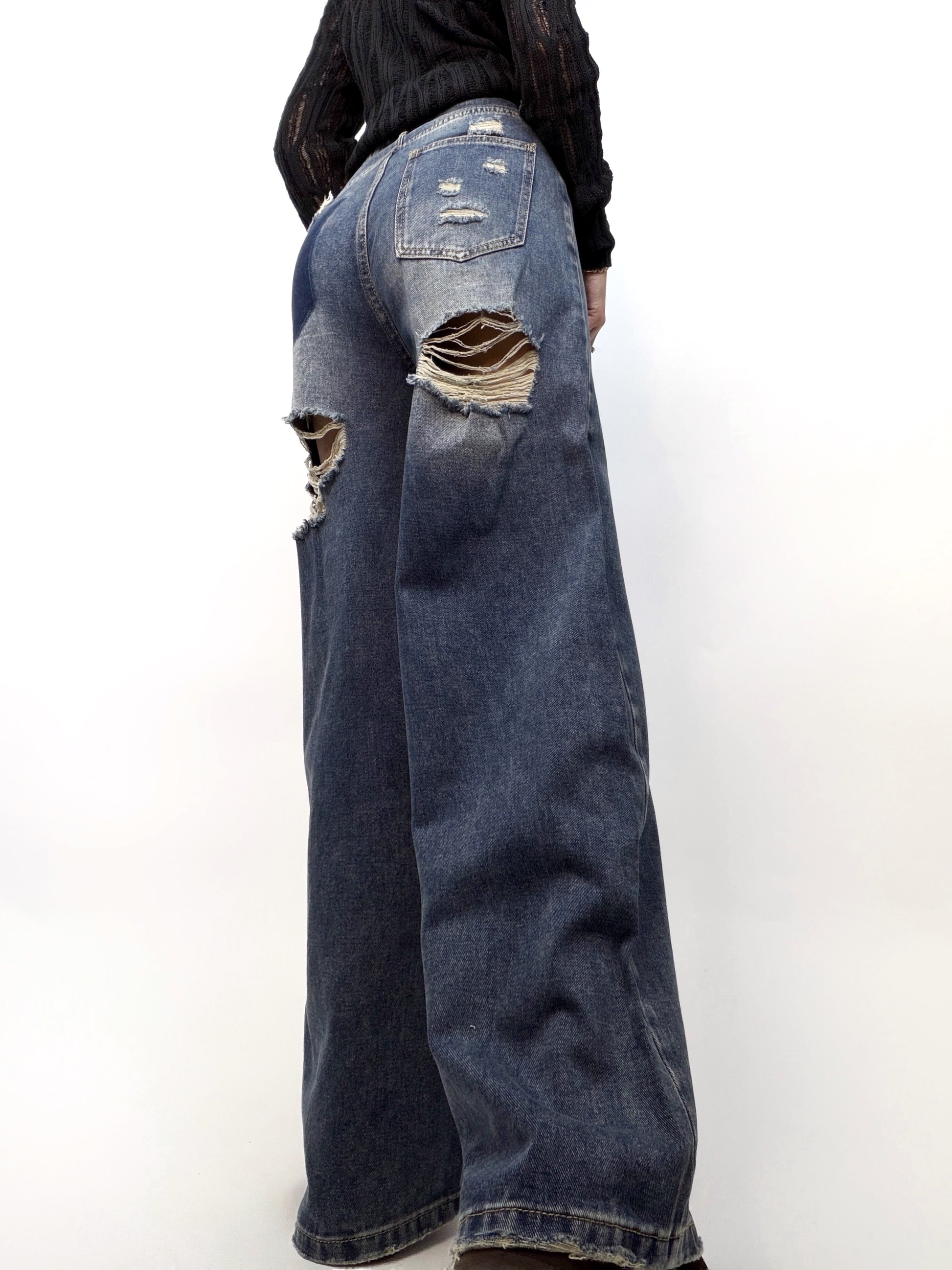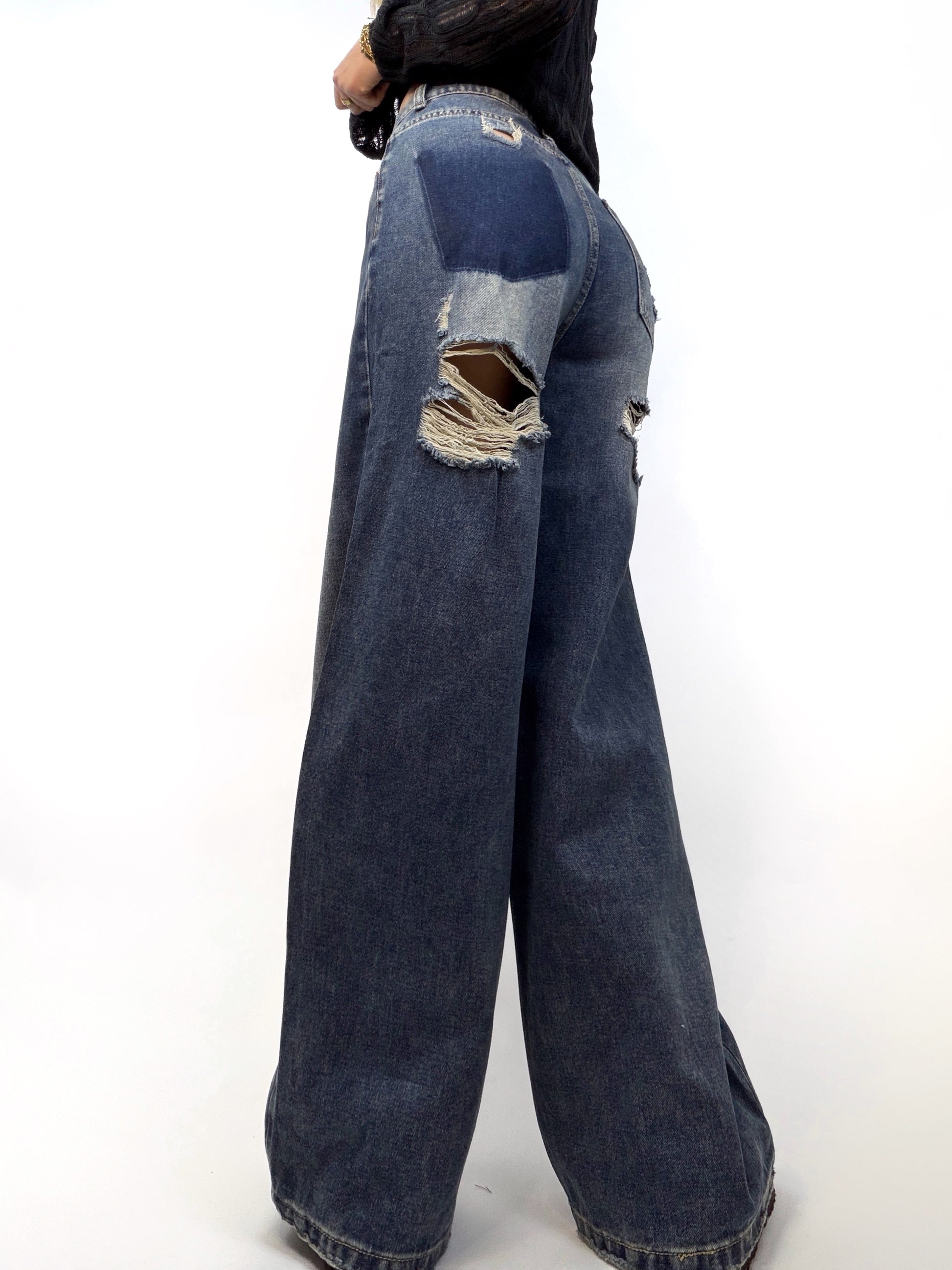 Blugi cu talie înaltă și croi larg, care combină confortul cu detalii surprinzătoare. În partea din spate, un buzunar este reprezentat printr-o pictură creativă, iar rupturile atent plasate adaugă un aer modern și nonconformist, transformând blugii într-o piesă statement a ținutei.