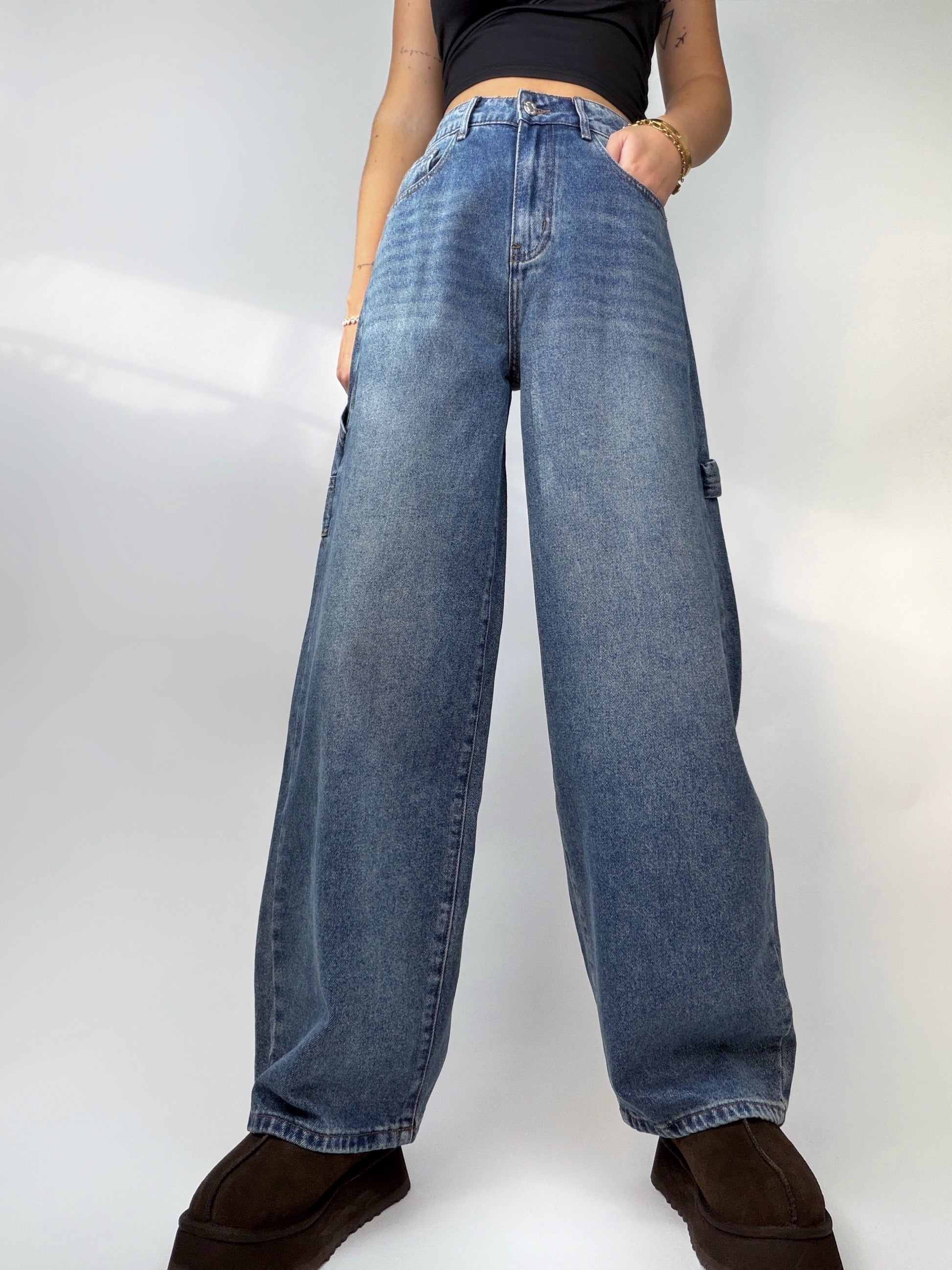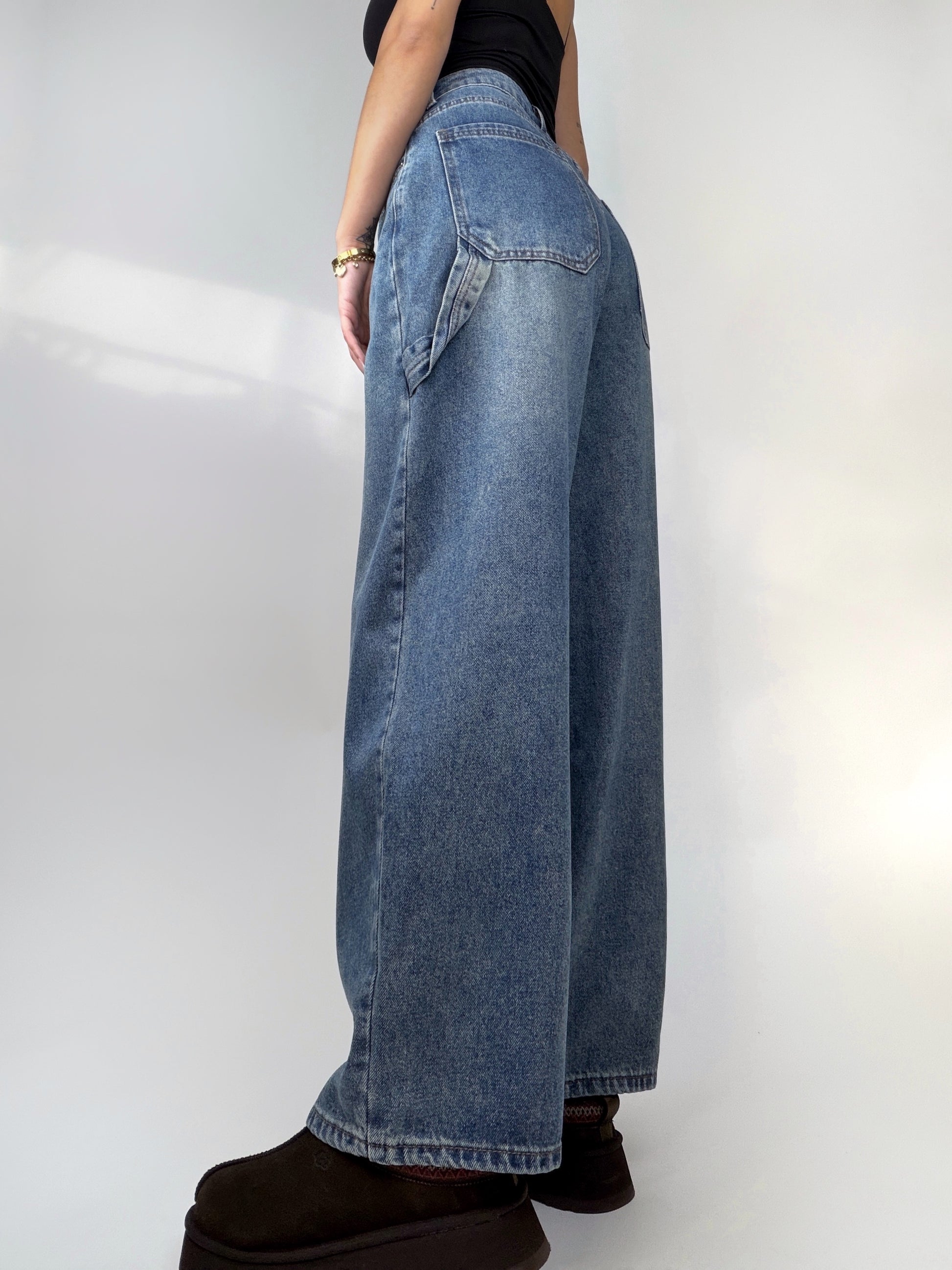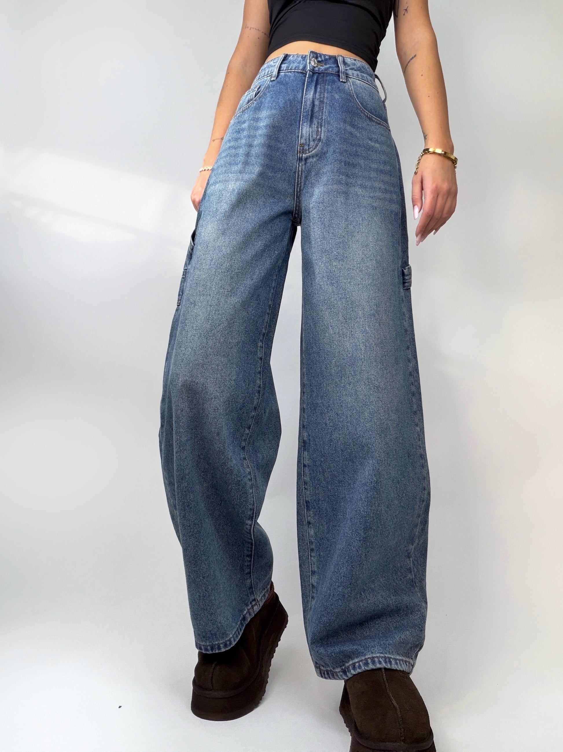 Blugi largi, cu o formă ușor rotunjită și un design minimalist, accentuat de detalii asimetrice în spate — un buzunar coborât pe un picior și un element denim pe celălalt. O piesă simplă, dar cu personalitate, care adaugă un twist modern oricărui look urban.