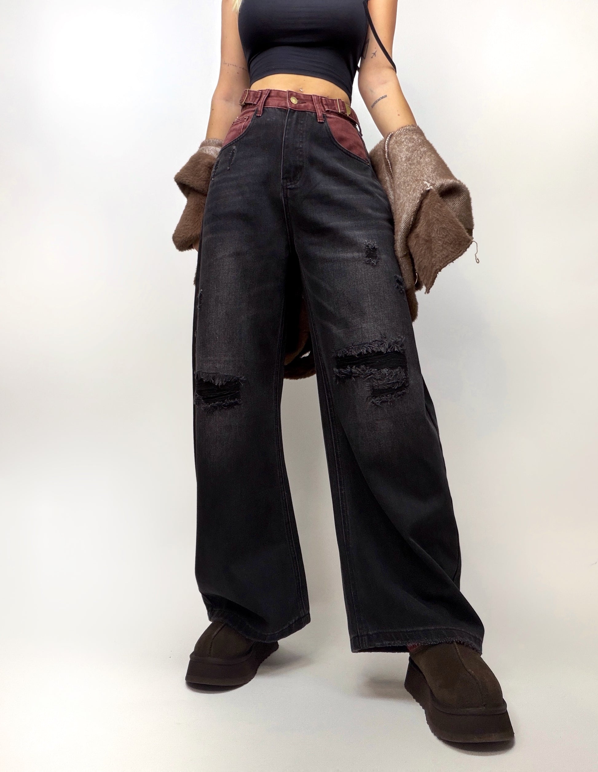 Blugi cu croi larg, cu rupturi strategice acoperite pe interior pentru un efect edgy dar subtil. Talie ajustabilă și accente vișinii în partea superioară adaugă un detaliu modern și feminin. Confortabili și stilati, perfecți pentru un look casual cu atitudine.