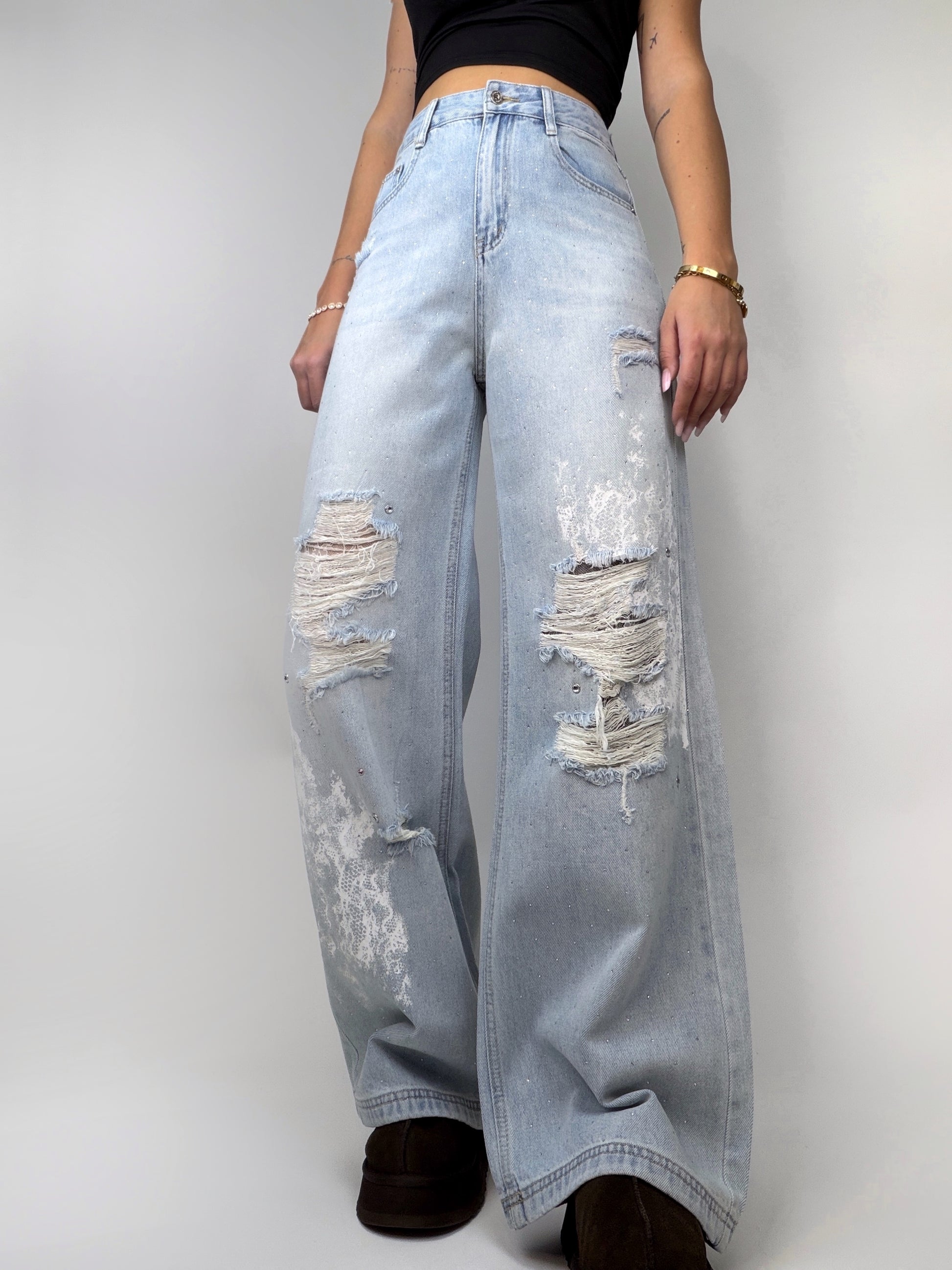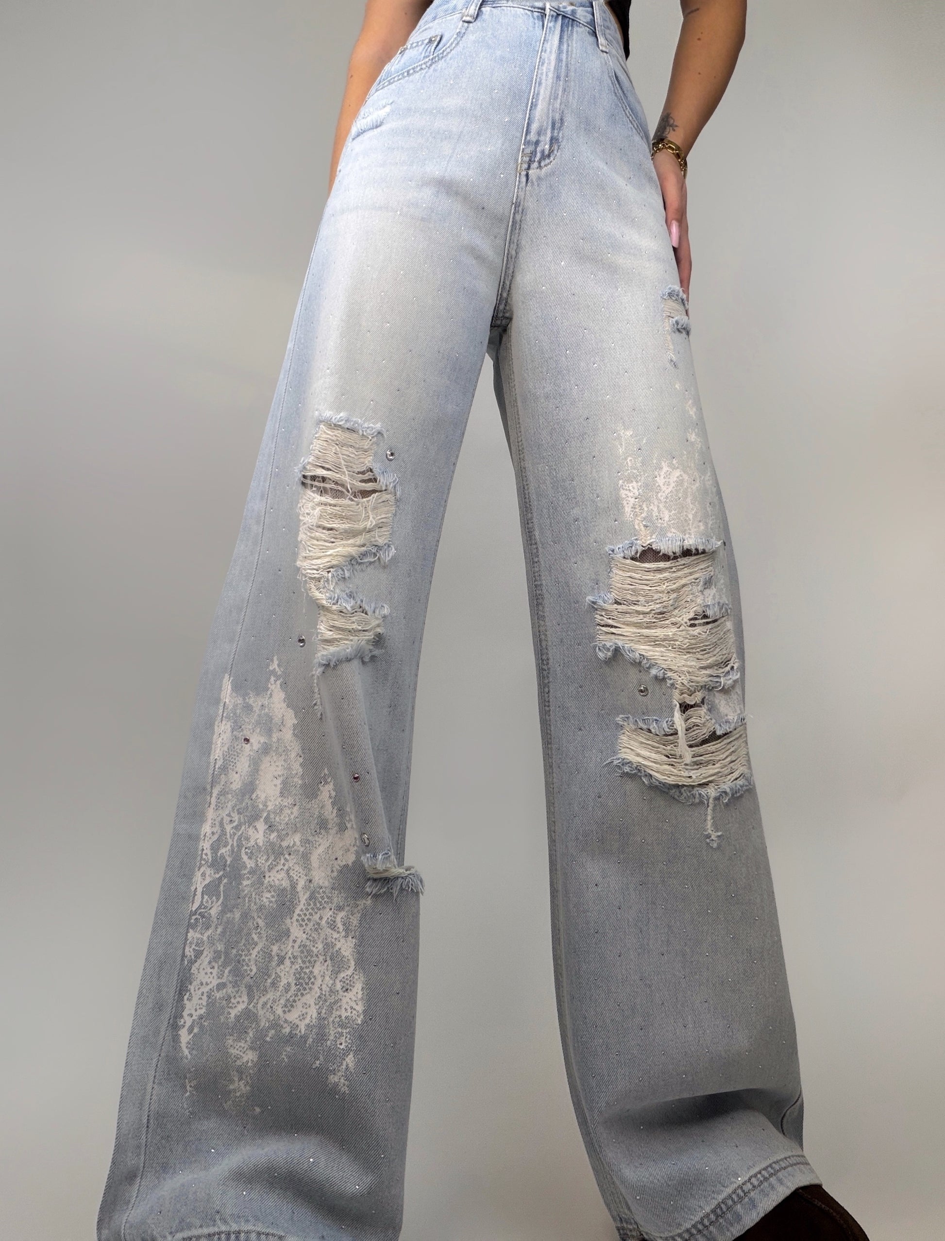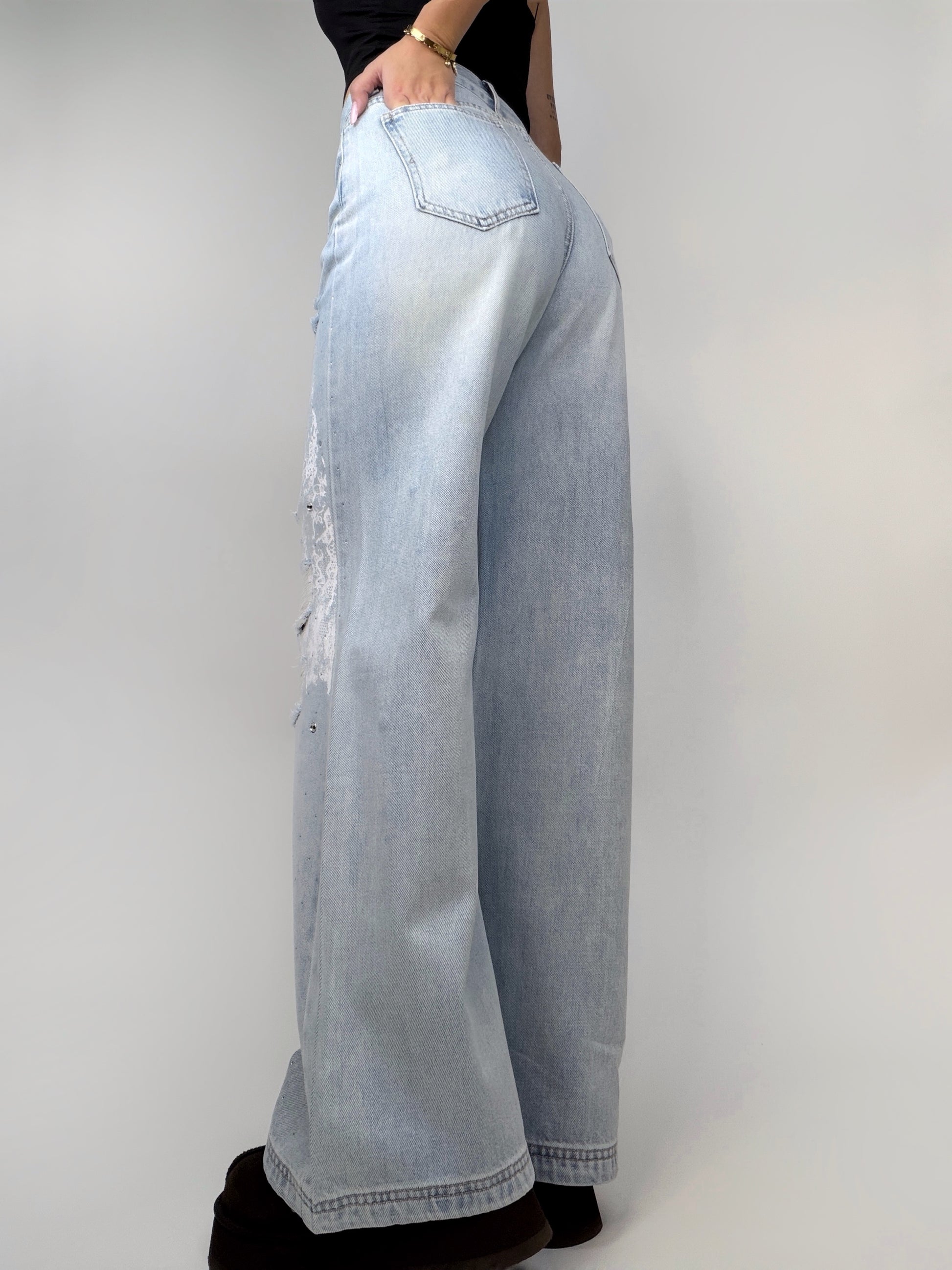 Blugi largi cu un design spectaculos, accesorizați cu ștrasuri strălucitoare, rupturi plasate cu grijă și un print alb în stil dantelă, ce adaugă o notă romantică și contrastantă într-o piesă cu aer urban și sofisticat.