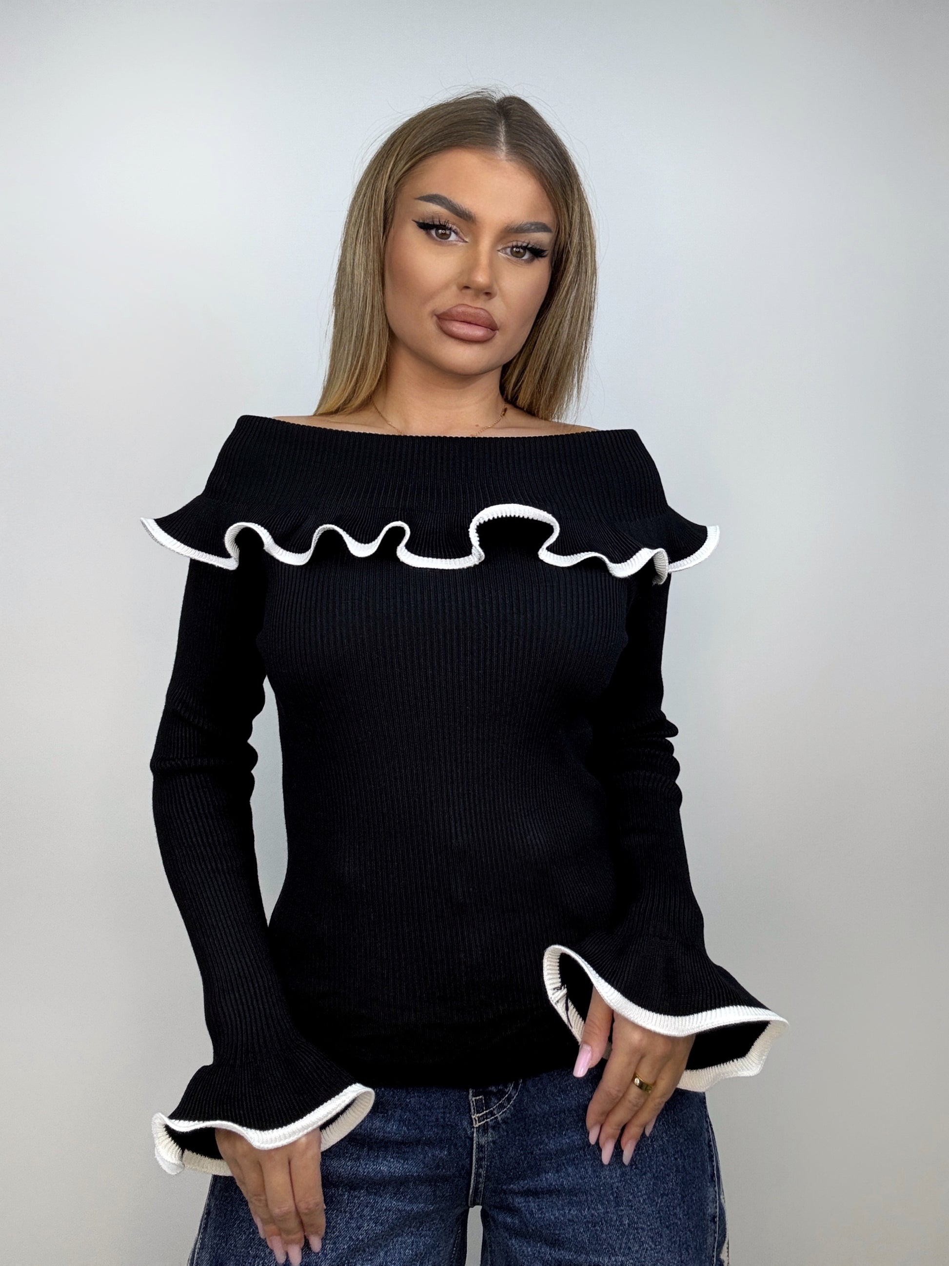 Bluză mulată din material elastic, ce se așază frumos pe corp și evidențiază silueta. Volanul din partea de sus poate fi lăsat mai jos pentru un efect de umeri goi, iar același detaliu se regăsește și la mâneci. Terminațiile albe ale volanelor oferă un contrast elegant pe fondul negru.