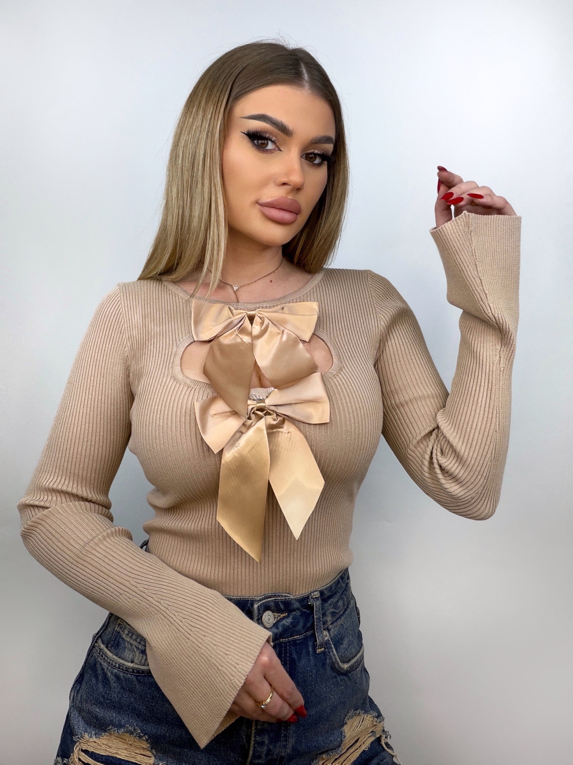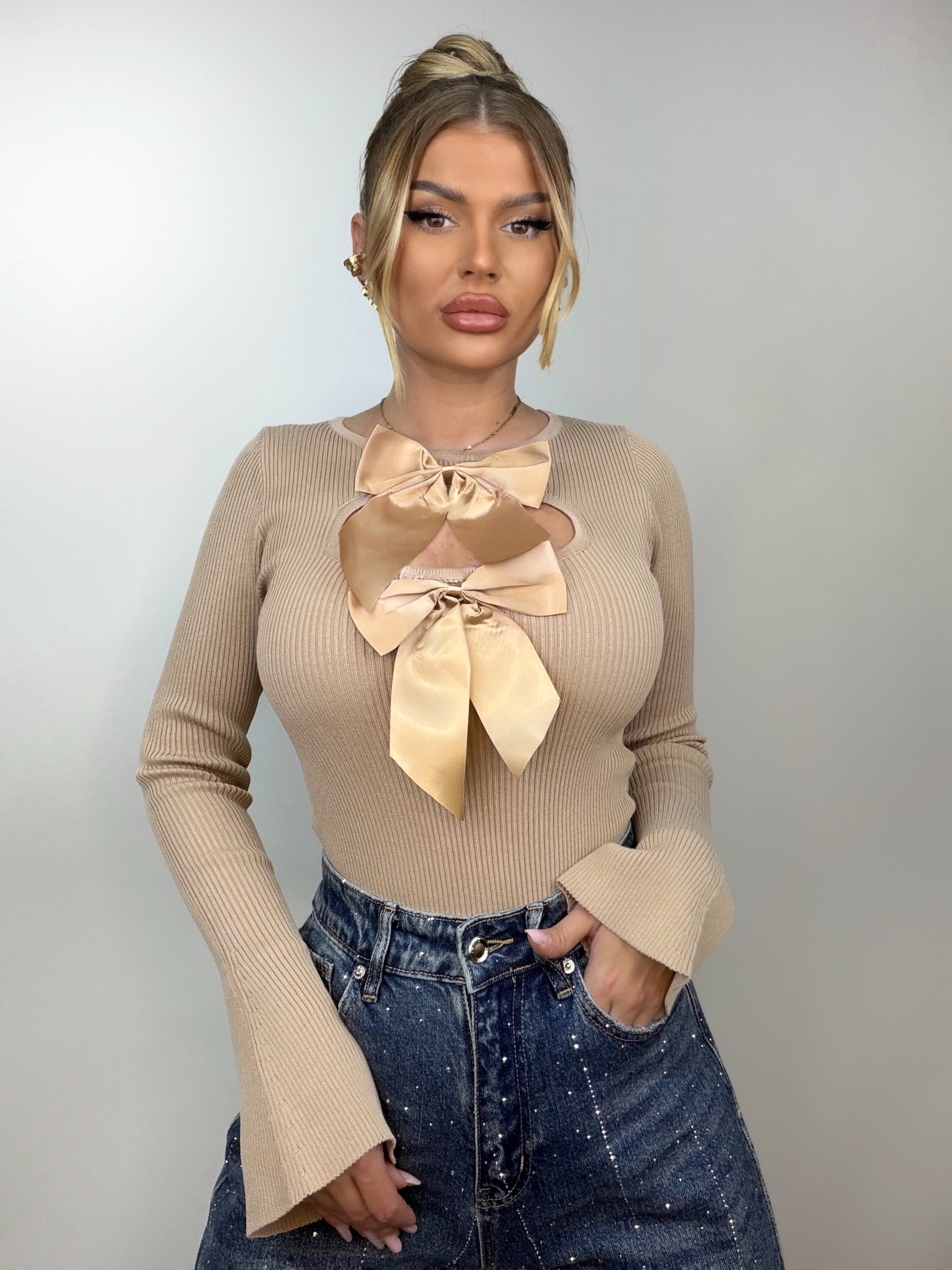 Body mulat din material elastic, ce urmează linia corpului și evidențiază silueta. Detaliul cu fundă detașabilă în față și decupajul subtil la decolteu adaugă o notă jucăușă, completată de mânecile clopoțel pentru un efect feminin și delicat.