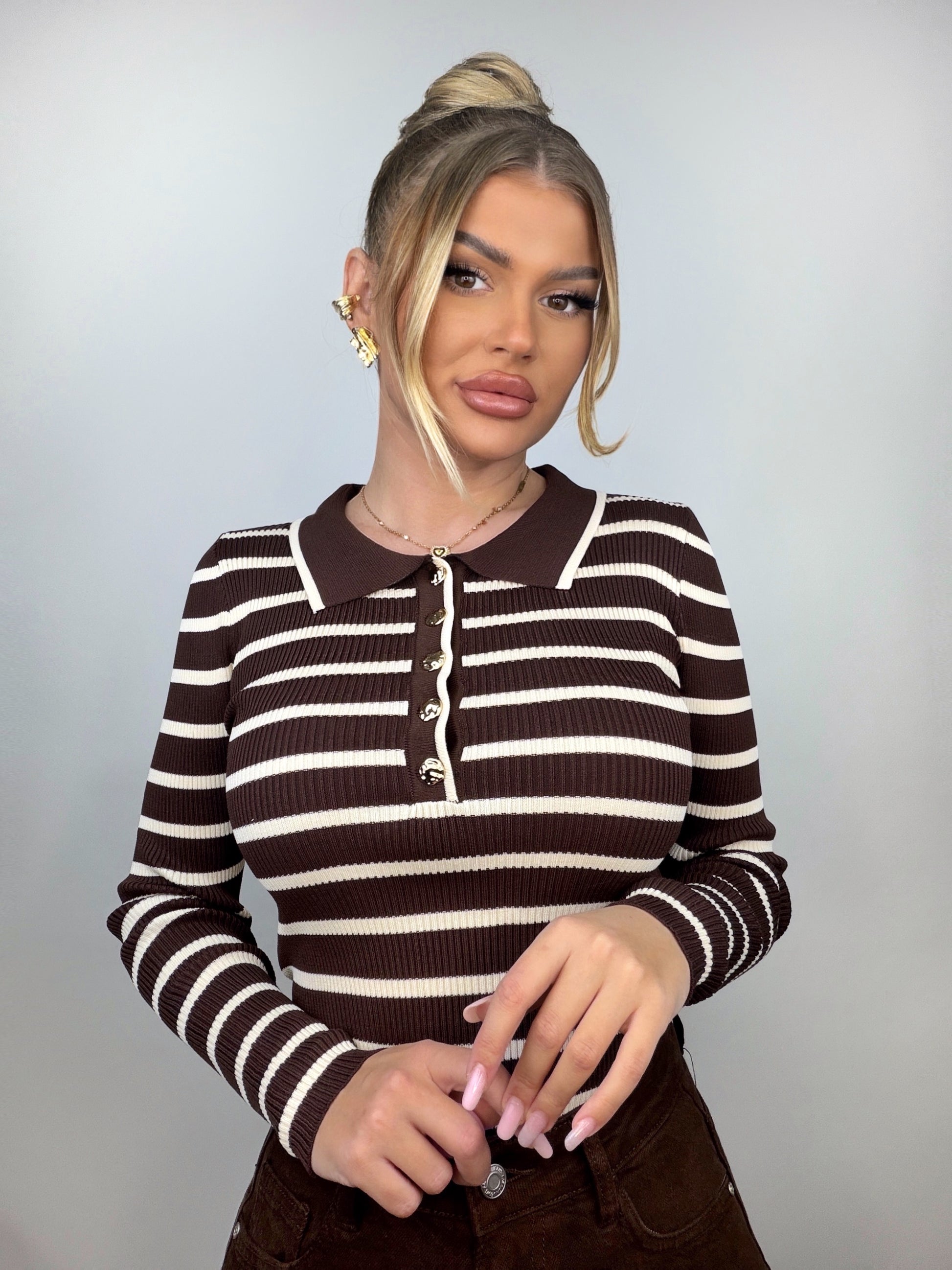 Body din tricot elastic, într-o nuanță caldă de maro, accentuat de linii bej fine. Gulerul clasic și nasturii aurii adaugă un touch elegant, transformând o piesă simplă într-una sofisticată și ușor de integrat în orice look.