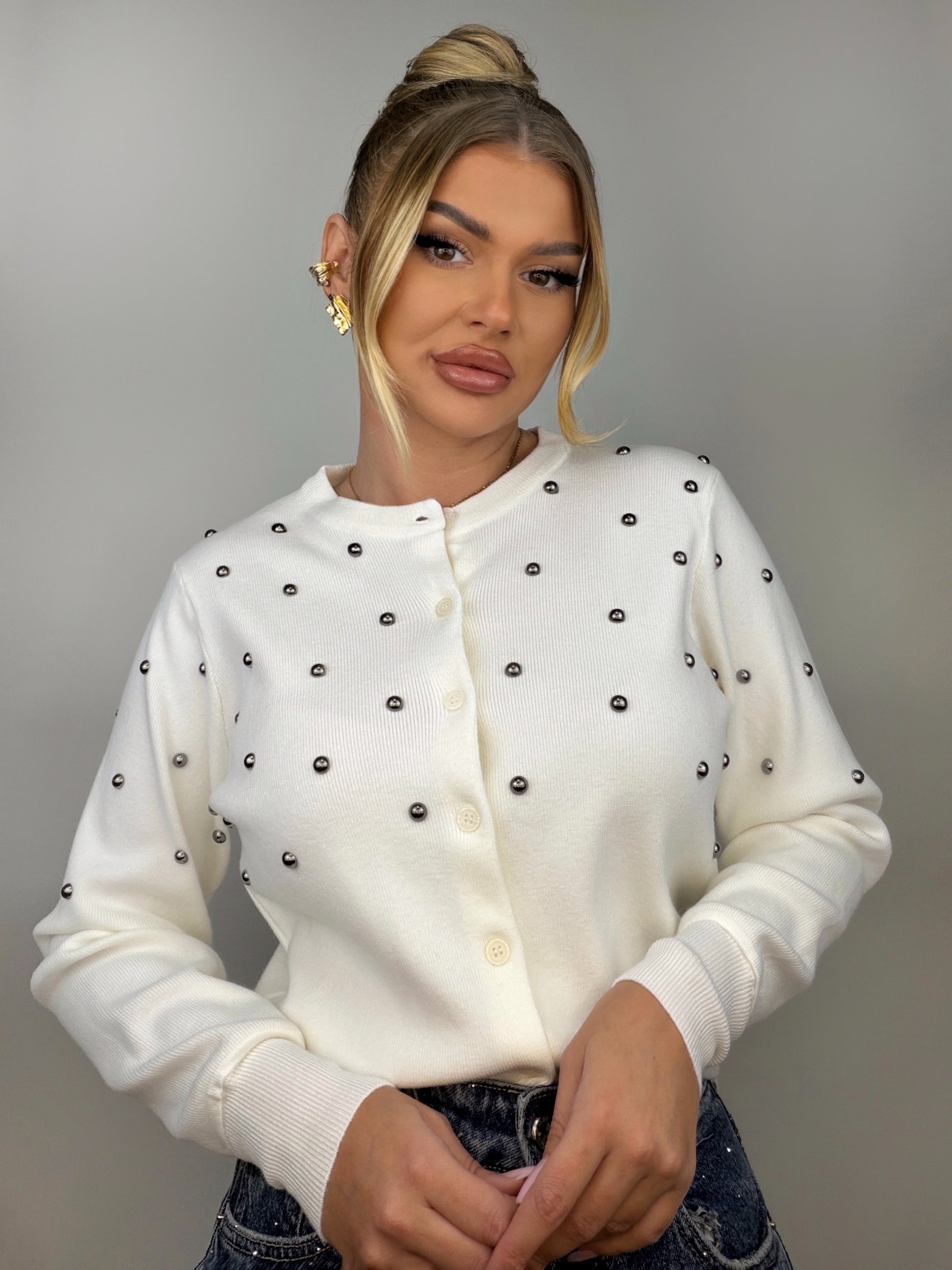 Cardigan alb, confecționat din material elastic ce oferă lejeritate și confort. Închiderea cu nasturi și accesorizarea cu ținte rotunjite adaugă un aer modern și ușor edgy, perfect pentru un look casual cu atitudine.