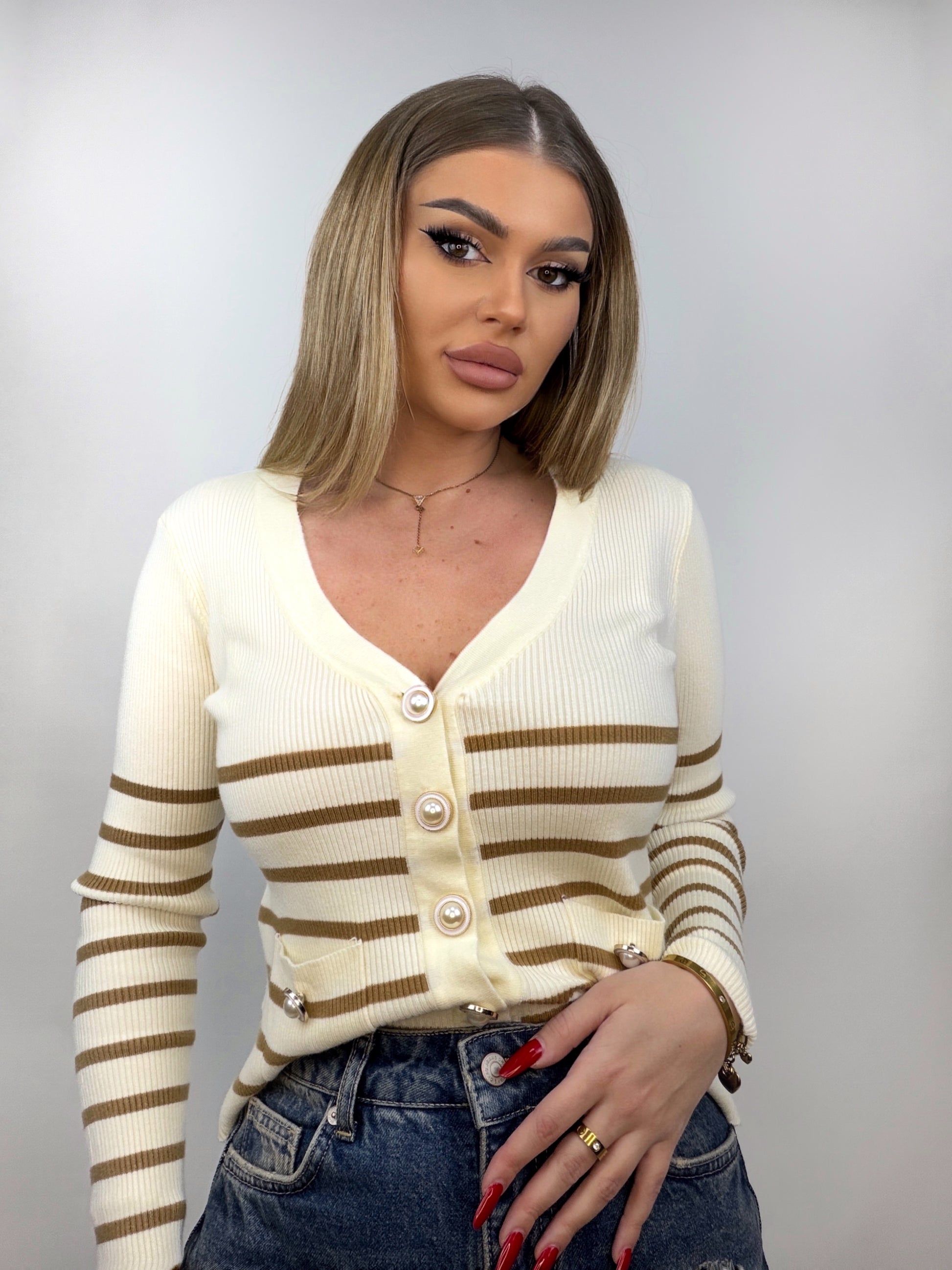 Cardigan de culoare alb-unt, realizat din material elastic, cu linii maro ce îi adaugă contrast și stil. Este prevăzut cu închidere frontală cu nasturi tip perlă și buzunare, având o croială ce permite purtarea lui ca piesă de sine stătătoare în ținută.
