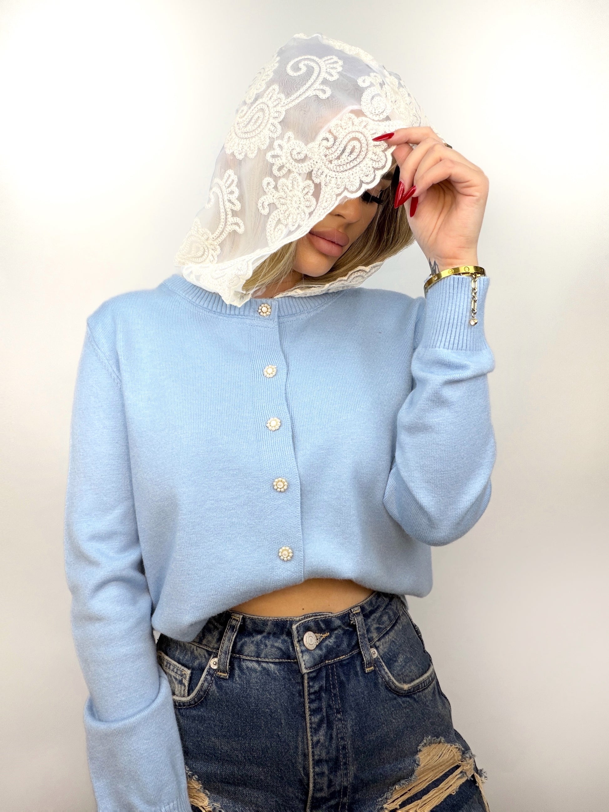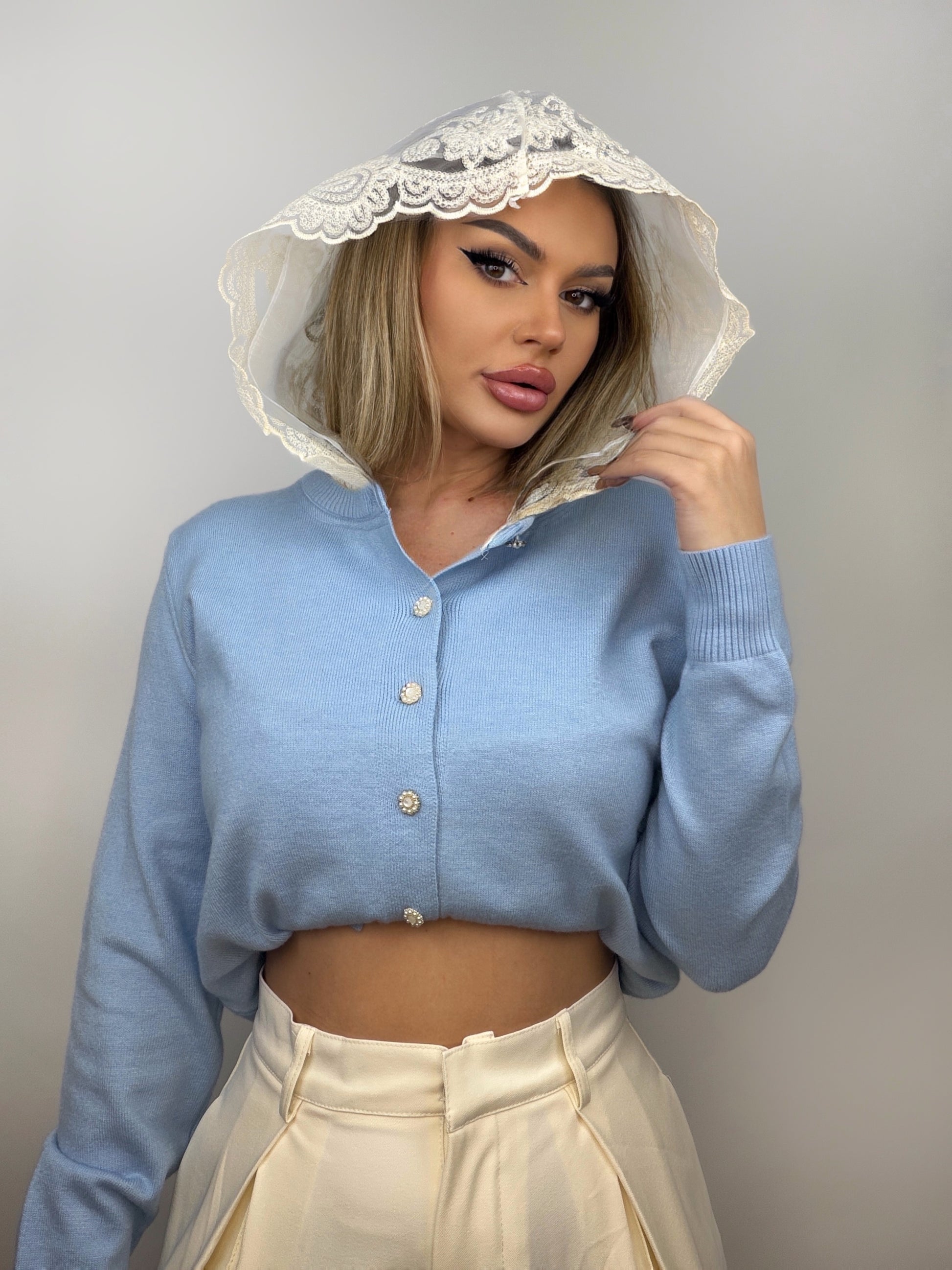 Cardigan albastru din material pufos și elastic, o piesă feminină care poate fi purtată cu ușurință și ca bluză. Se închide cu nasturi în formă de floare, accesorizați cu perlă, oferind un detaliu delicat și elegant. Gluga transparentă, decorată cu un model tip dantelă, adaugă un efect inedit și romantic. Confortabil, versatil și perfect pentru ținutele în care vrei să combini rafinamentul cu un stil jucăuș.