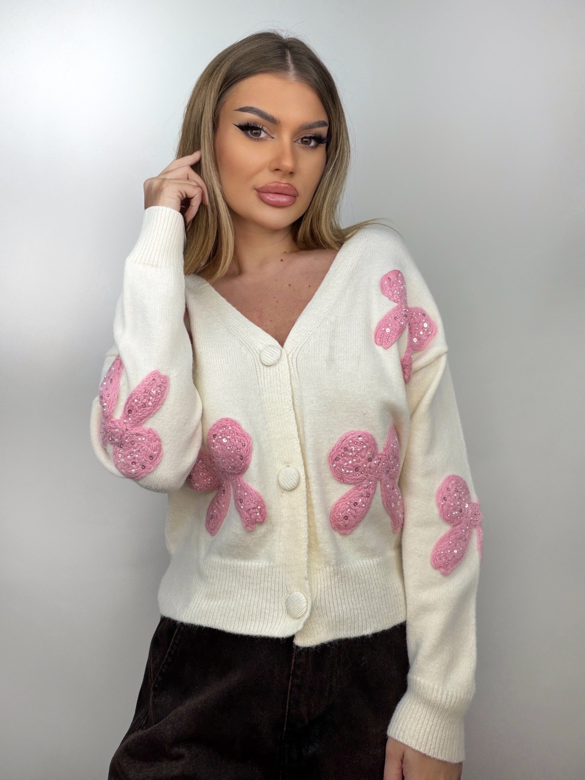 Cardigan din tricot elastic, într-o nuanță caldă de alb-unt, accesorizat cu funde roz cu paiete pentru un touch feminin și jucăuș. Se închide cu nasturi și oferă confort, versatilitate și un plus de rafinament în orice ținută.