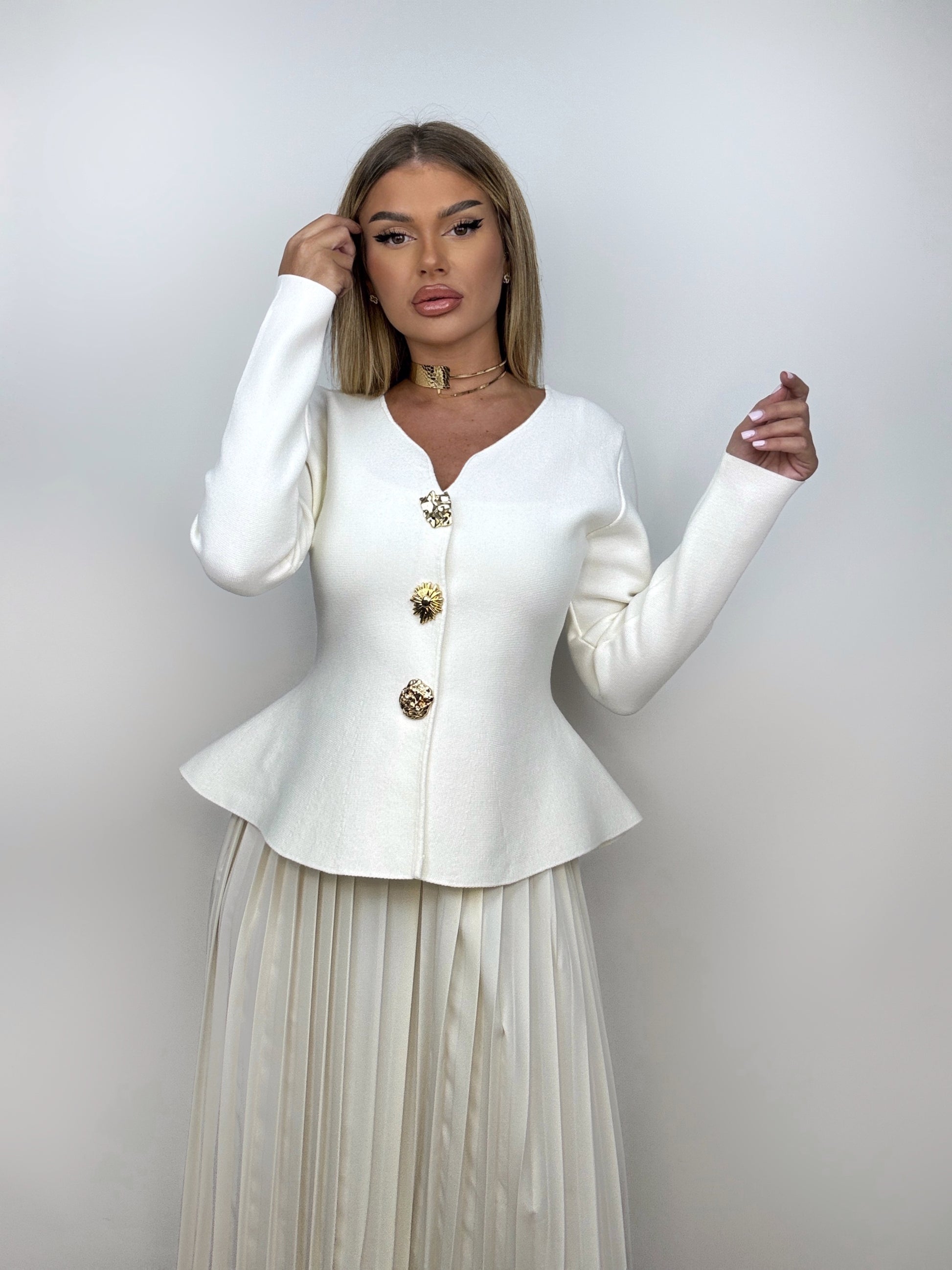 Compleu feminin și elegant, format din rochie lungă cu pliuri și cardigan care evidențiază talia prin croiul său. Detaliile aurii ale nasturilor diferiți și decupajul deosebit de la decolteu adaugă un strop de rafinament și originalitate ținutei.