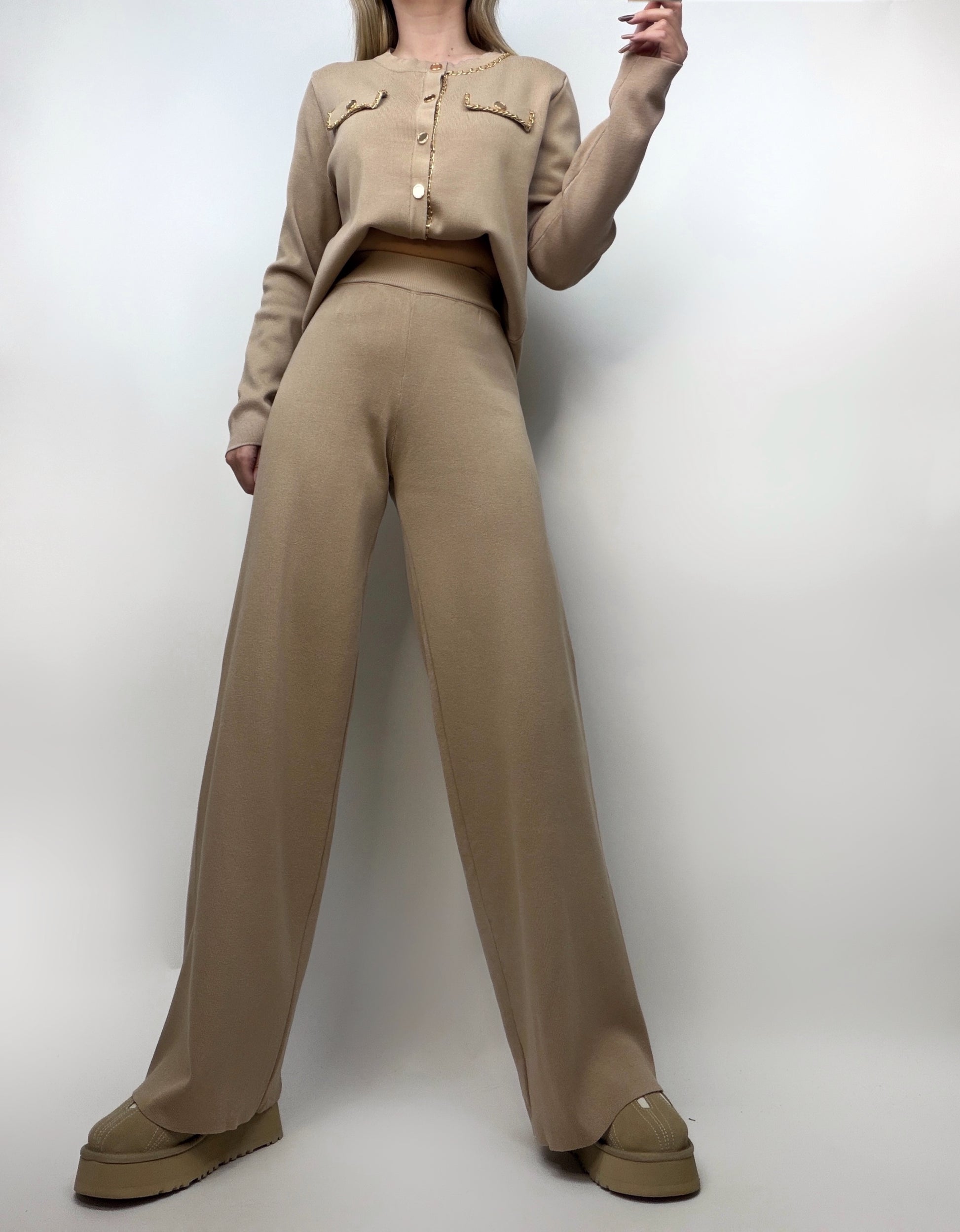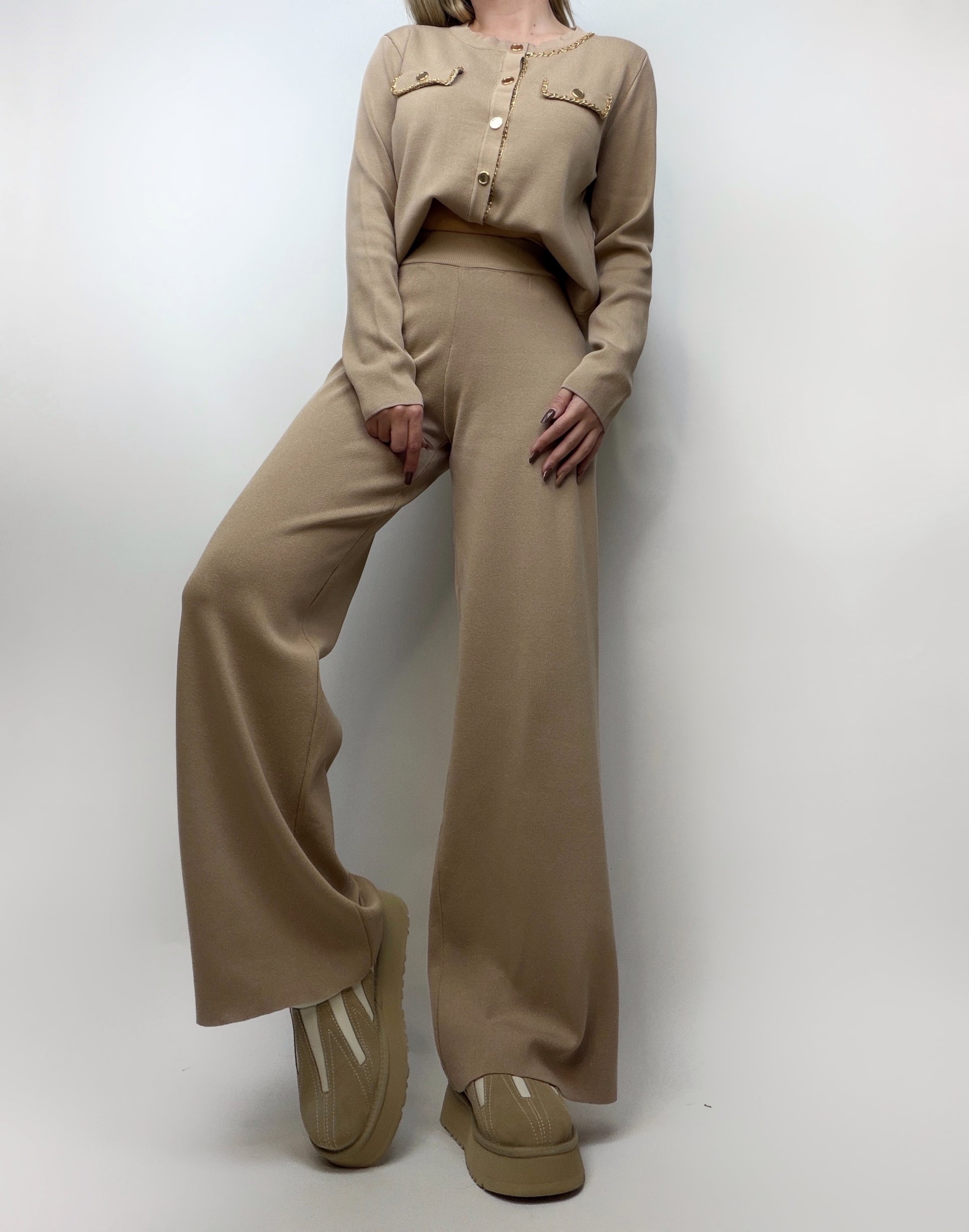 Compleu bej din tricot elastic, format dintr-un cardigan-bluziță cu închidere pe nasturi aurii și accesorizat cu un lanț auriu pentru un plus de eleganță. Pantalonul evazat completează perfect look-ul, oferind o siluetă modernă și feminină. Un set confortabil, stilat și ușor de purtat, ideal pentru ținute chic de zi cu zi.