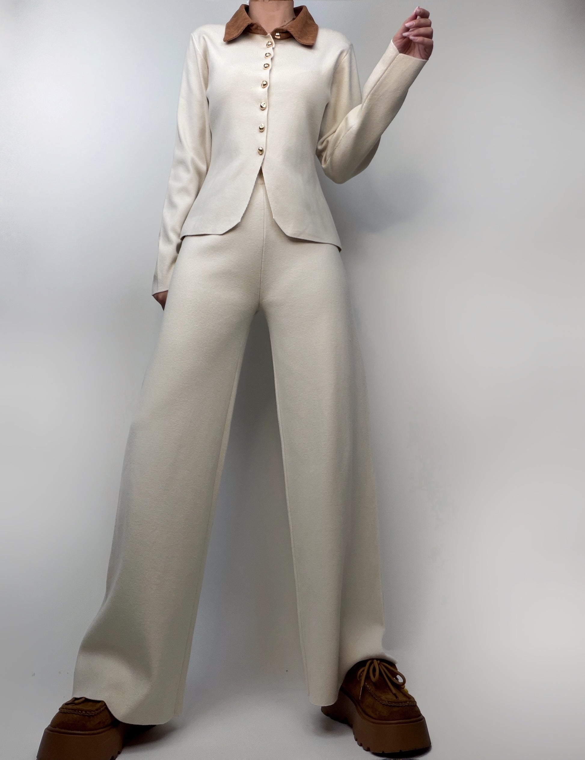 Compleu bej confecționat din material elastic din tricot, format din pantaloni evazați și un cardigan care poate fi purtat și ca bluziță. Cardiganul este accesorizat cu nasturi aurii și guler maro, adăugând un detaliu elegant și sofisticat întregii ținute. Un set versatil și confortabil, perfect pentru look-uri casual-chic sau ocazii speciale.