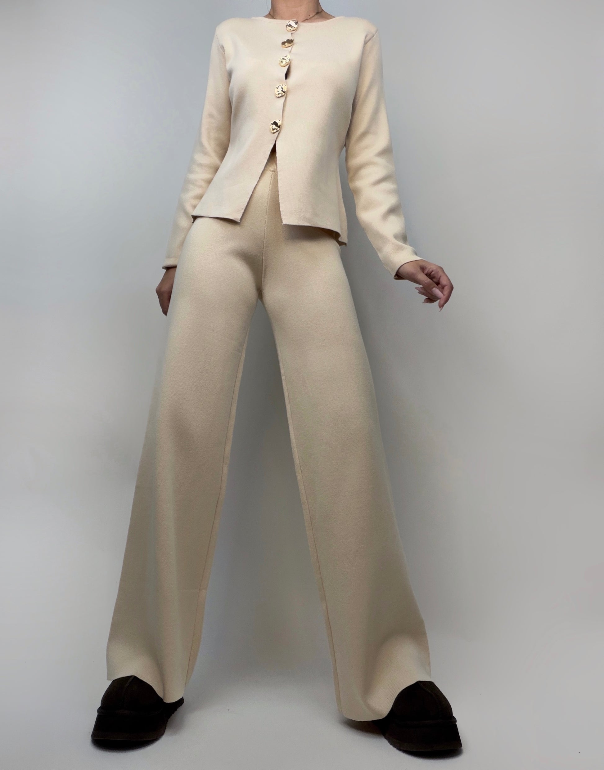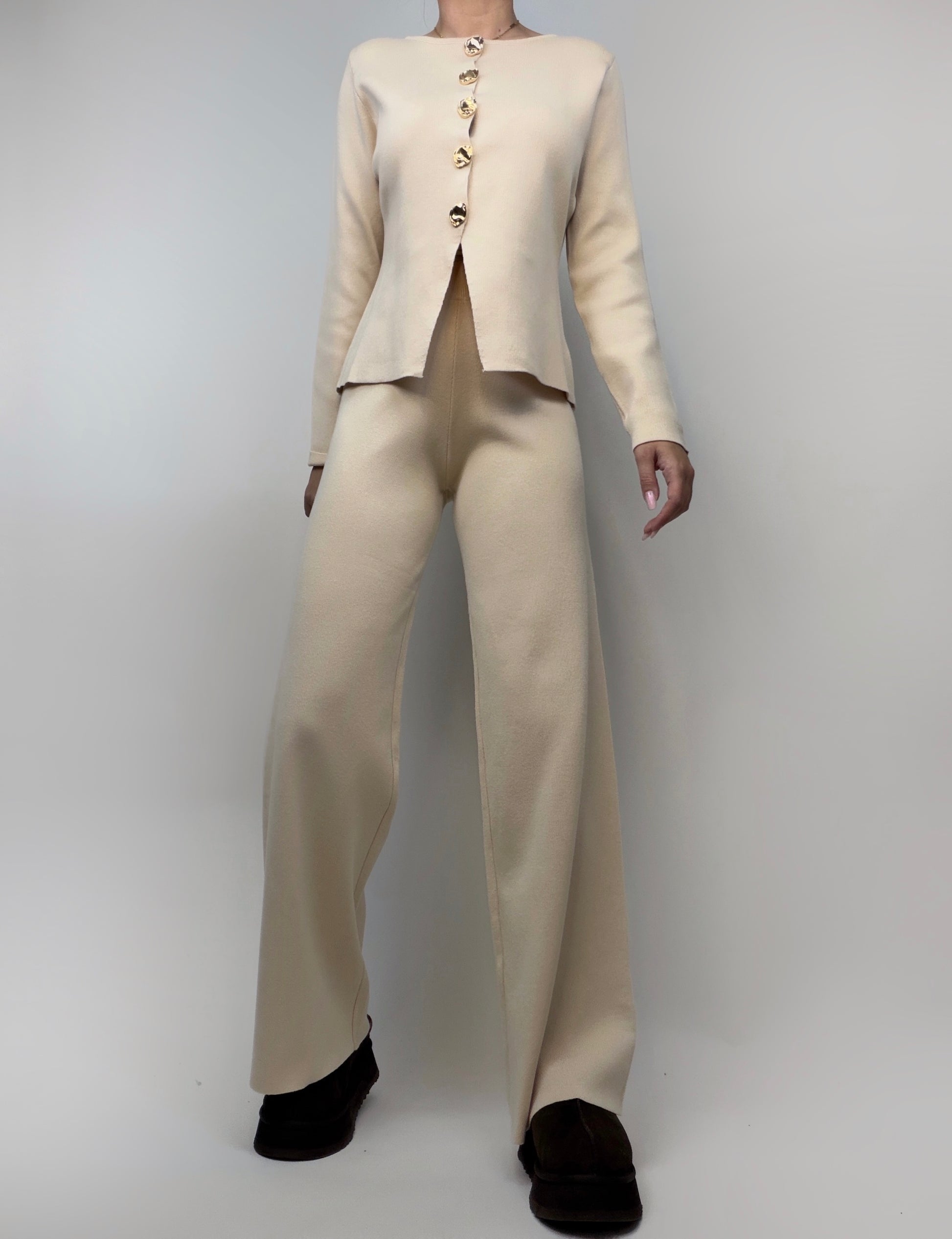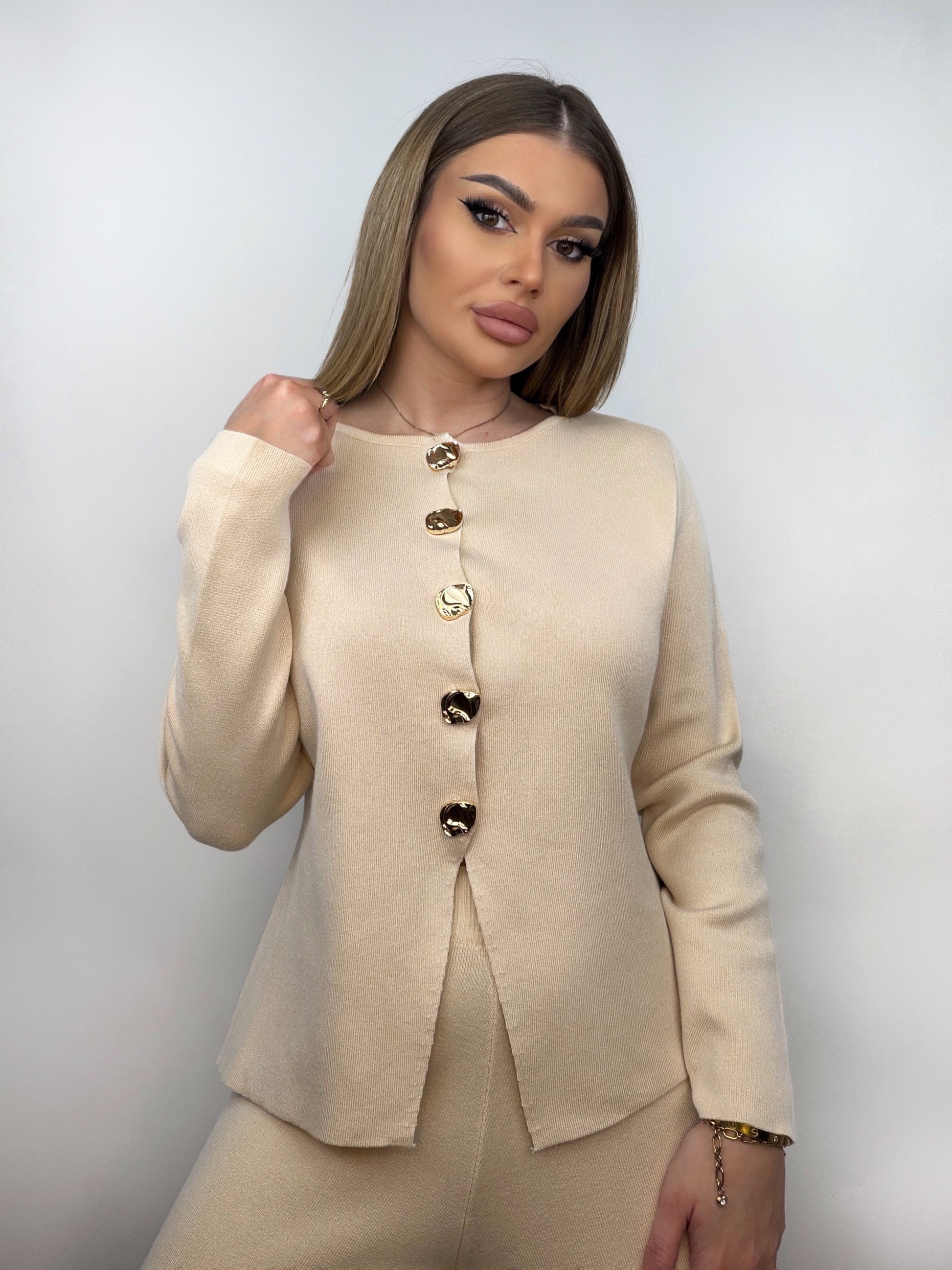 Compleu format din pantalon evazat și cardigan care poate fi purtat și ca bluză, confecționat dintr-un material elastic, confortabil și plăcut la purtare. Cardiganul are închidere cu nasturi aurii și o crăpătură subtilă în partea frontală de jos, adăugând un detaliu modern și elegant întregii ținute. Un set versatil, ideal pentru look-uri casual-chic sau office.