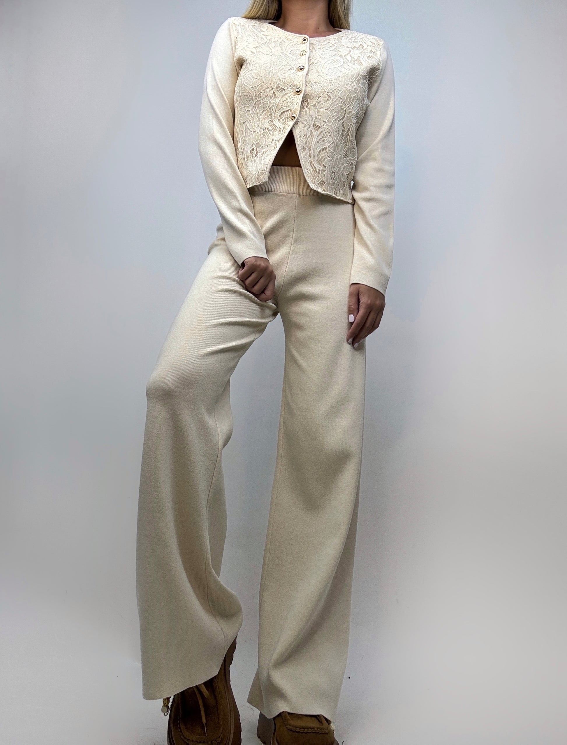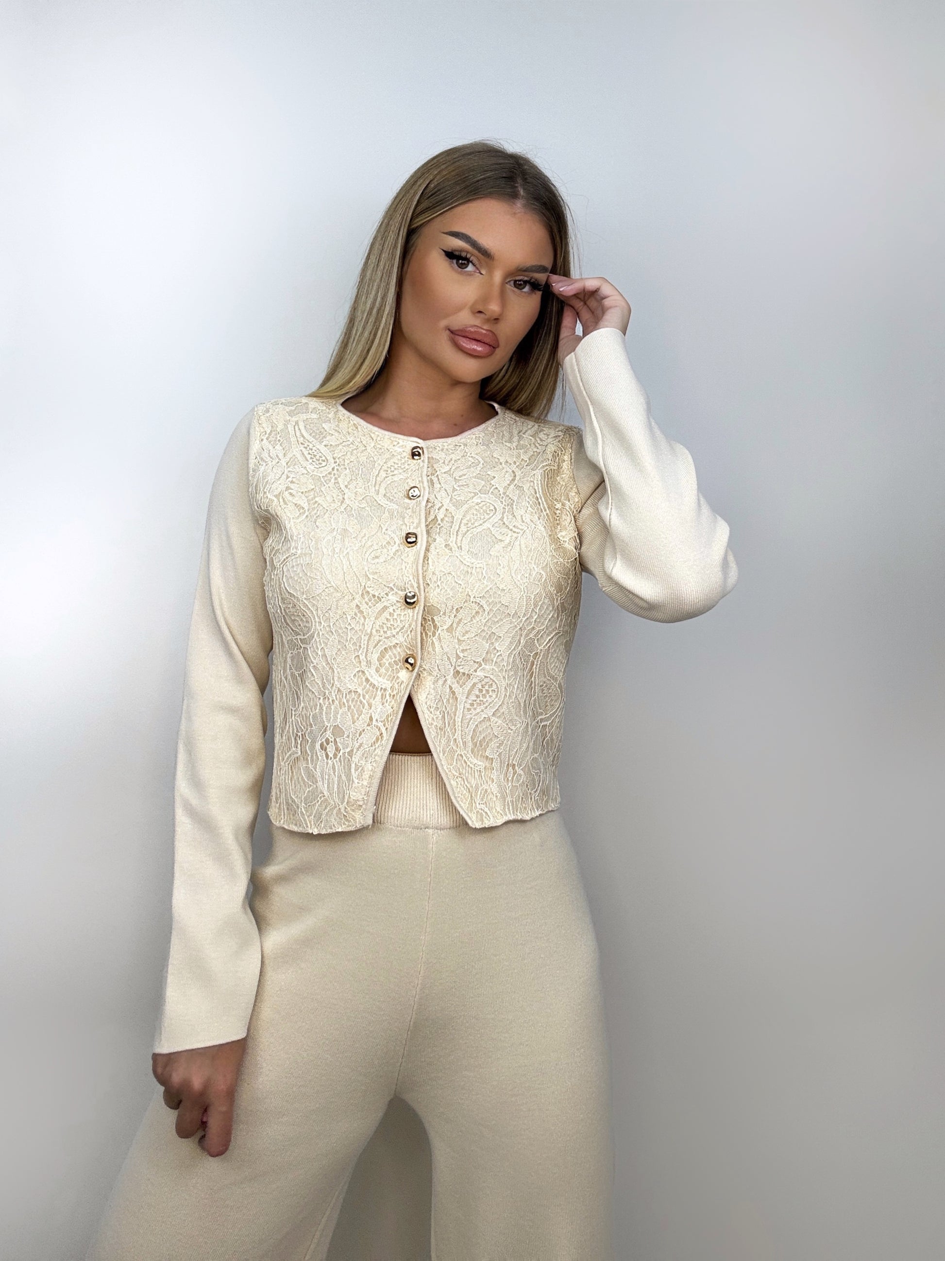 Compleul beige din material elastic combină eleganța cu confortul. Cardiganul, cu decupaj frontal, dantelă delicată și nasturi aurii, se asortează perfect cu pantalonii evazați cu talie înaltă, creând un look sofisticat și feminin, cu detalii rafinate care ies subtil în evidență.