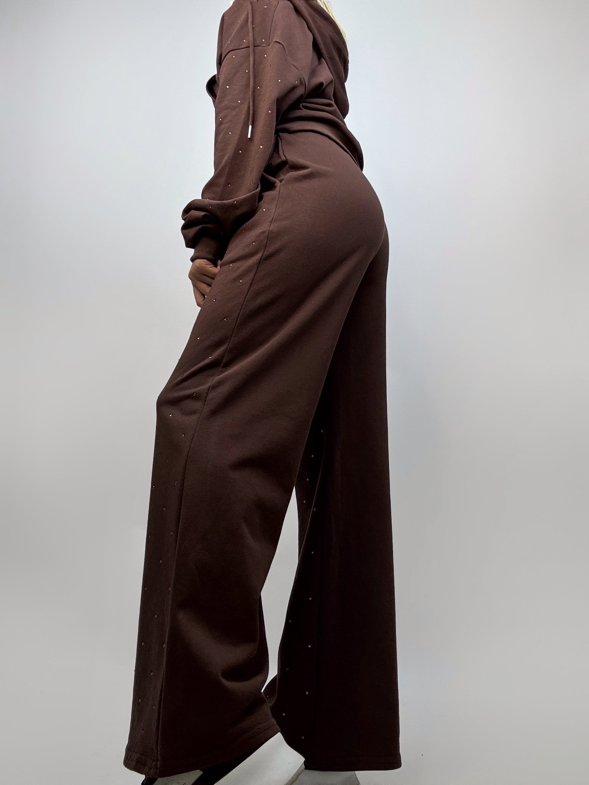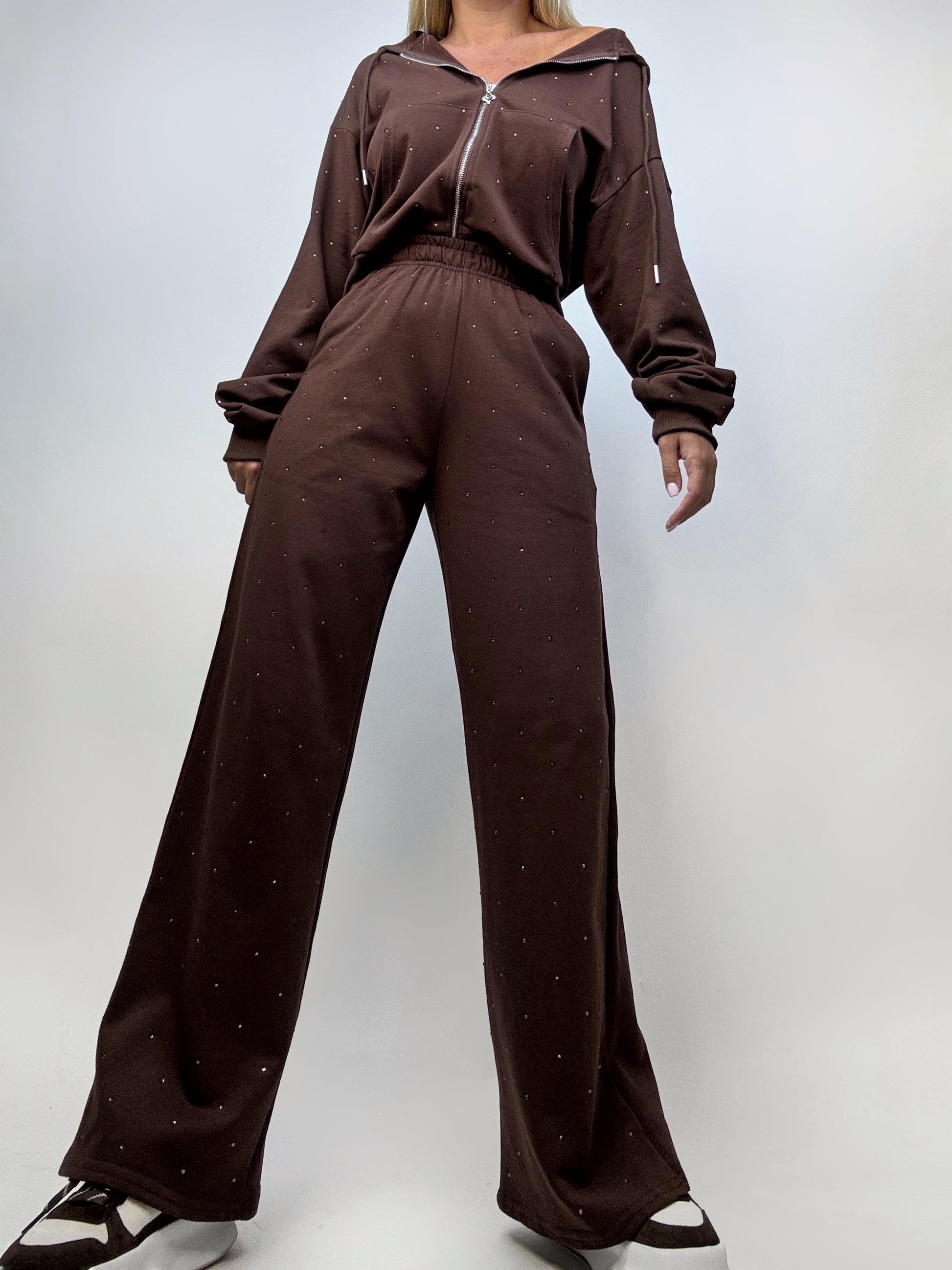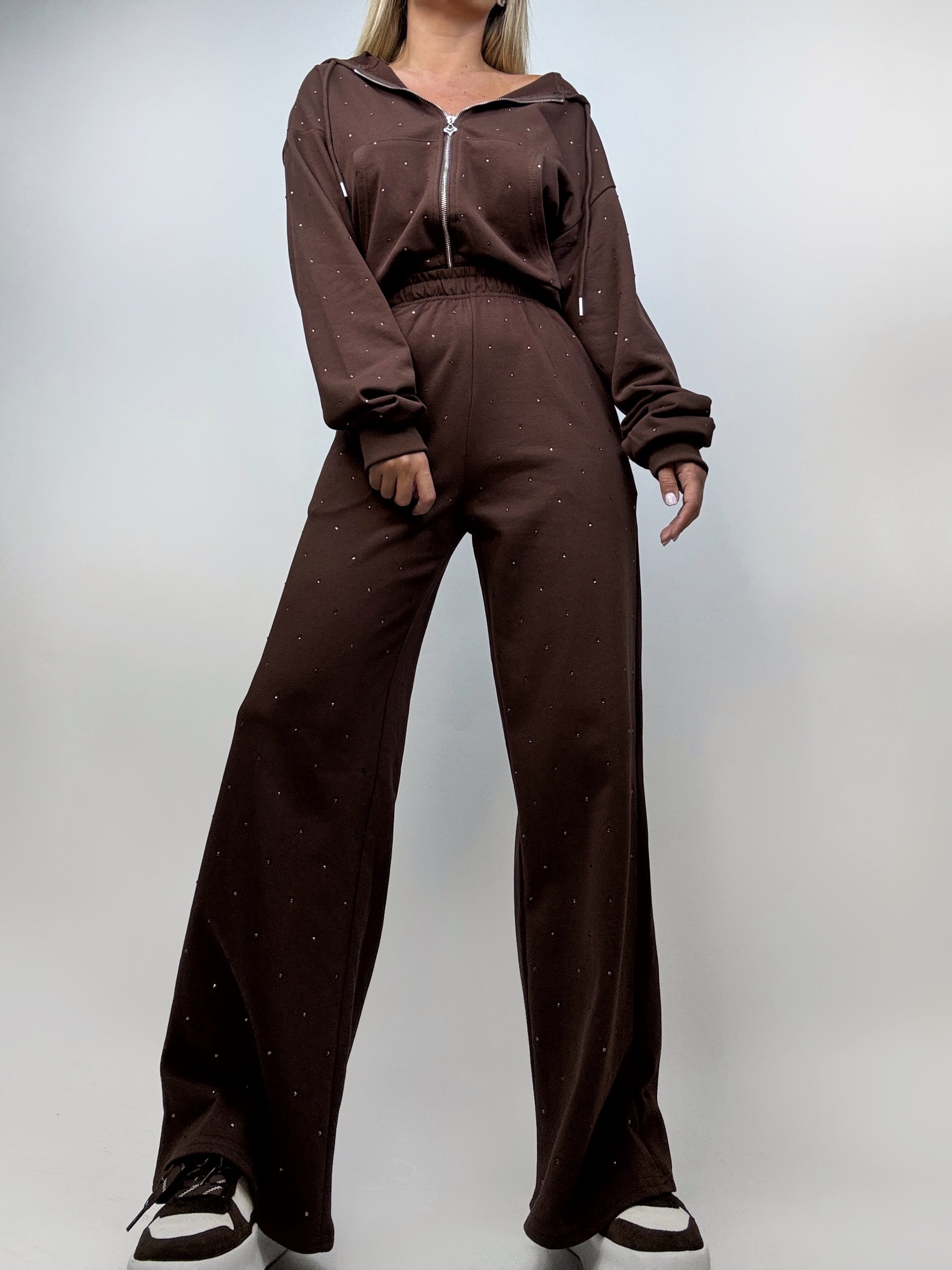 Compleu format din hanorac cu fermoar, glugă și buzunare generoase, și pantaloni largi cu talie elastică pentru confort maxim. Materialul elastic se mulează ușor pe corp, iar ștrasurile maro adaugă o notă subtilă de strălucire, transformând o ținută relaxată într-un look modern și sofisticat.