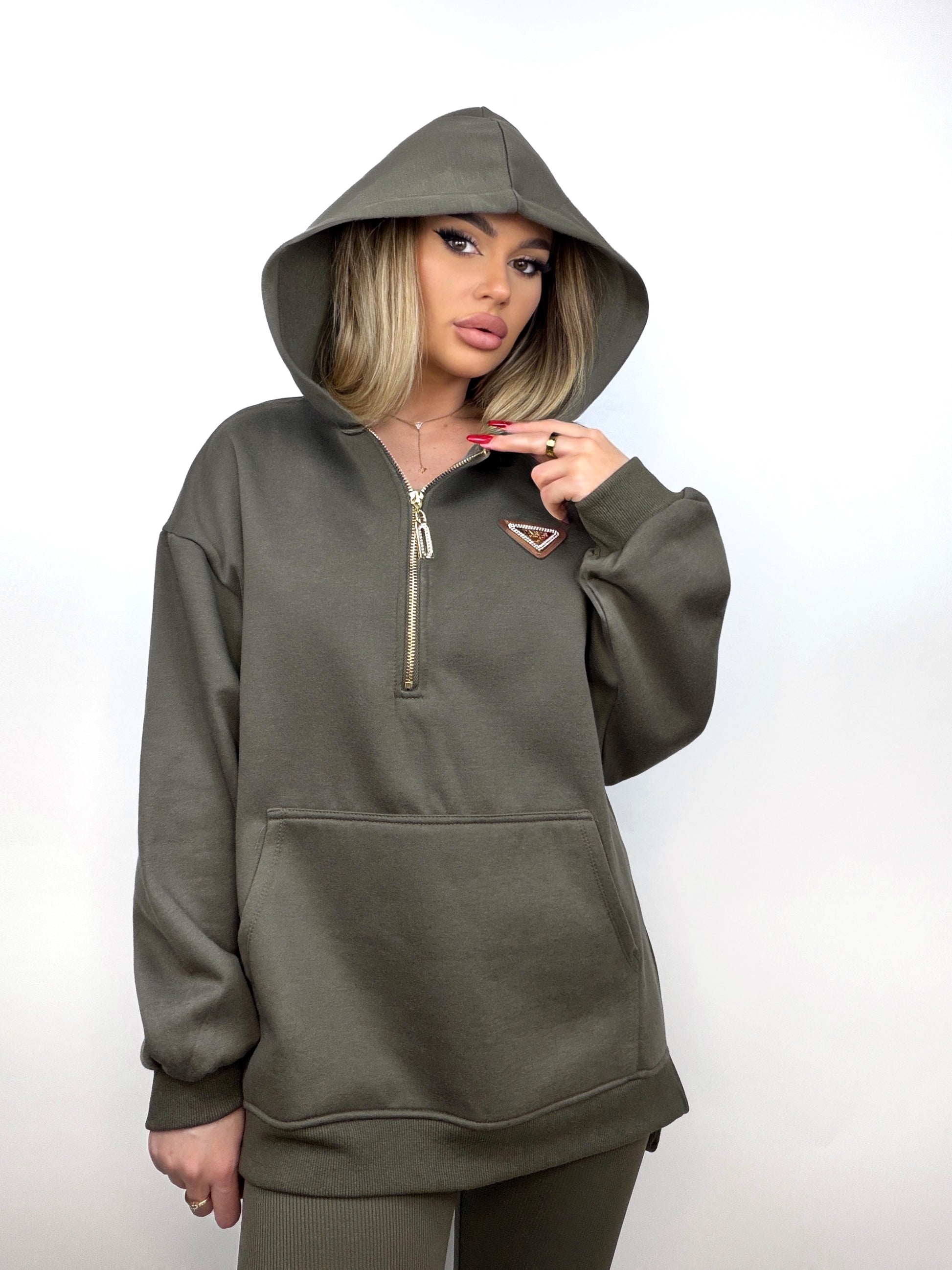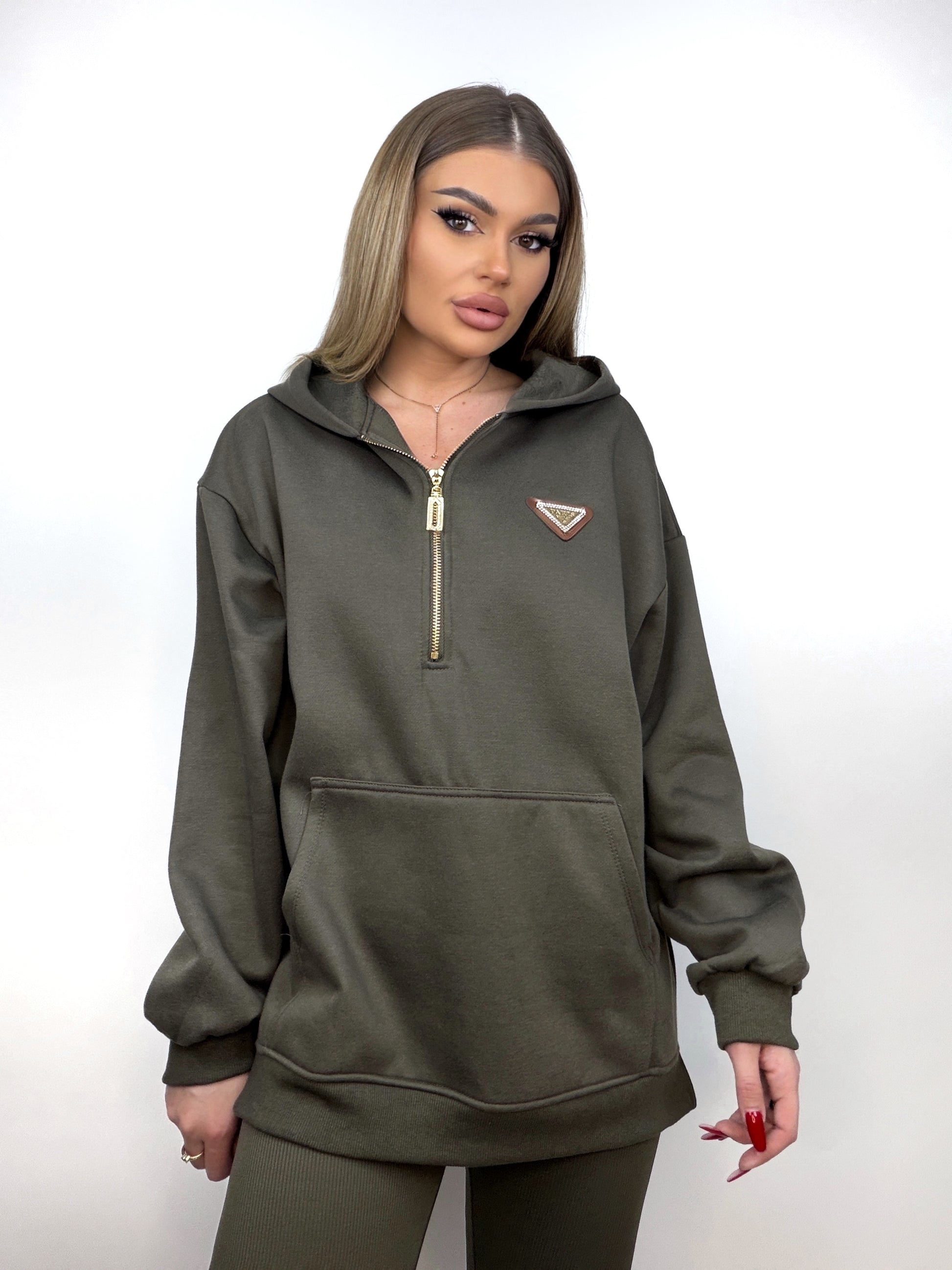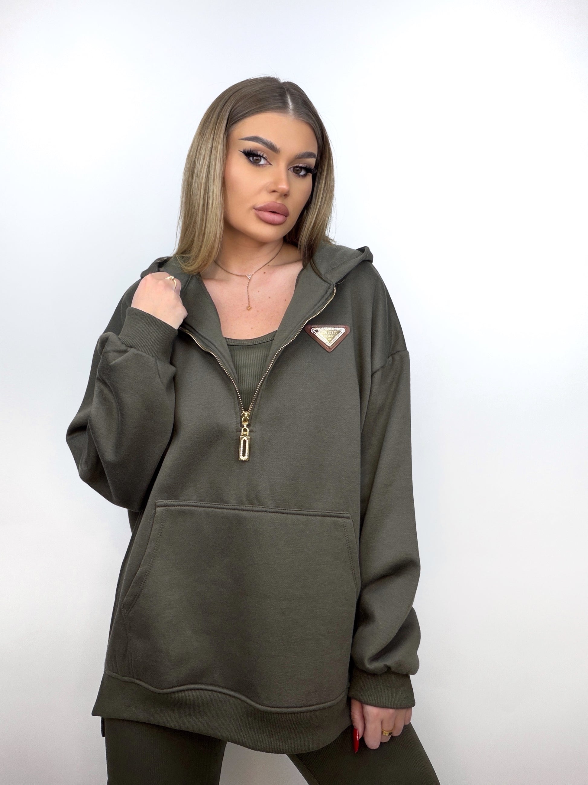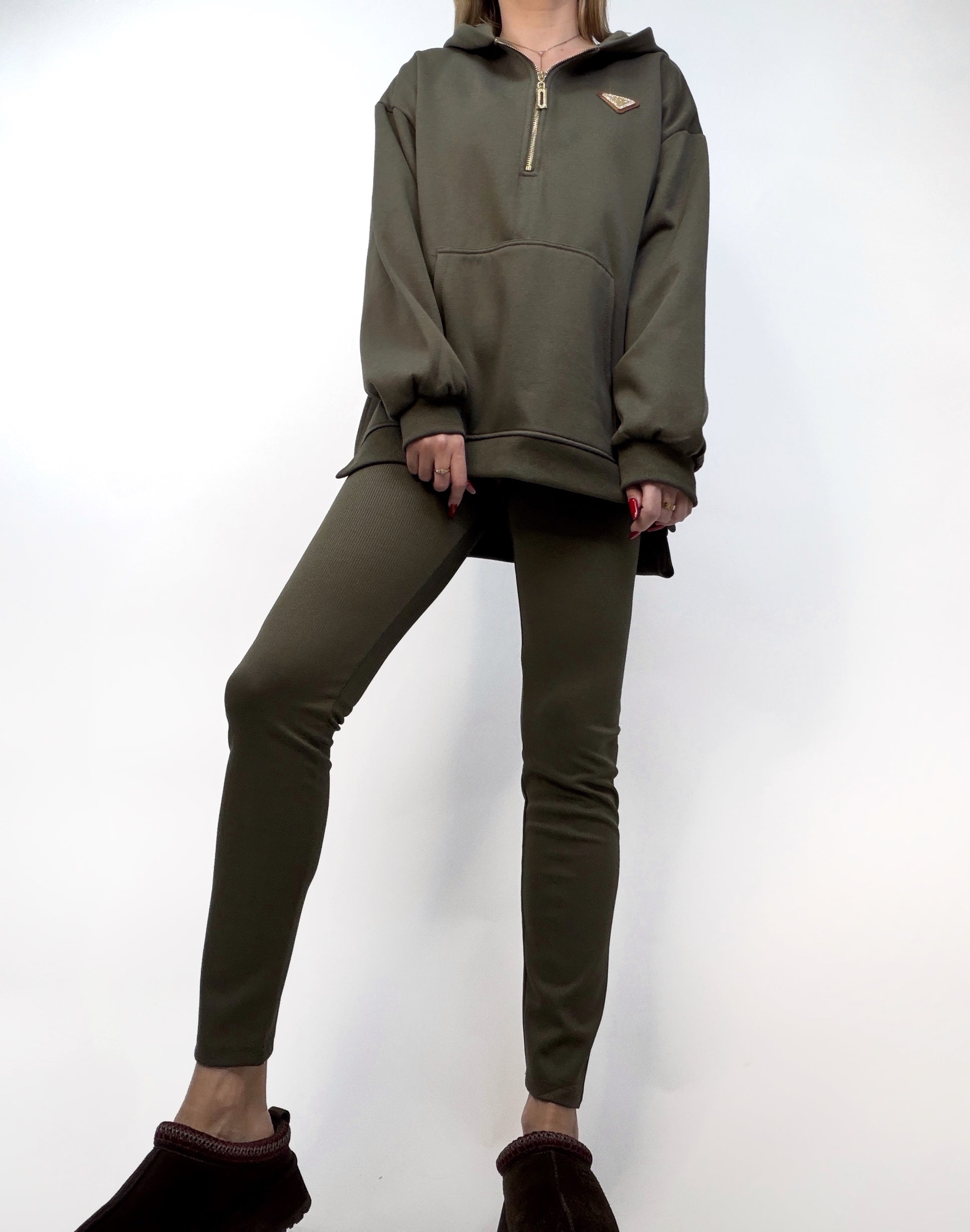 Compleu kaki format din trei piese: colant, maieu și hanorac, toate confecționate din material elastic, confortabil și lejer. Hanoracul oversized este prevăzut cu buzunar frontal, glugă și decolteu ajustabil cu fermoar, oferind libertate de mișcare și multiple moduri de purtare, pentru un look relaxat și modern.