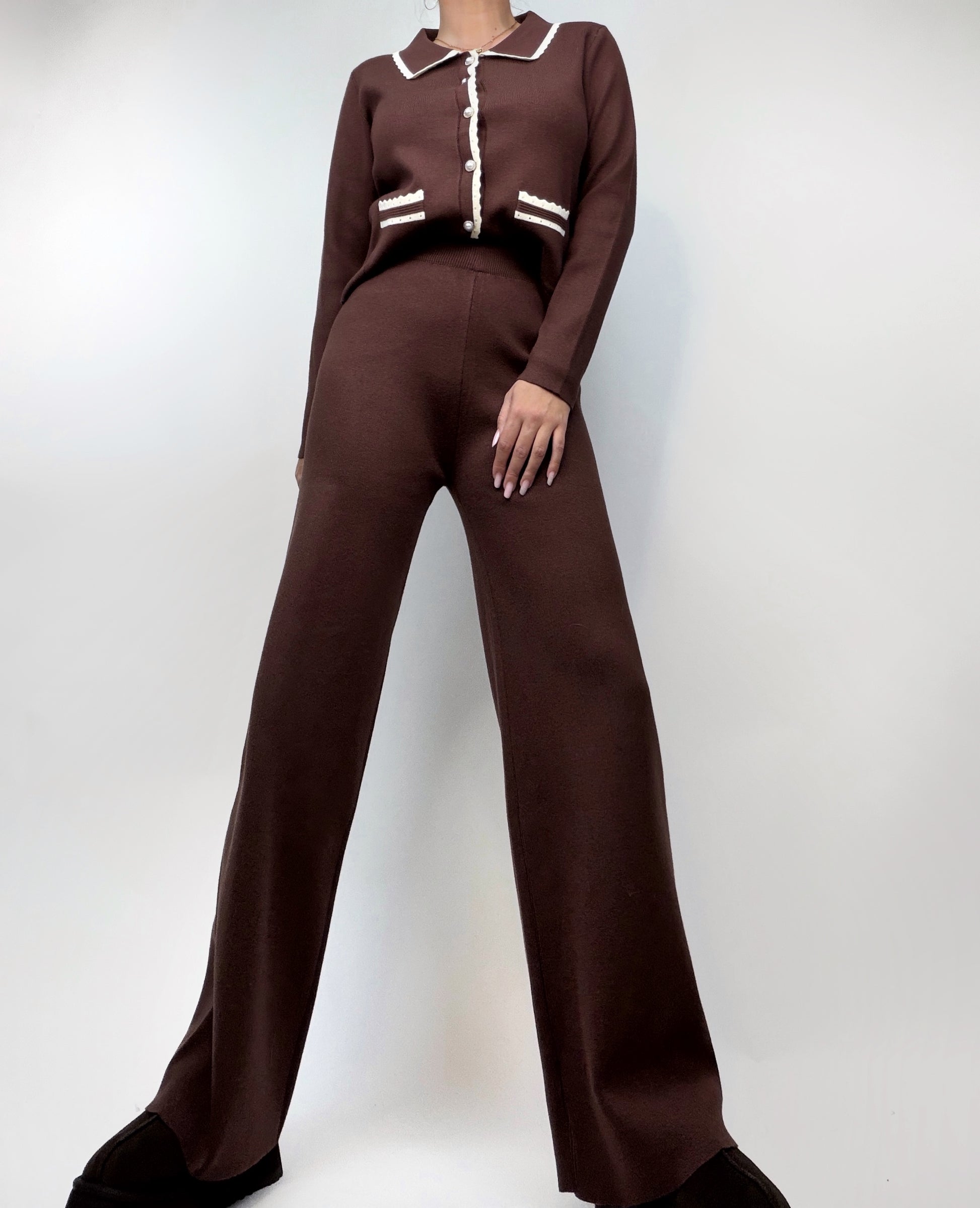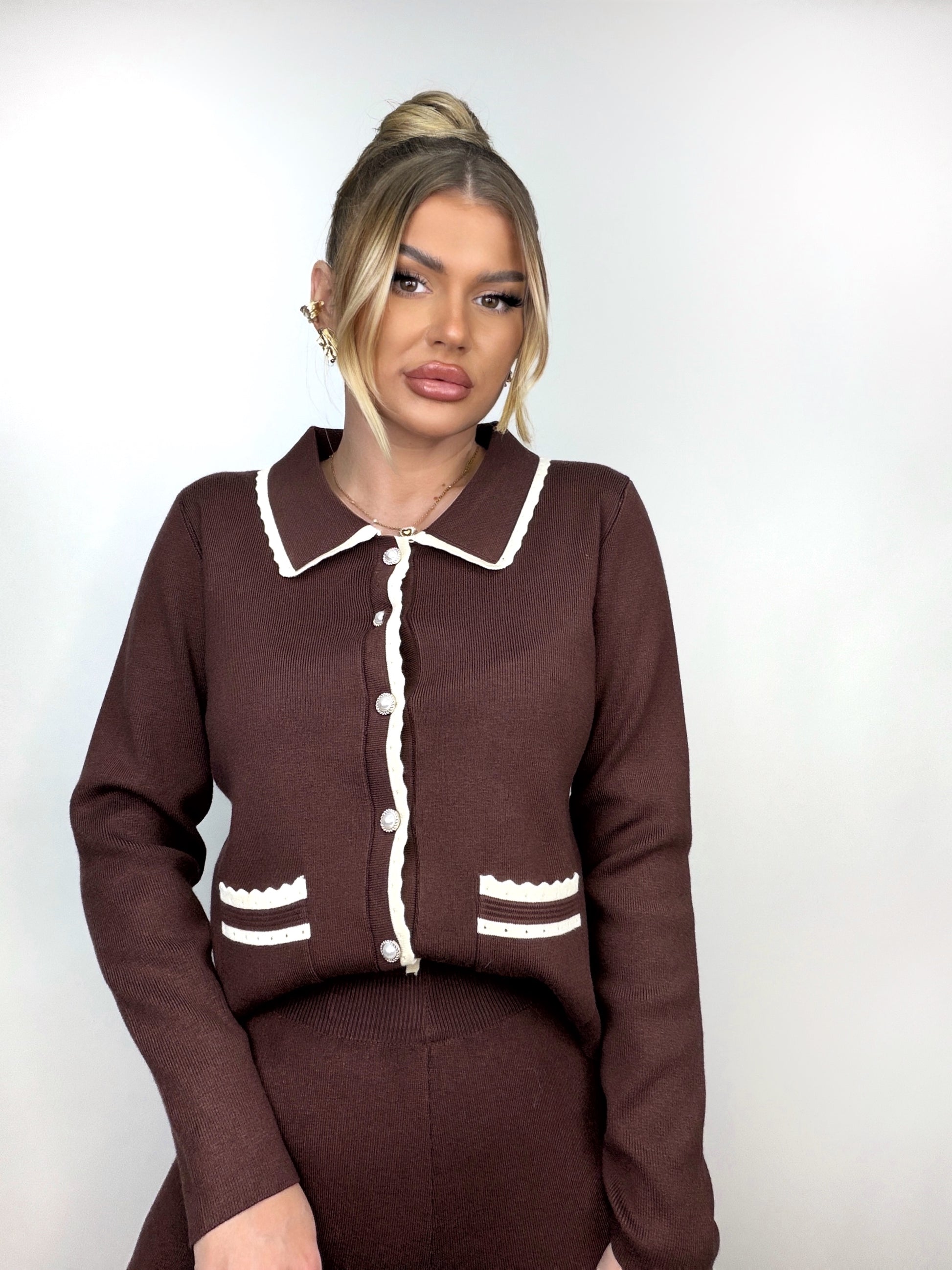 Compleu din tricot moale, în nuanță caldă de maro, compus din pantaloni evazați și cardigan ce poate fi purtat și ca bluză. Liniile fine albe, gulerul elegant și nasturii tip perlă adaugă un aer sofisticat și feminin, perfect pentru un look rafinat de zi sau de seară.