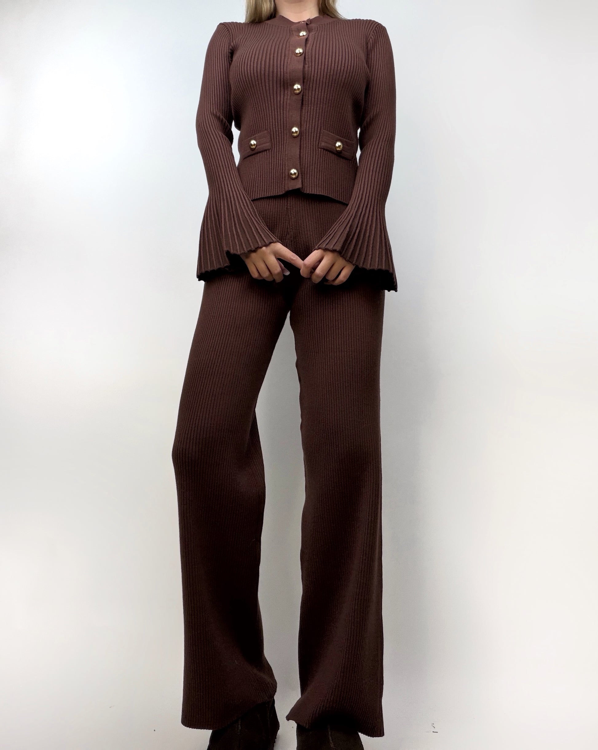 Compleu din tricot elastic, în nuanță de maro, format dintr-un cardigan cu croială feminină, care arată impecabil purtat și bluză. Este accesorizat cu nasturi rotunzi aurii și mâneci clopoțel pentru un plus de rafinament. Pantalonii evazați completează armonios setul, oferind un look modern, confortabil și ușor de purtat.
