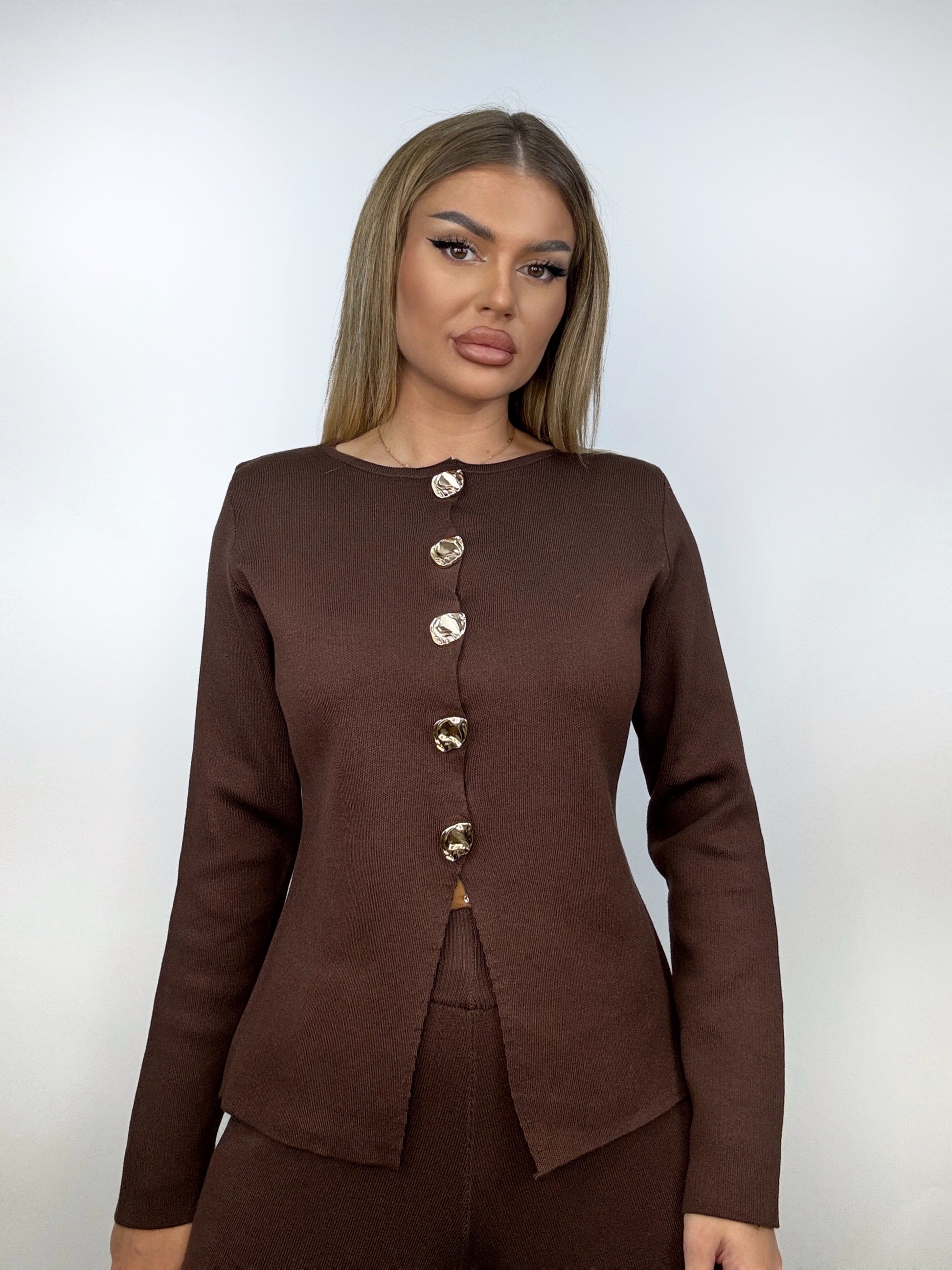 Compleu format din pantalon evazat și cardigan care poate fi purtat și ca bluză, confecționat dintr-un material elastic, confortabil și plăcut la purtare. Cardiganul are închidere cu nasturi aurii și o crăpătură subtilă în partea frontală de jos, adăugând un detaliu modern și elegant întregii ținute. Un set versatil, ideal pentru look-uri casual-chic sau office.