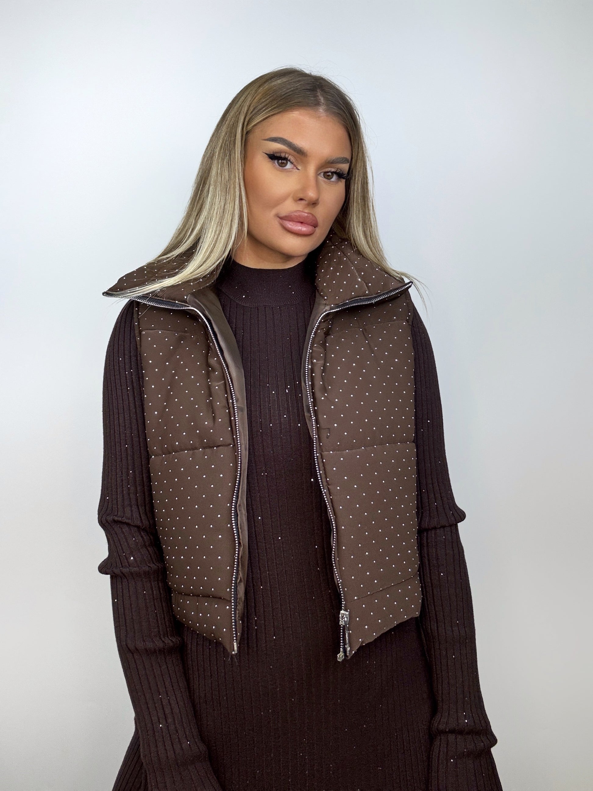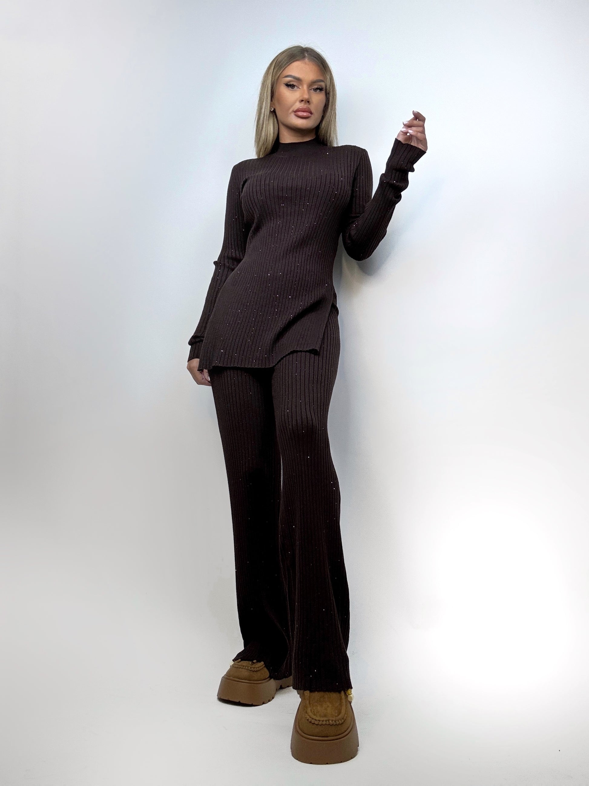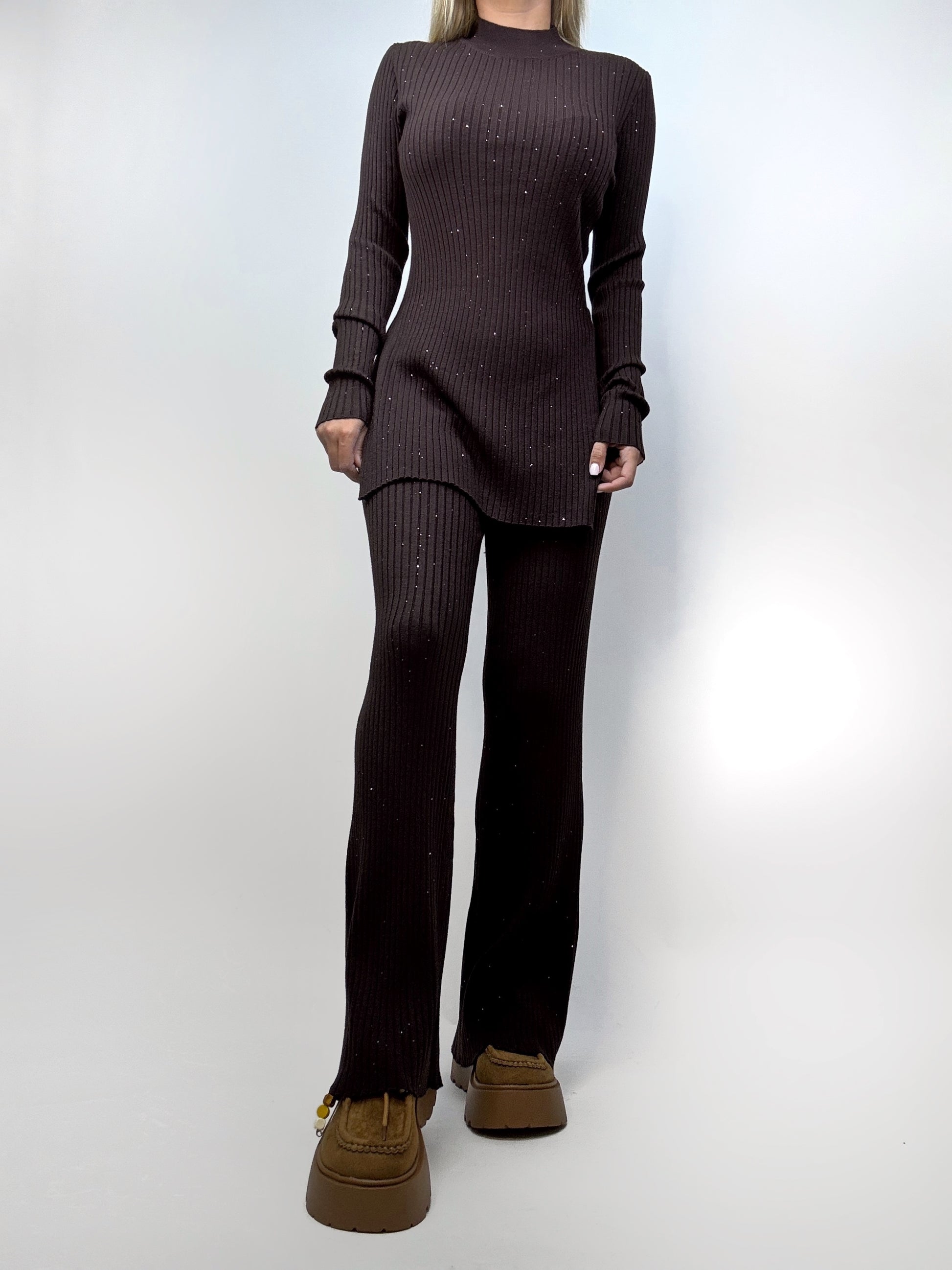 Compleu maro, format din bluză lungă cu decupaje laterale și pantaloni evazați cu talie înaltă. Material elastic, confortabil, accesorizat cu paiete discrete care adaugă un strop de strălucire.