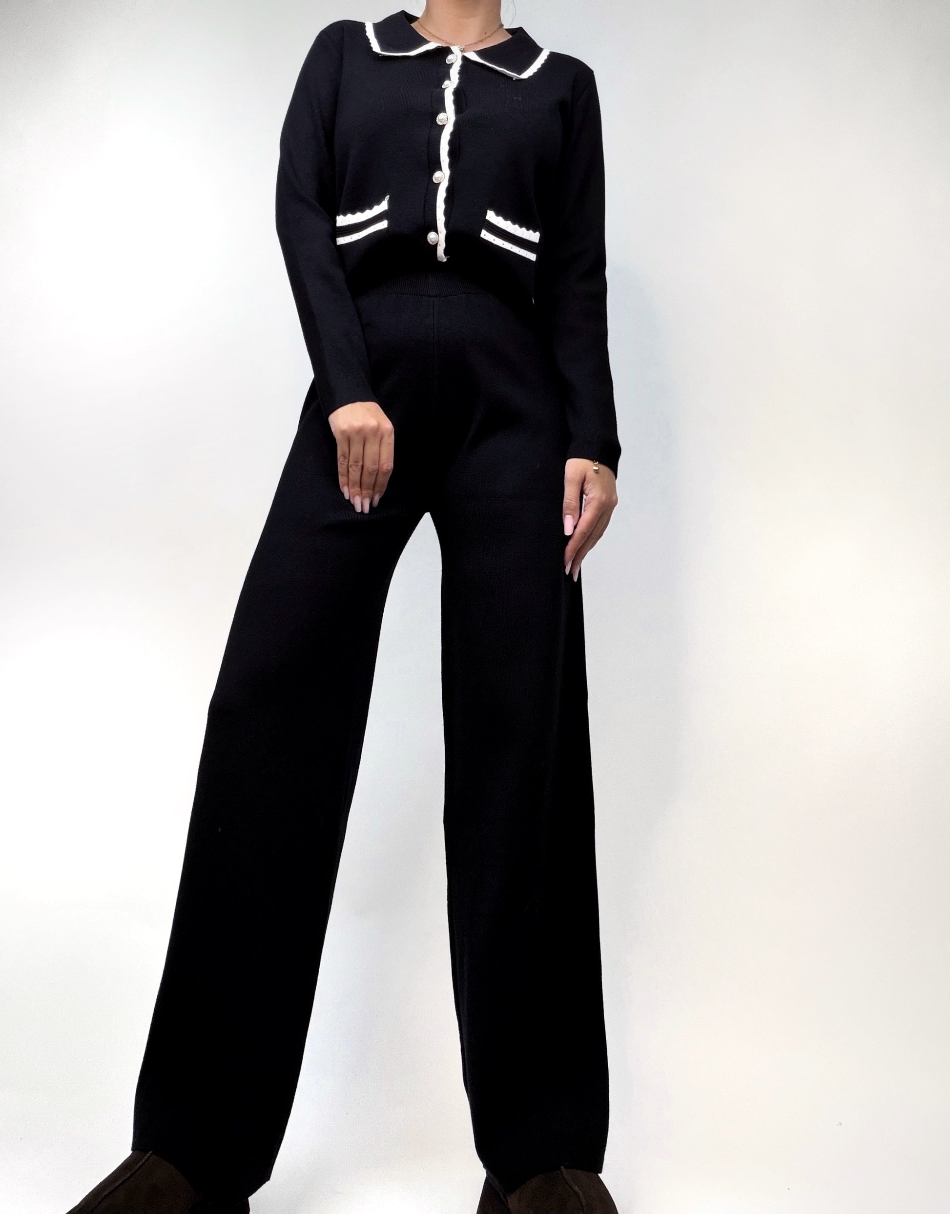 Compleu din tricot moale, în nuanță de negru, compus din pantaloni evazați și cardigan ce poate fi purtat și ca bluză. Liniile fine albe, gulerul elegant și nasturii tip perlă adaugă un aer sofisticat și feminin, perfect pentru un look rafinat de zi sau de seară.