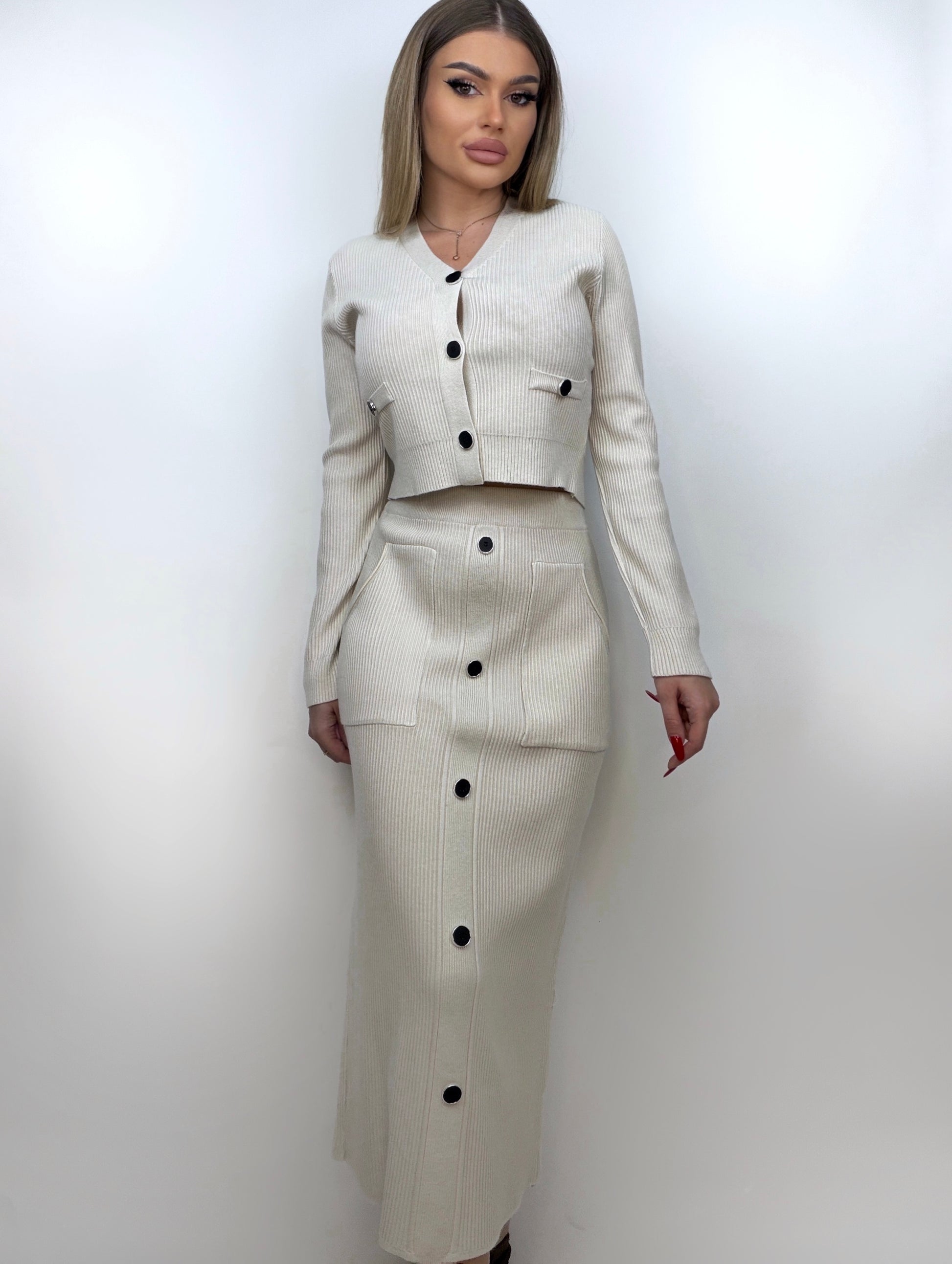 Feminin și versatil, acest compleu din tricot de culoare bej este alegerea ideală pentru un look elegant și confortabil. Fusta midi, cu bandă elastică în talie și buzunare practice, se îmbină perfect cu jacheta scurtă, ambele accesorizate cu nasturi negri pentru un contrast sofisticat. Confectionat dintr-un material fin și elastic, acest set oferă libertate de mișcare și un stil impecabil pentru orice ocazie.