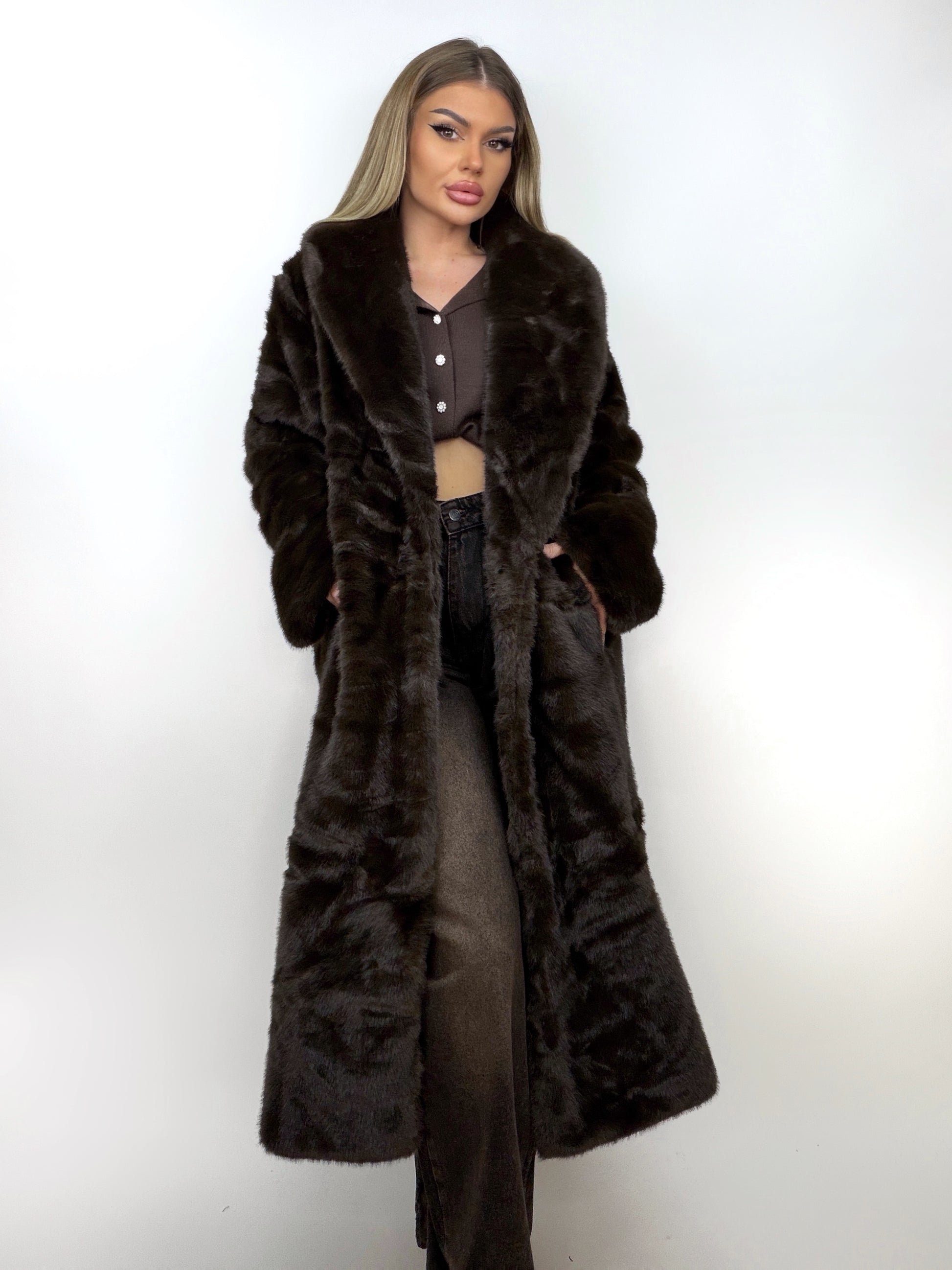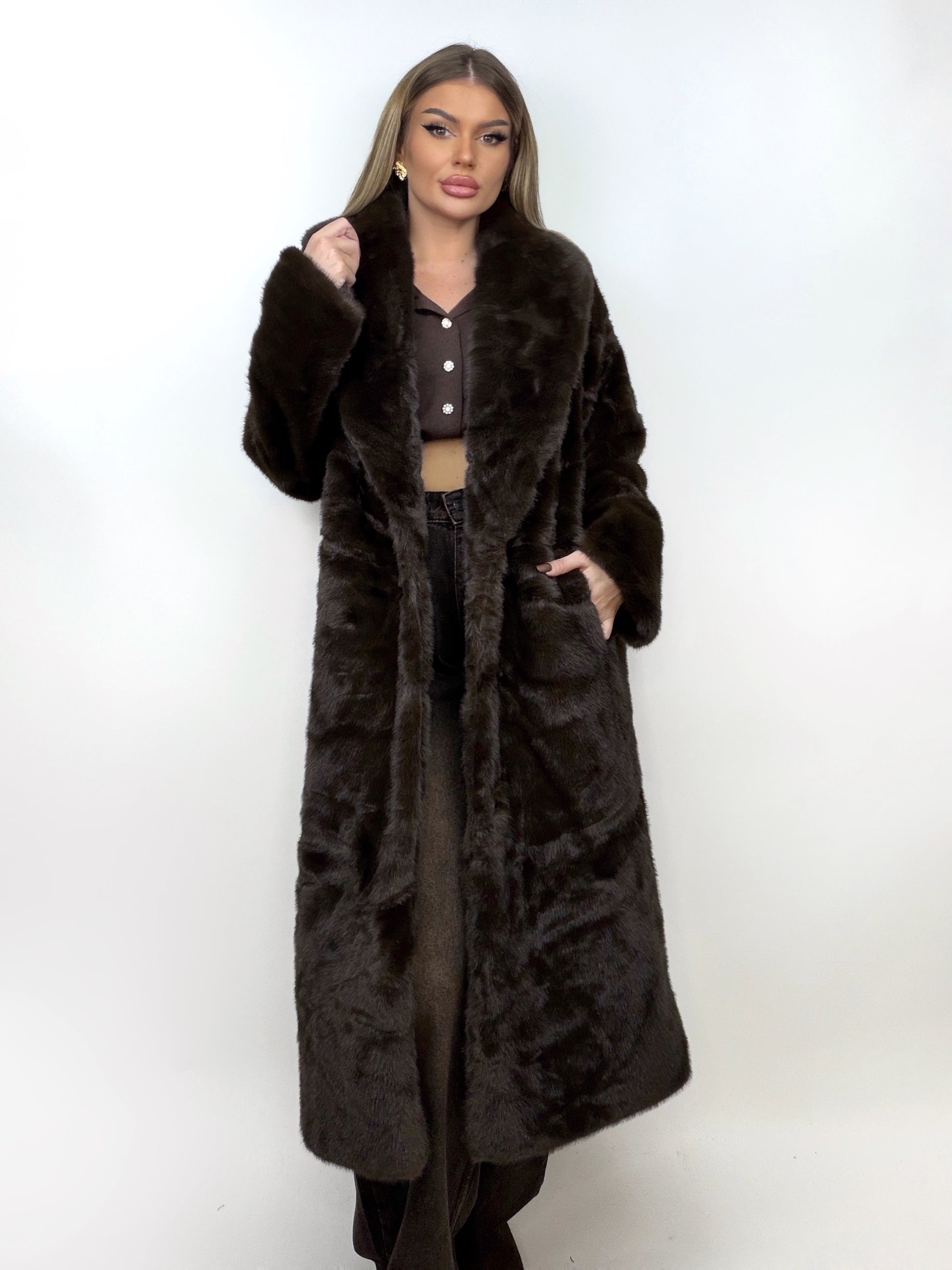 Haină de blană lungă, trei sferturi, extrem de pufoasă și moale la atingere. Accesorizată cu buzunare și guler, combină confortul termic cu un look elegant și sofisticat, ideală pentru zilele reci.