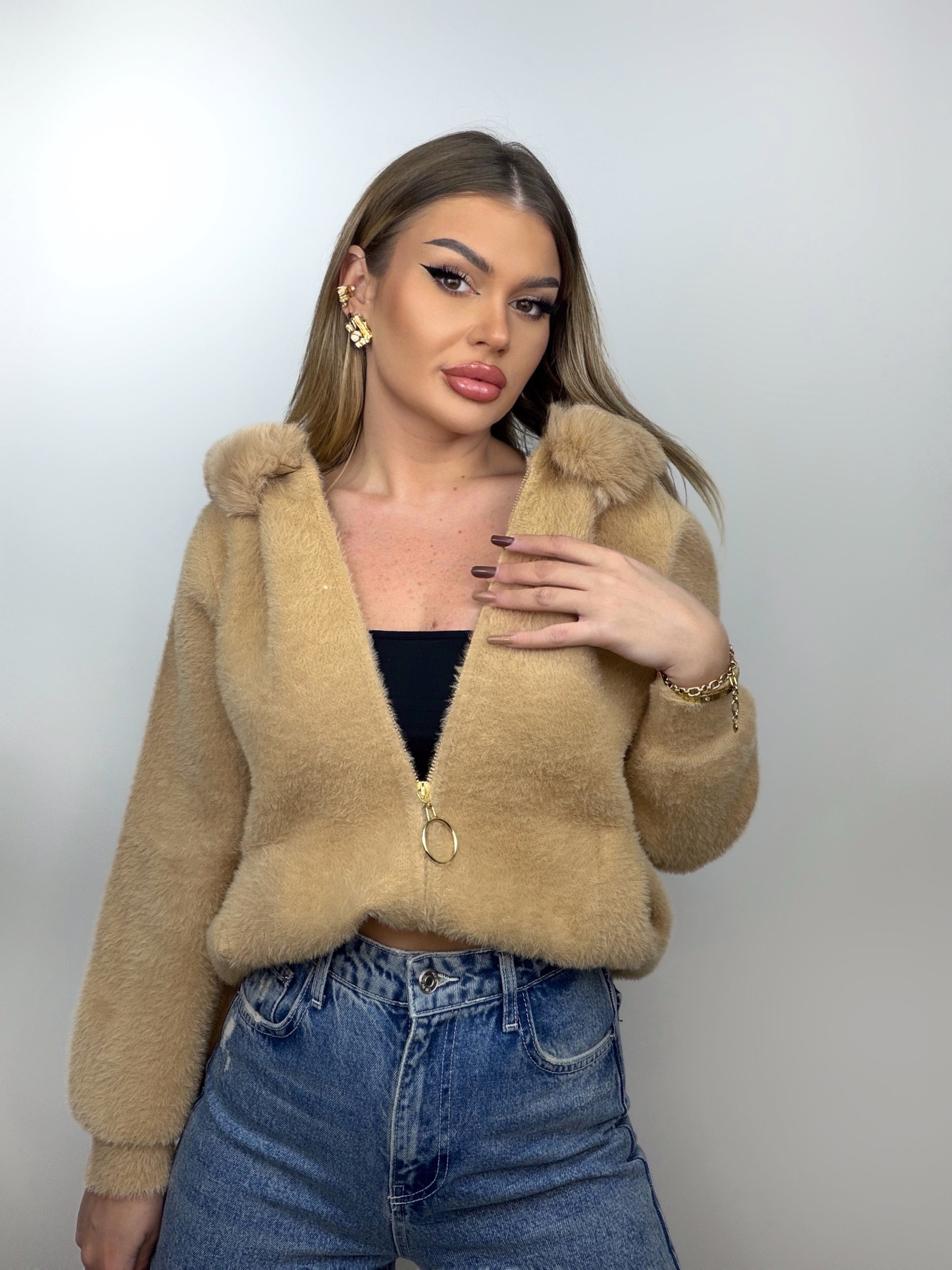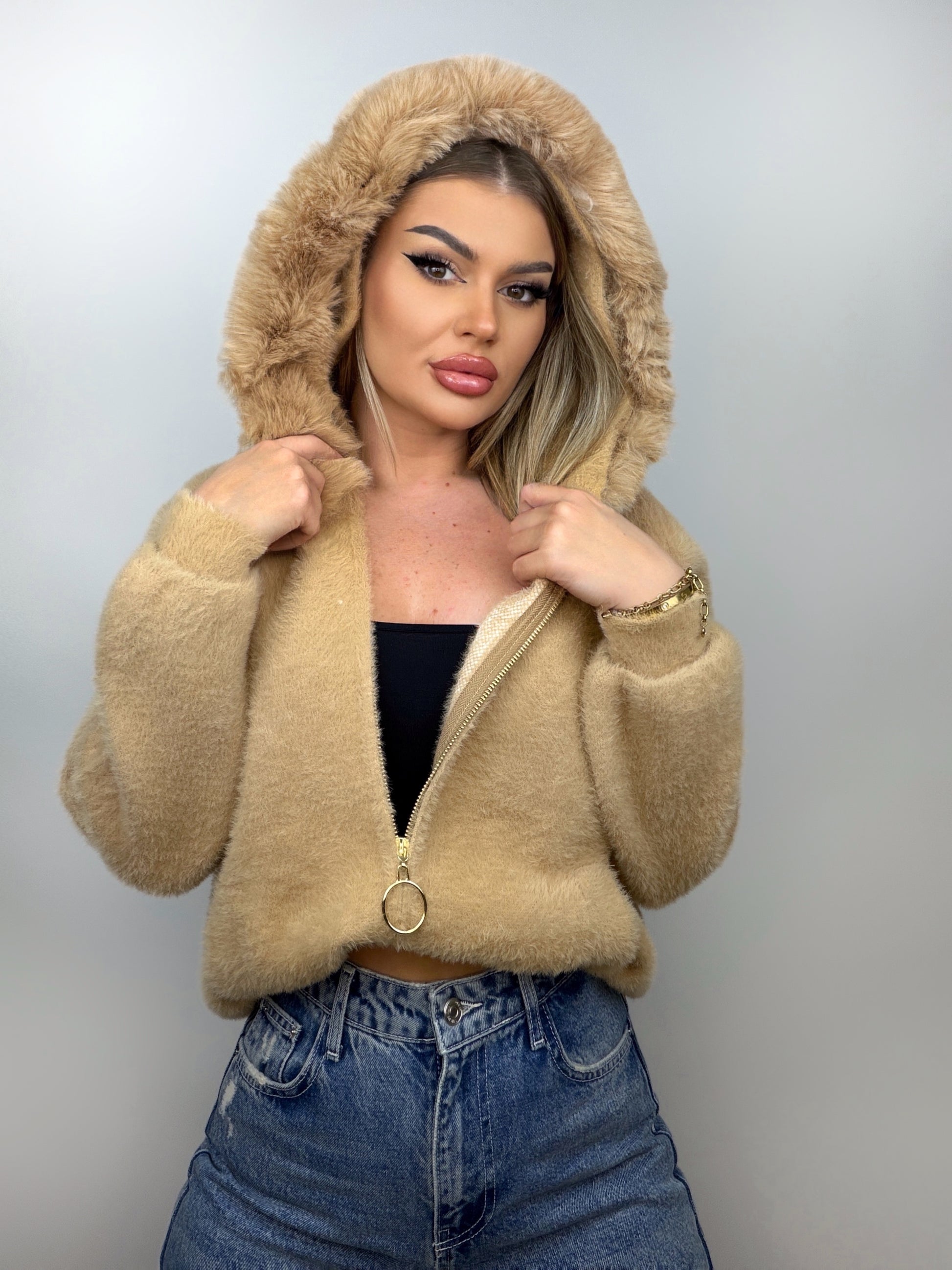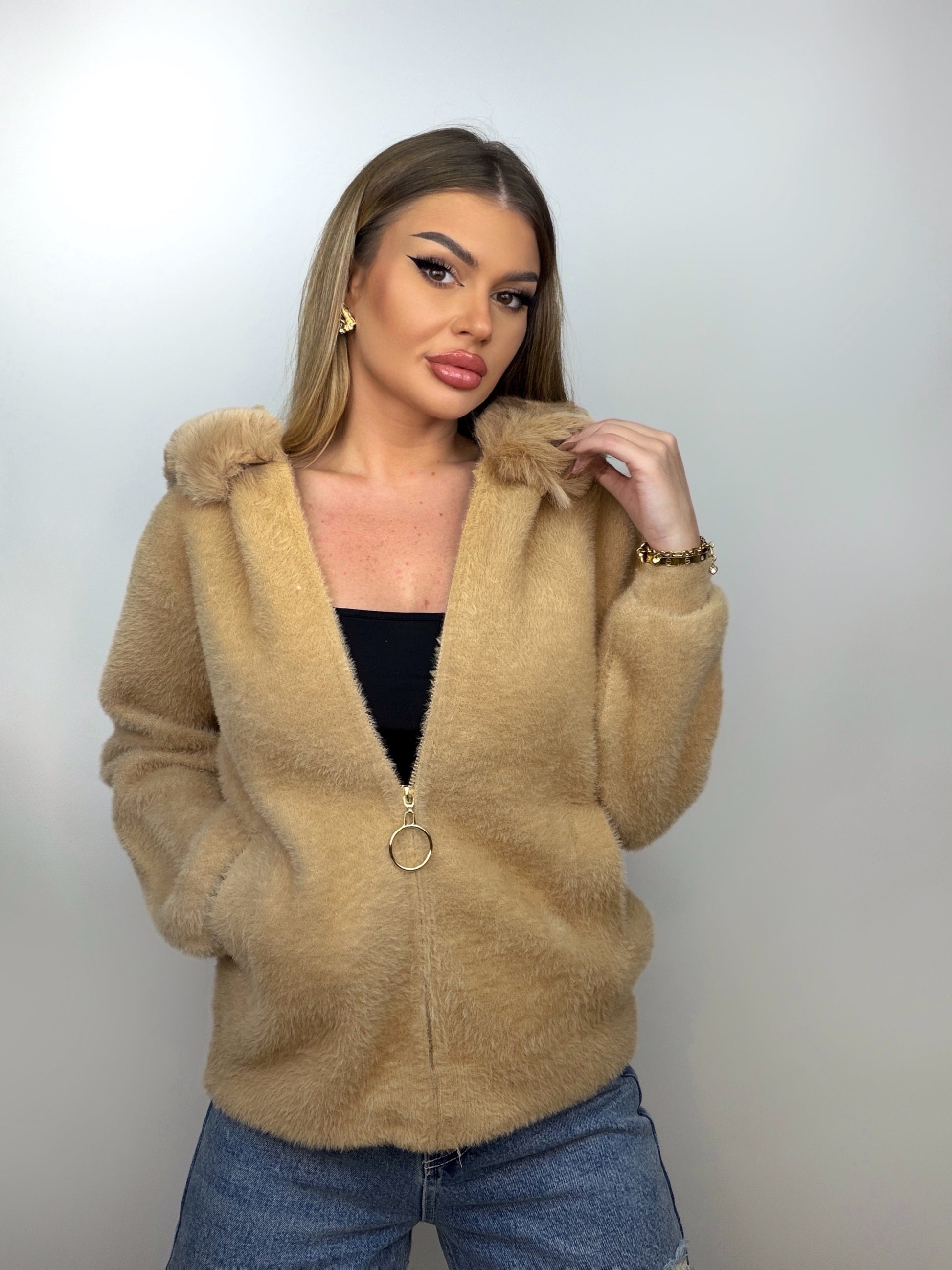 Jachetă bej, realizată dintr-un material foarte pufos, elastic și extrem de confortabil, cu croială largă pentru un look relaxat. Are blăniță scurtă și delicată, închidere cu fermoar și glugă cu blăniță detașabilă, ideală pentru zilele răcoroase. O piesă cozy și versatilă, perfectă pentru un stil casual cu accente moderne.
