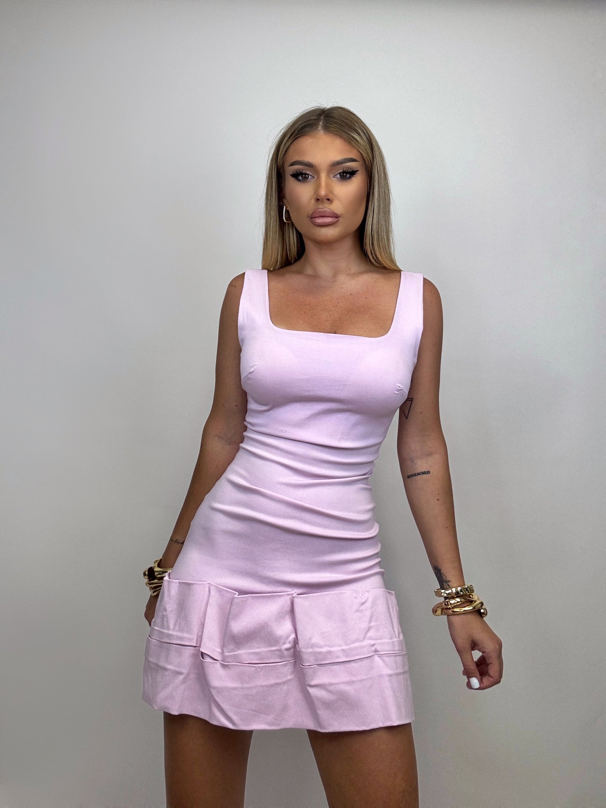 O rochie lila fermecătoare, scurtă și mulată, confecționată dintr-un material elastic care îmbrățișează frumos formele corpului. Cupele integrate oferă susținere delicată și contur, evidențiind frumusețea și eleganța bustului. Terminația rochiei adaugă un touch aparte, poate fi o volanță subtilă, o cusătură rafinată sau un detaliu inedit, conferindu-i un aspect unic și atrăgător. Această rochie lila este perfectă pentru a te face remarcată în orice ocazie specială, oferind confort și stil în același timp.