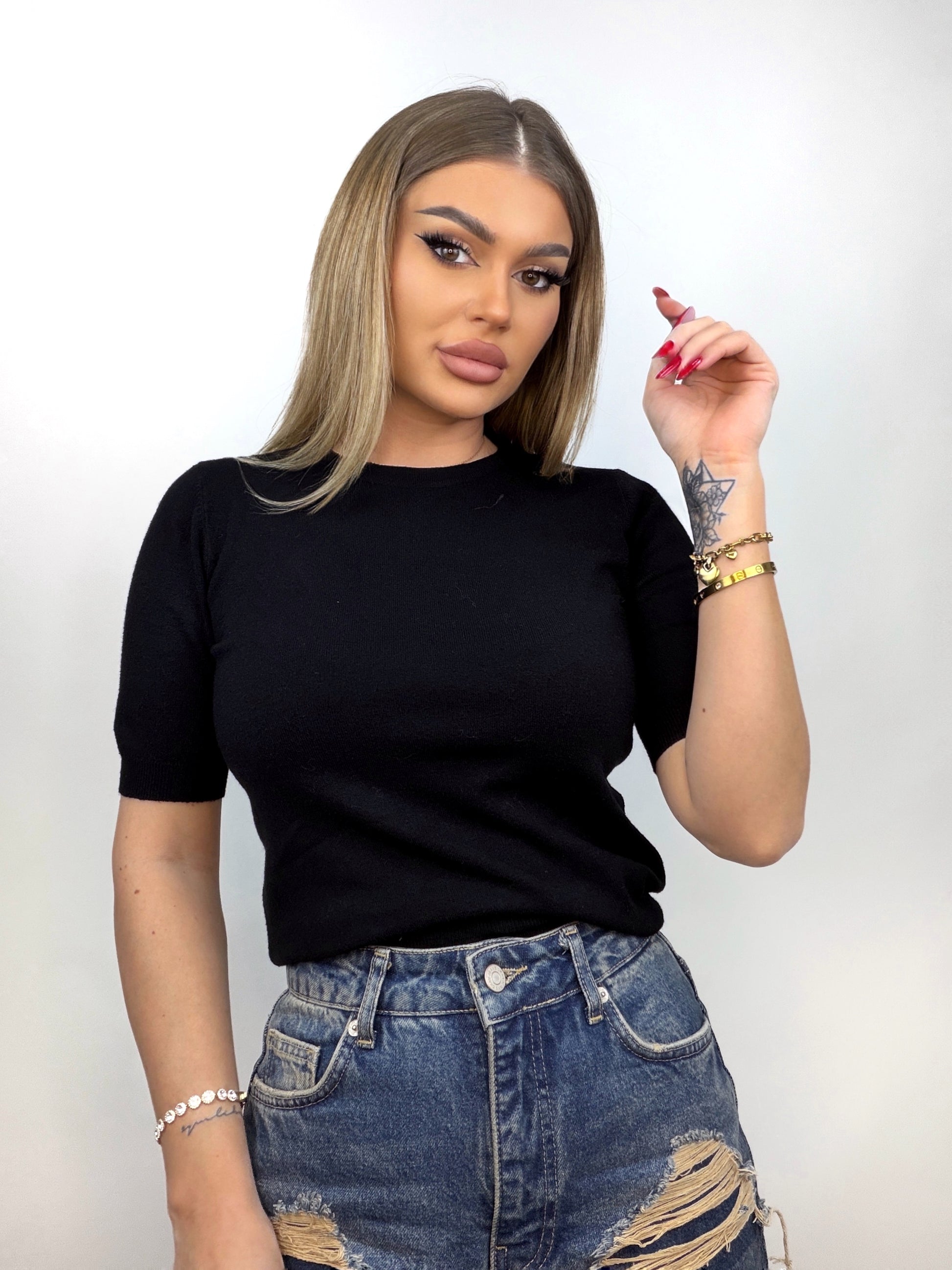 Tricou negru din tricot subțire, lejer și delicat, care se așază natural pe corp. Materialul fin îi conferă confort și respirabilitate, iar croiala simplă îl transformă într-o piesă versatilă, ușor de integrat în ținute casual sau elegante în layering.
