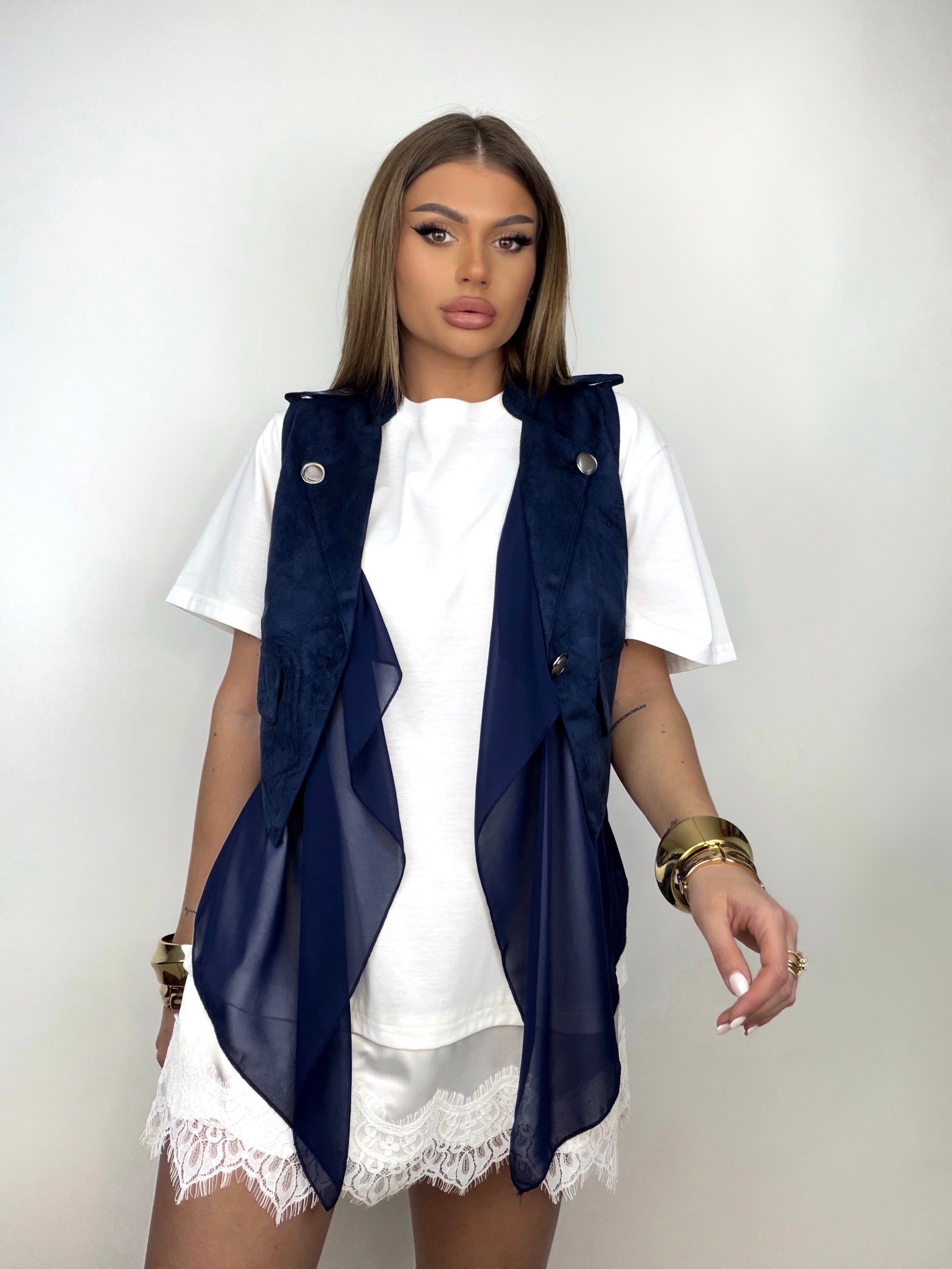 Vestă în nuanță de albastru închis, cu un design modern și distinct, creat prin combinația ingenioasă de materiale cu texturi diferite și inserții elastice. Croiala atent gândită oferă confort și libertate de mișcare, transformând piesa într-un item versatil, cu un aer contemporan și sofisticat.